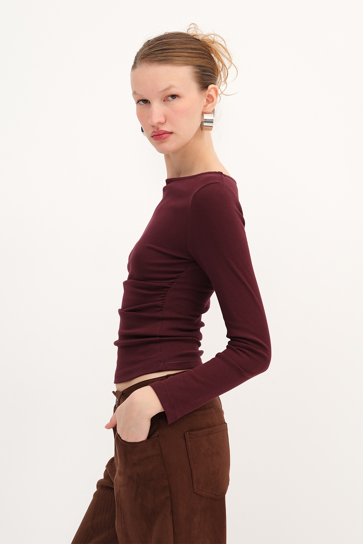 * Bisiklet yaka, uzun kollu,* Yanı büzgülü, düz renk,* Vücudu saran bluz,* Ürün içeriği: %95 Pamuk %5 Elastan,* Manken üzerindeki ürün 36/S bedendir.* Numune Beden Ölçüleri: Boy: 50 cm Göğüs: 60 cm Kol Boyu: 52 cm (1-3 cm arasında değişiklik gösterebilir)* Ürün çekimlerinde renkler, ışık farklılığından dolayı değişkenlik gösterebilir.
