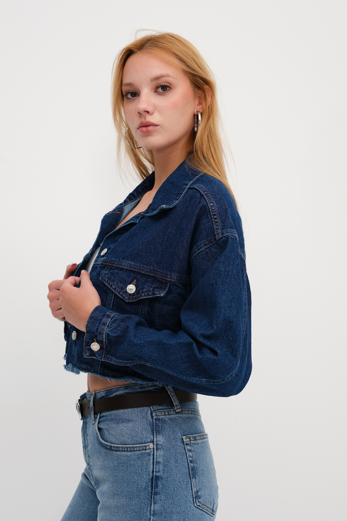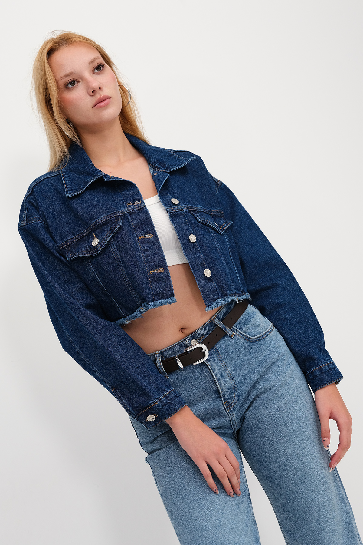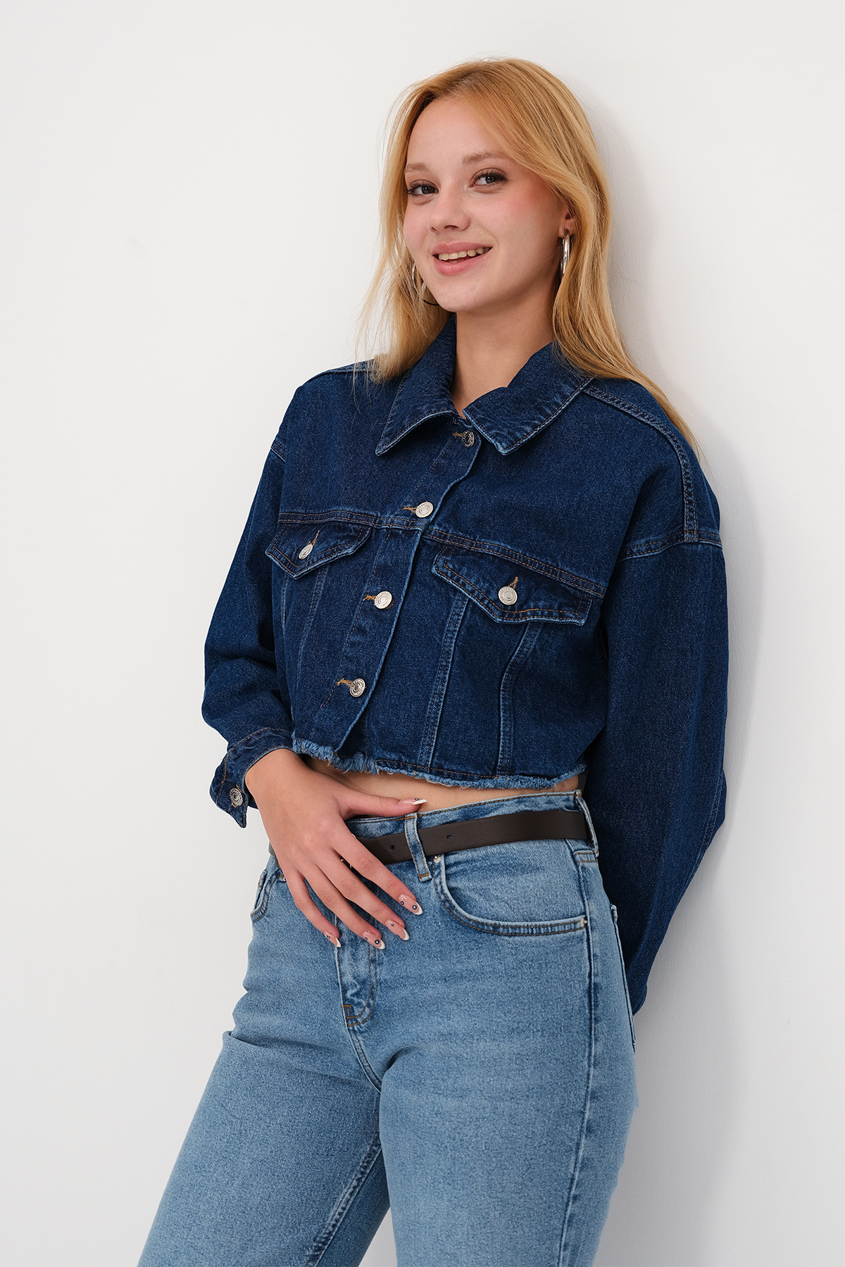 * Metal düğmeli, püsküllü, crop kot ceket,
