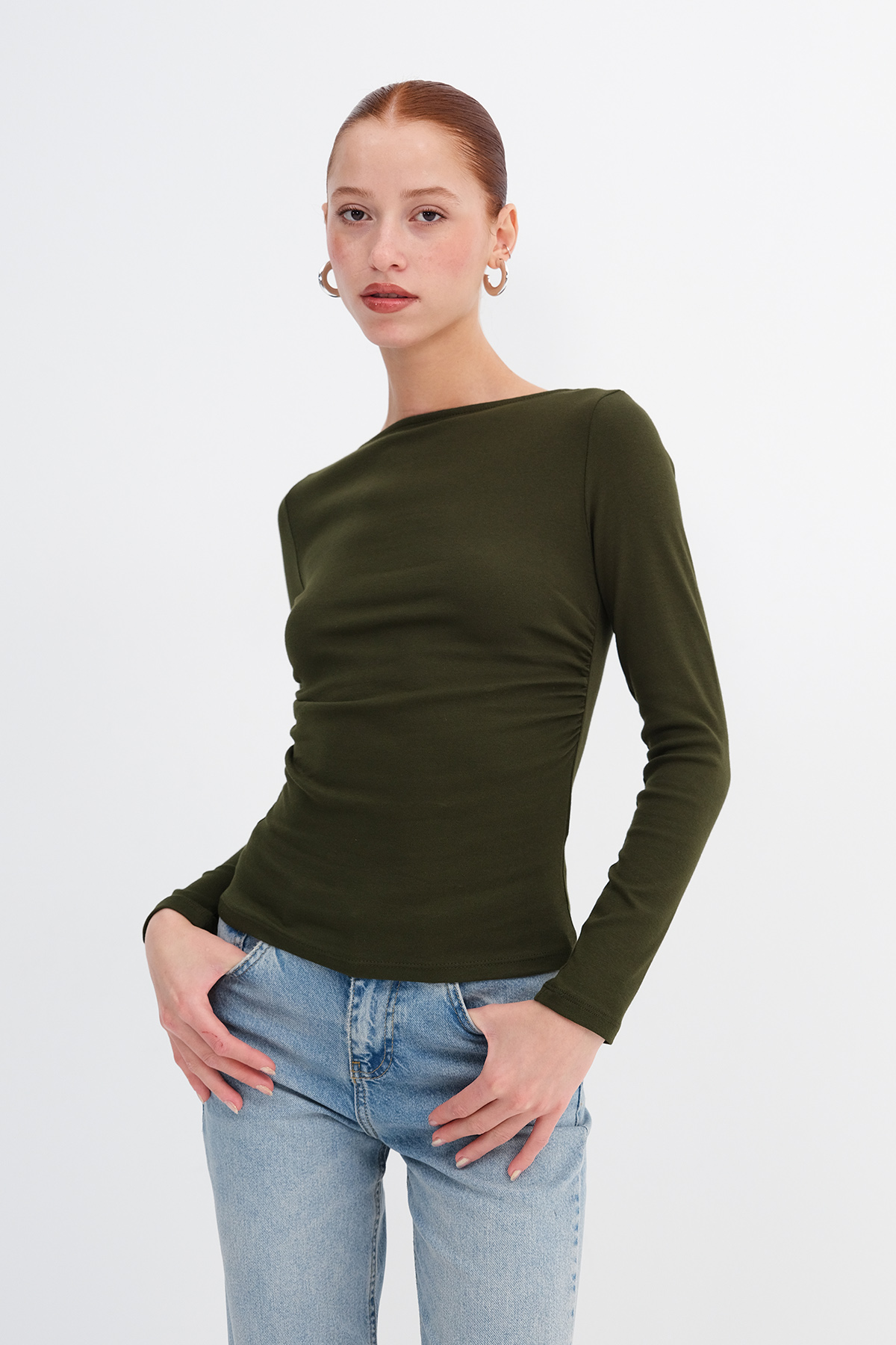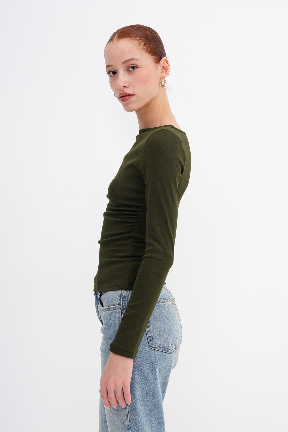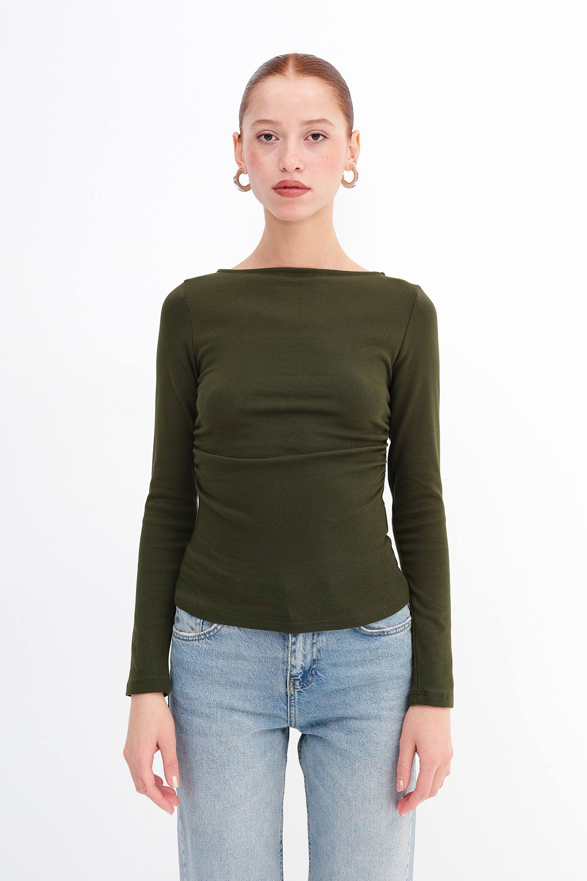 * Yanı büzgülü, düz renk, vücudu saran bluz,