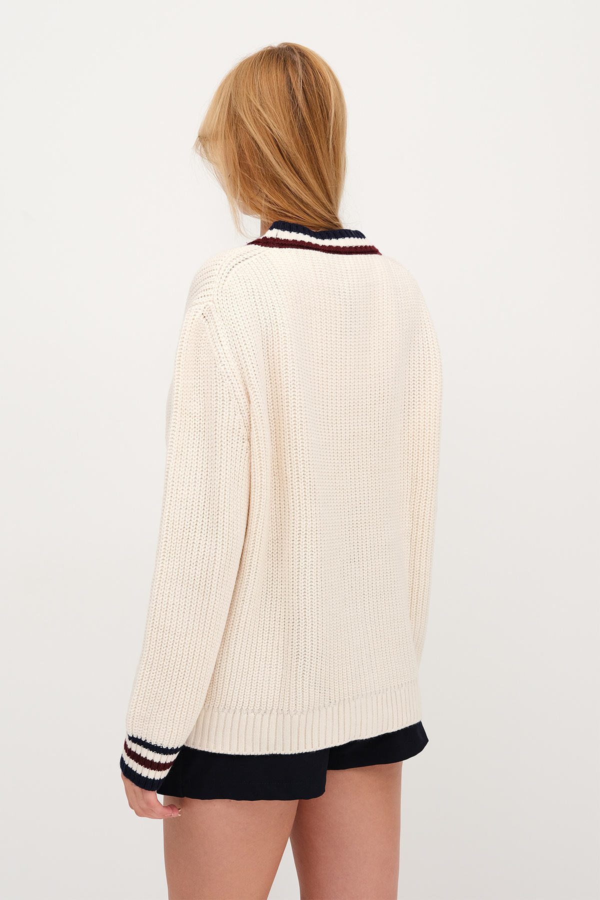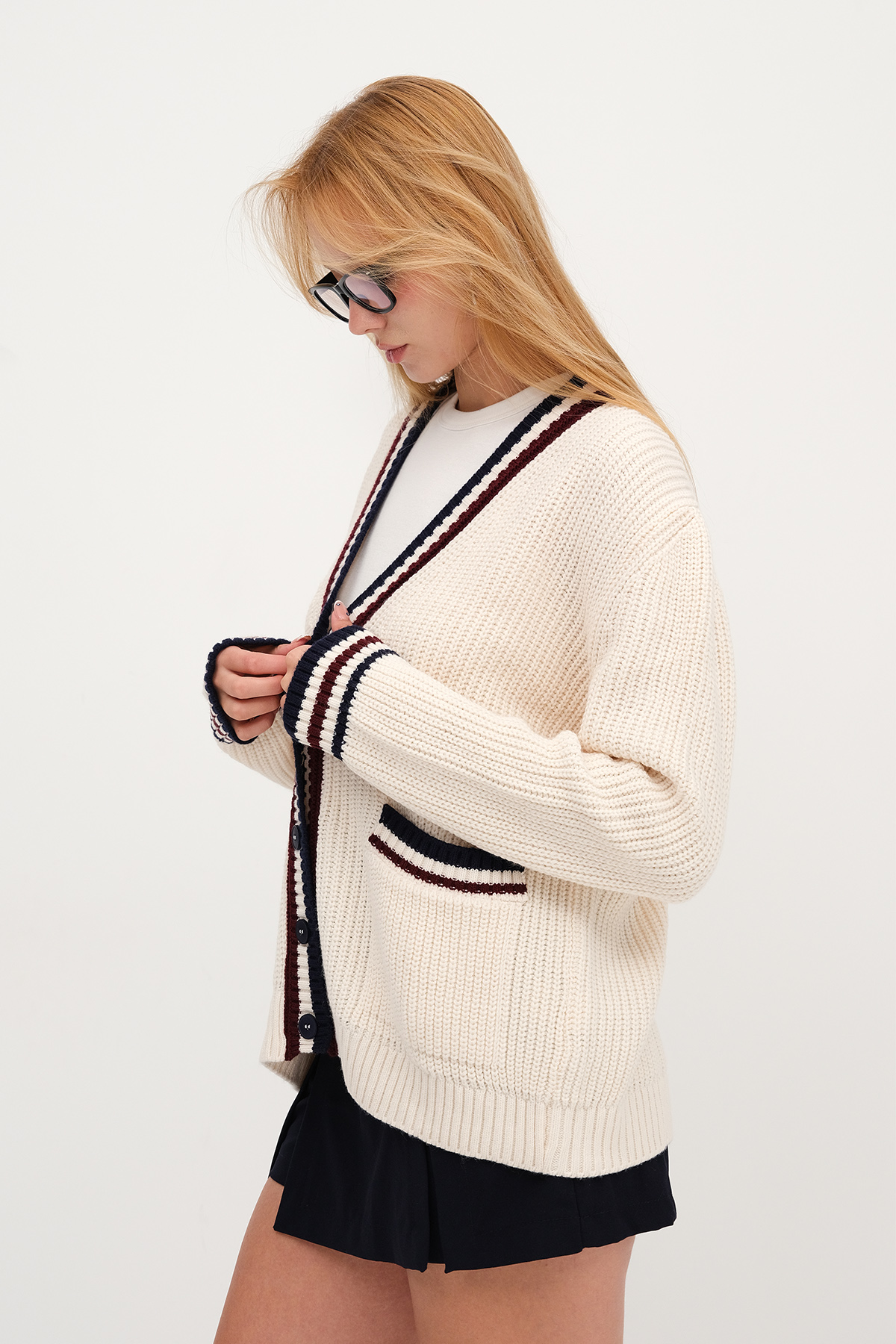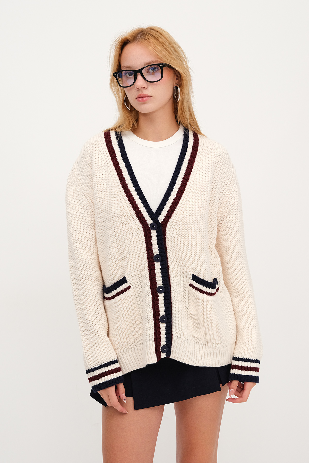 * V yaka, uzun kollu, düğmeli, düşük omuz, çift cepli,