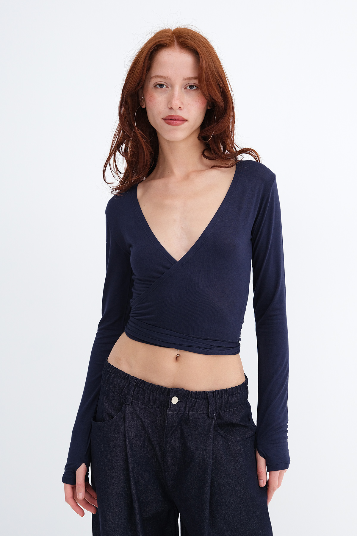 * V yaka, uzun kollu, parmak geçirmeli,