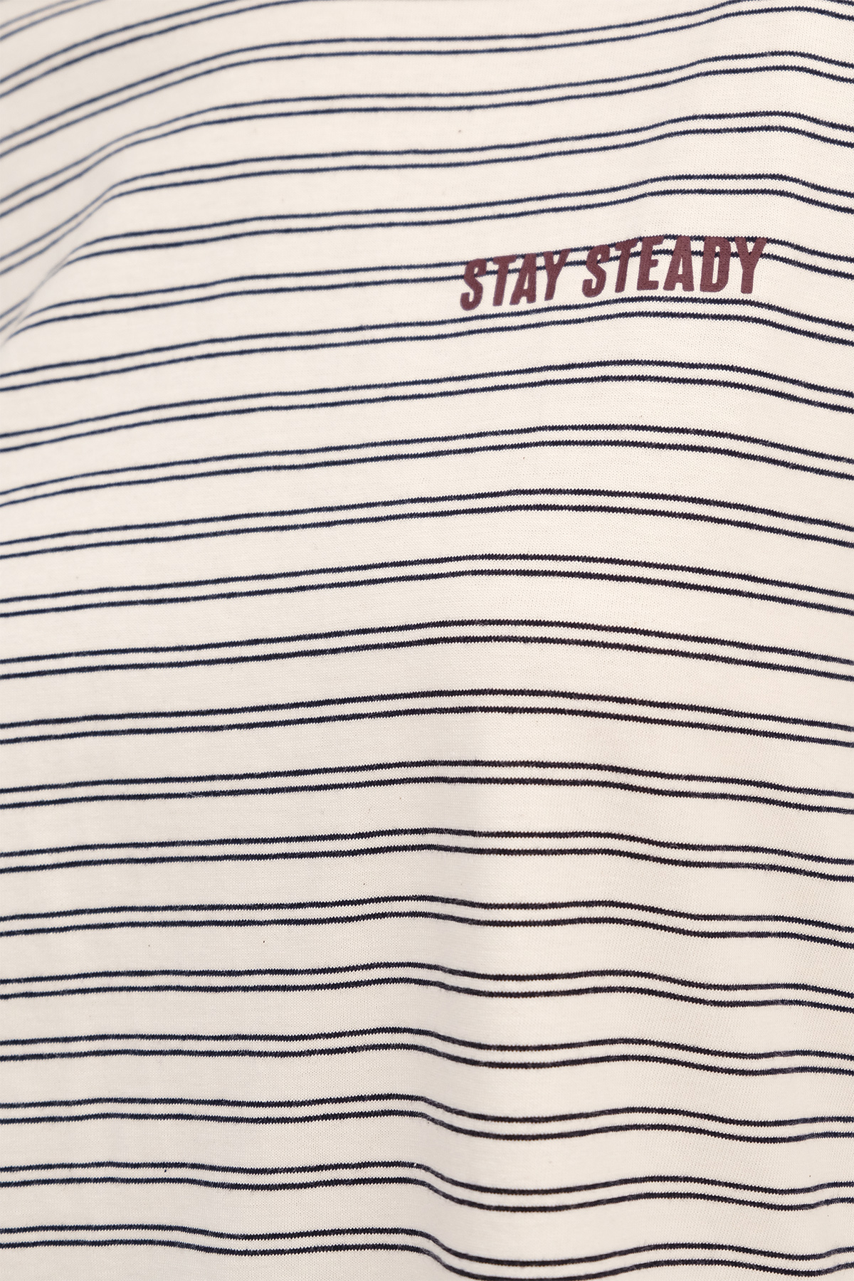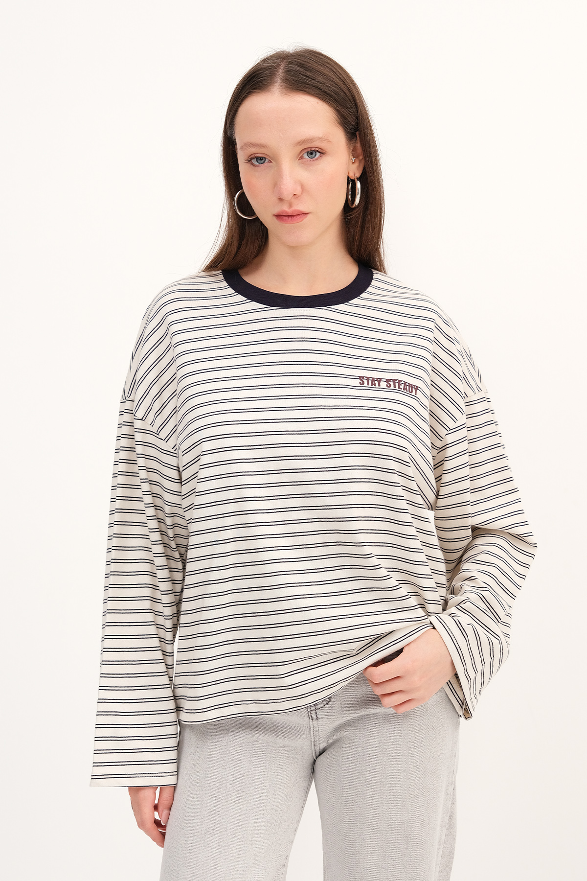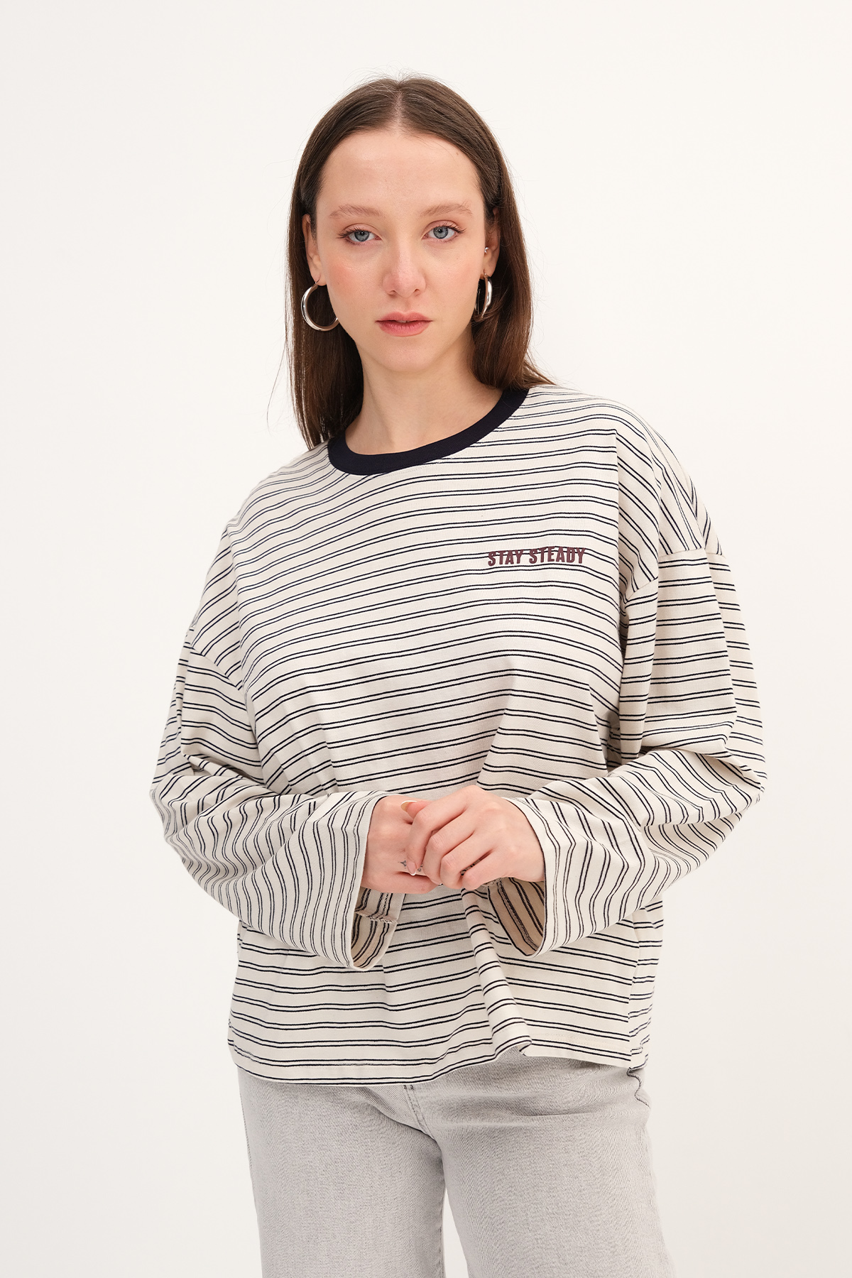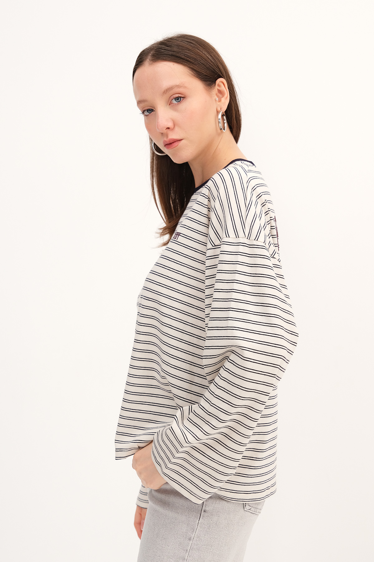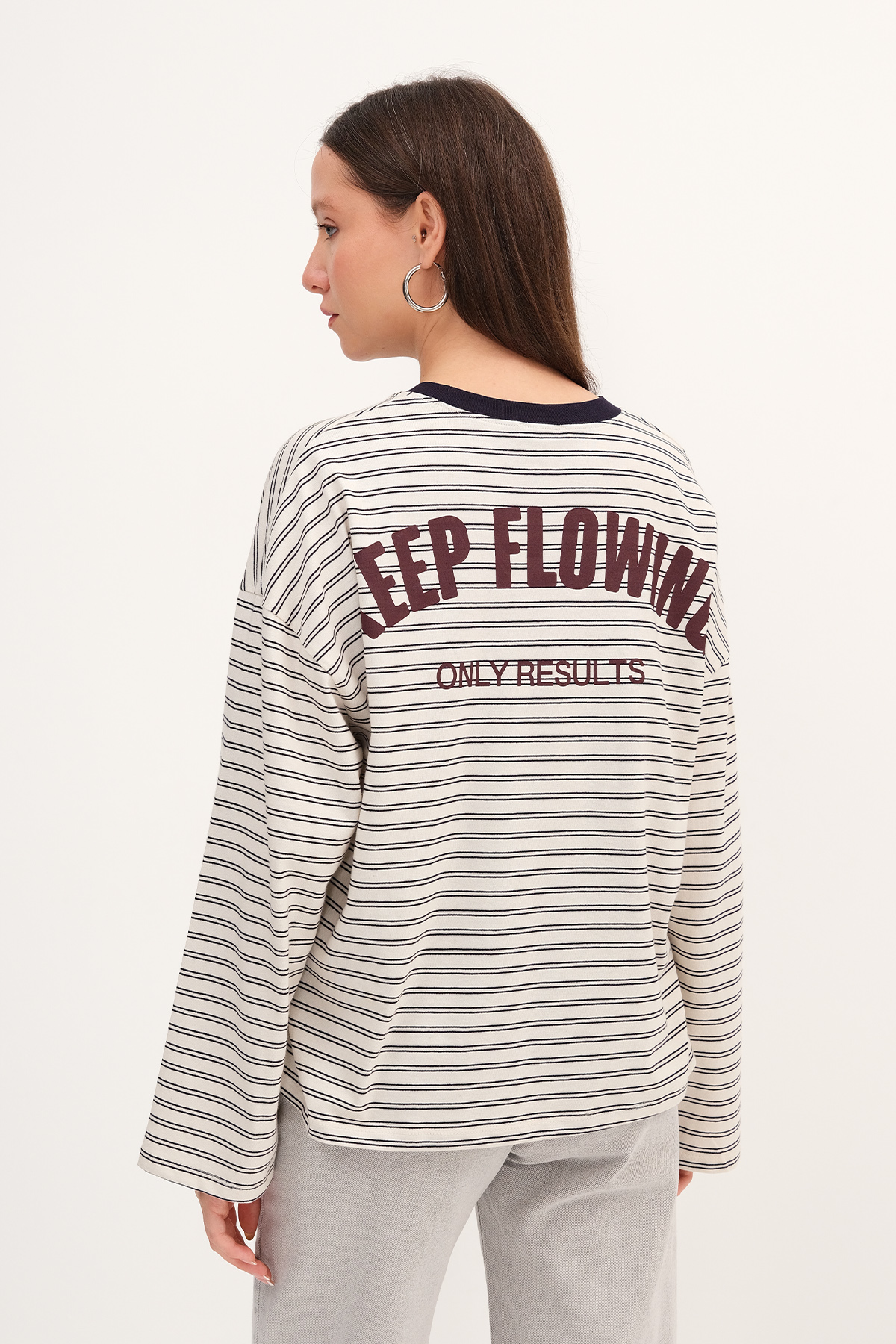 * Bisiklet yaka, uzun kollu, düşük omuz,* Yazı baskılı, rahat kalıp,* Çizgili t-shirt,* Ürün içeriği: %100 Pamuk* Manken üzerindeki ürün 36/S bedendir.* Numune beden ölçüleri: Boy: 59 cm Göğüs: 110 cm Kol boyu: 47 cm (1-3 cm değişiklik gösterebilir)* Ürün çekimlerinde renkler, ışık farklılığından dolayı değişkenlik gösterebilir.
