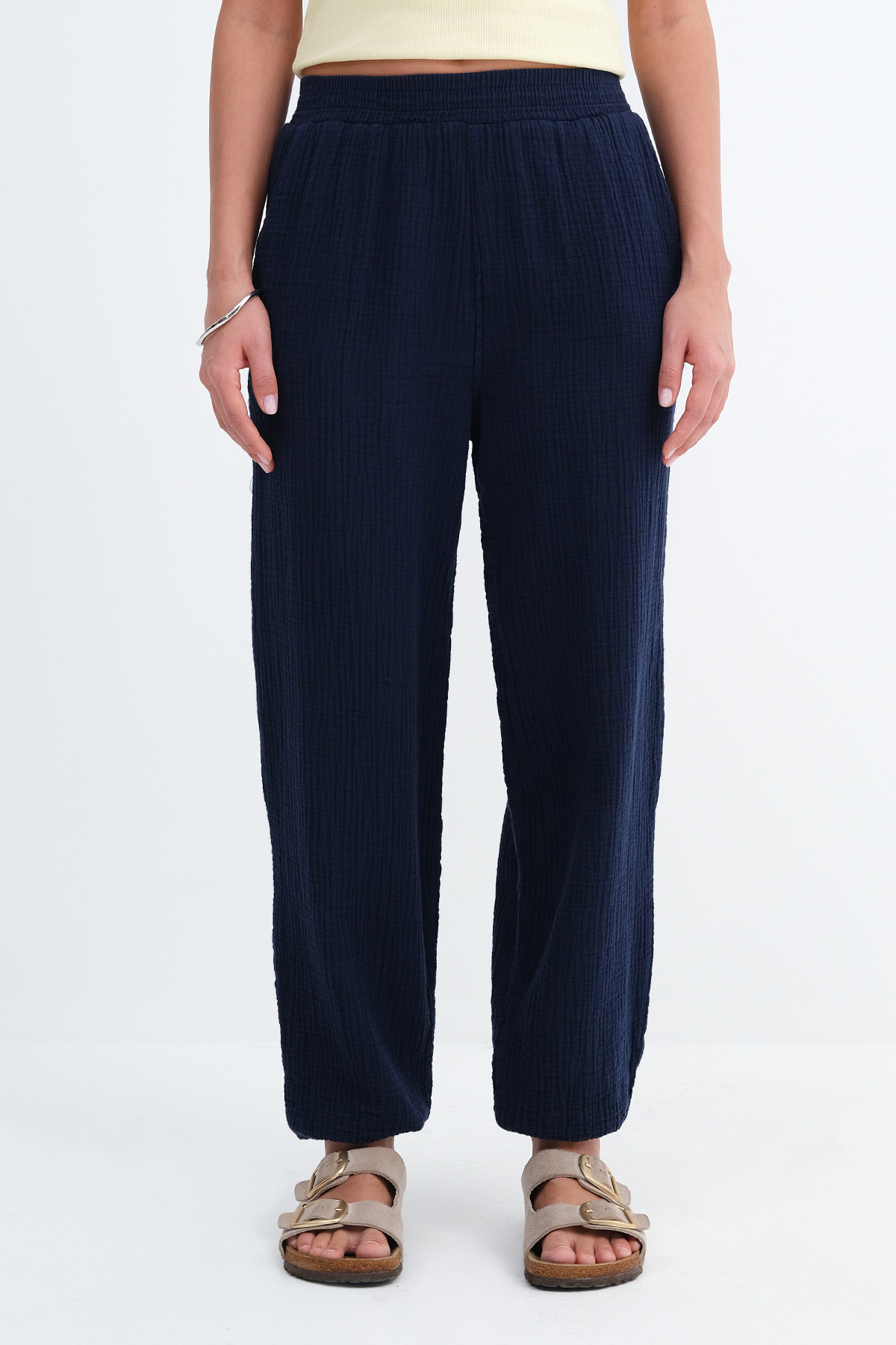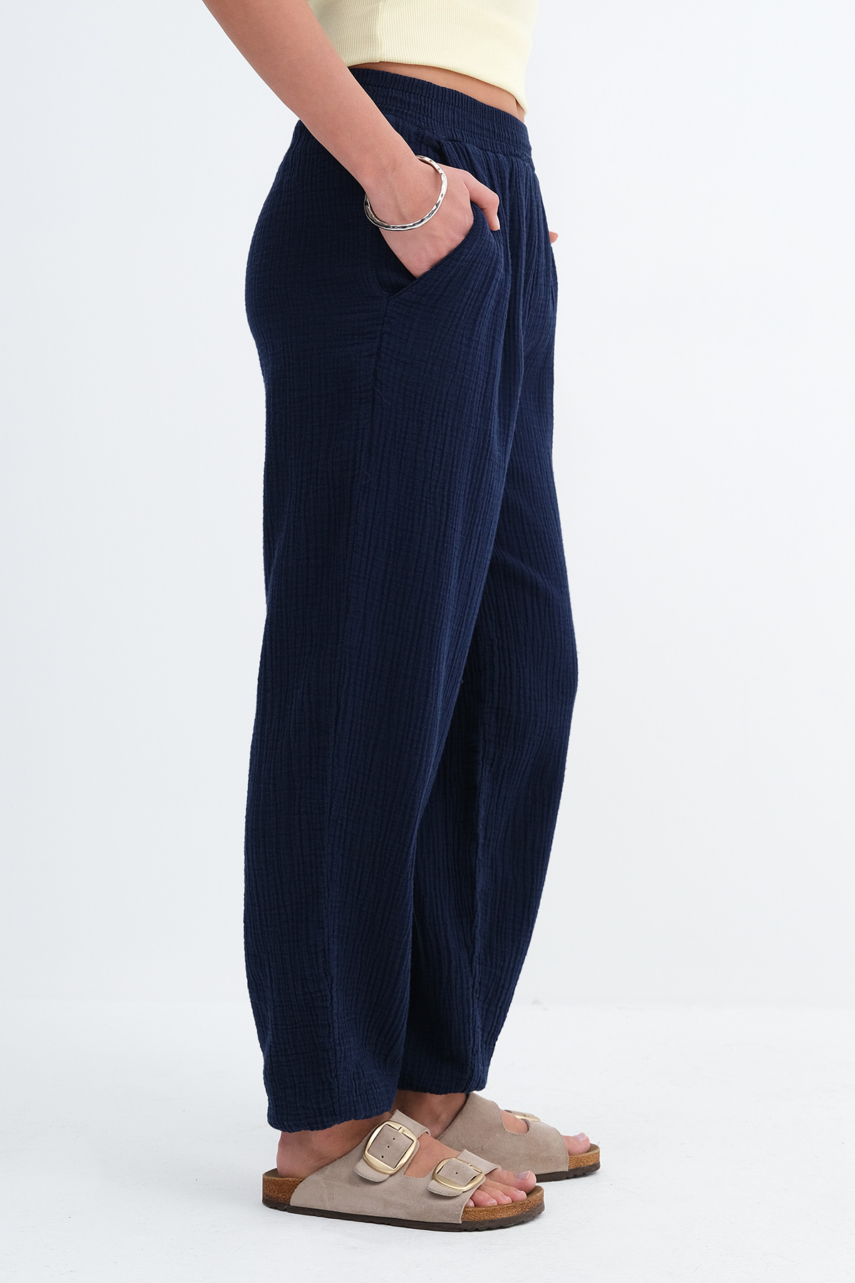 * Beli lastikli, çift cepli,