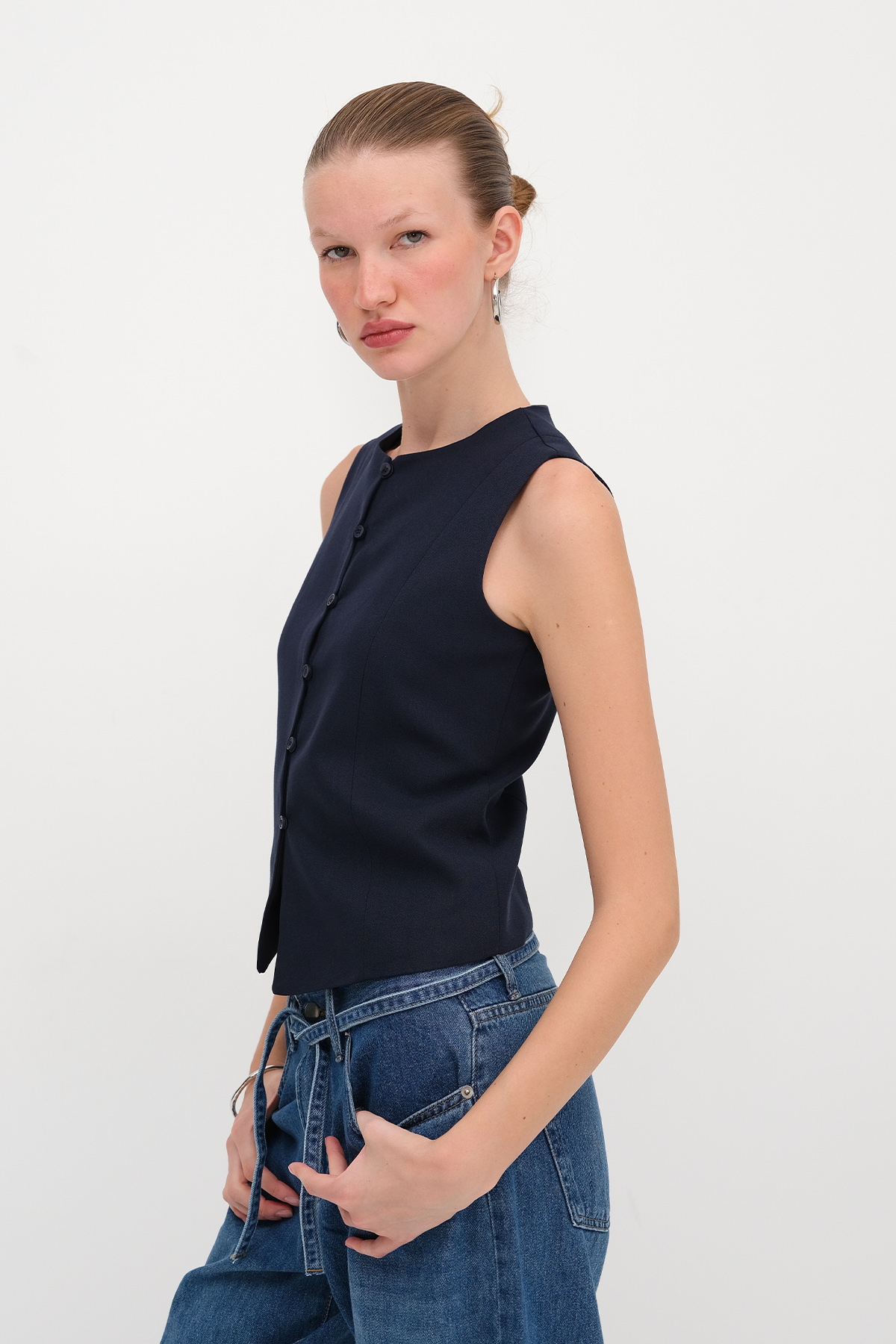 * Bisiklet yaka, kolsuz, düz renk, düğmeli,