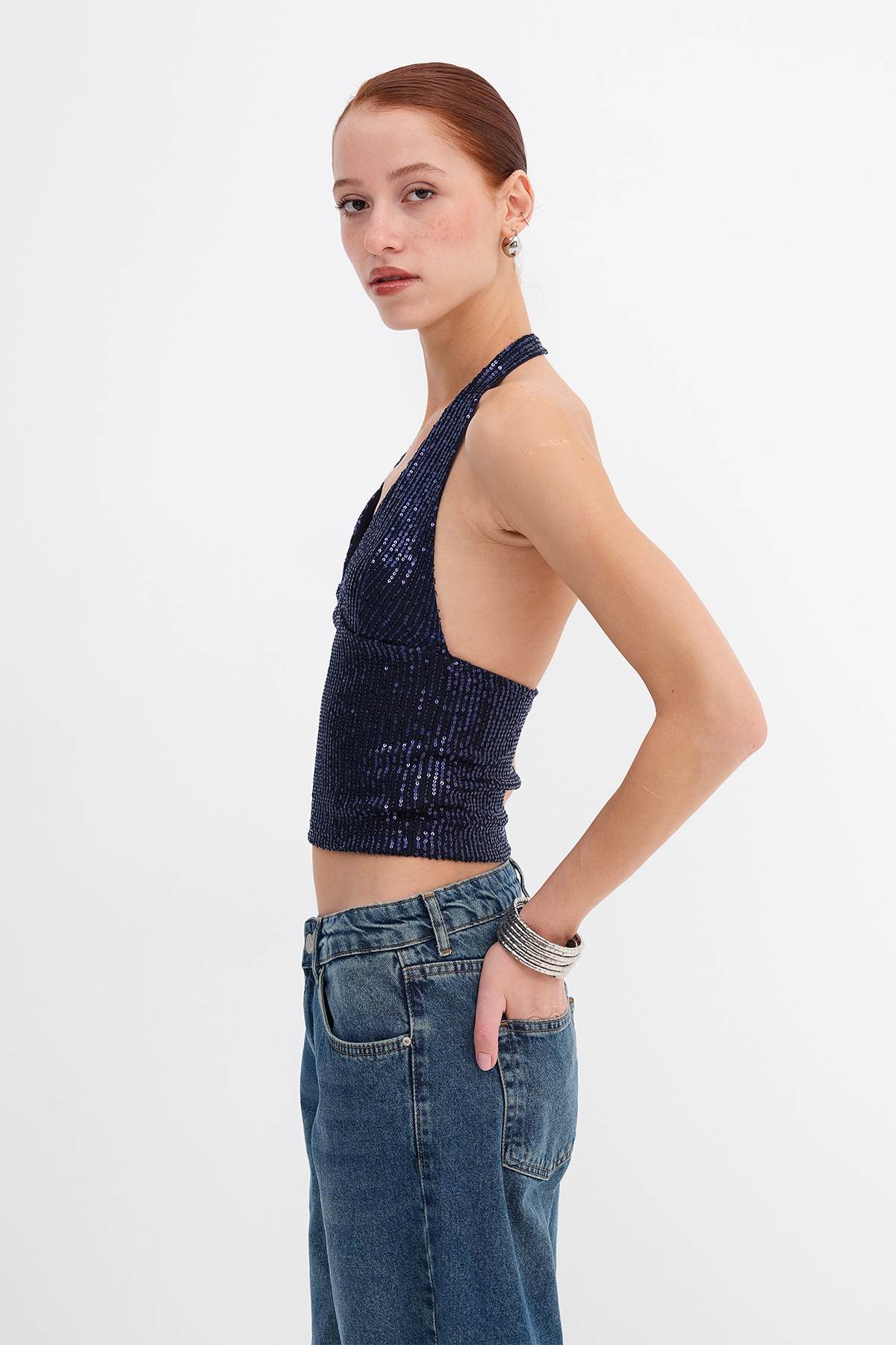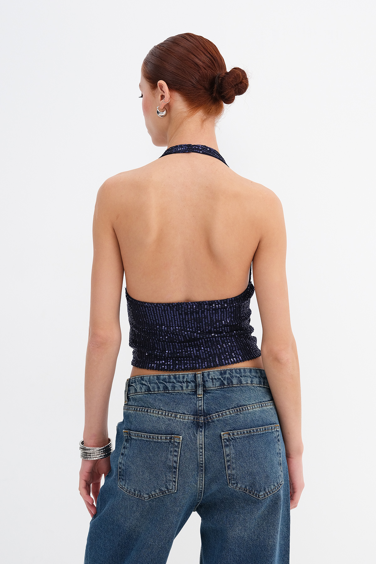 * Payetli, düz renk bluz,