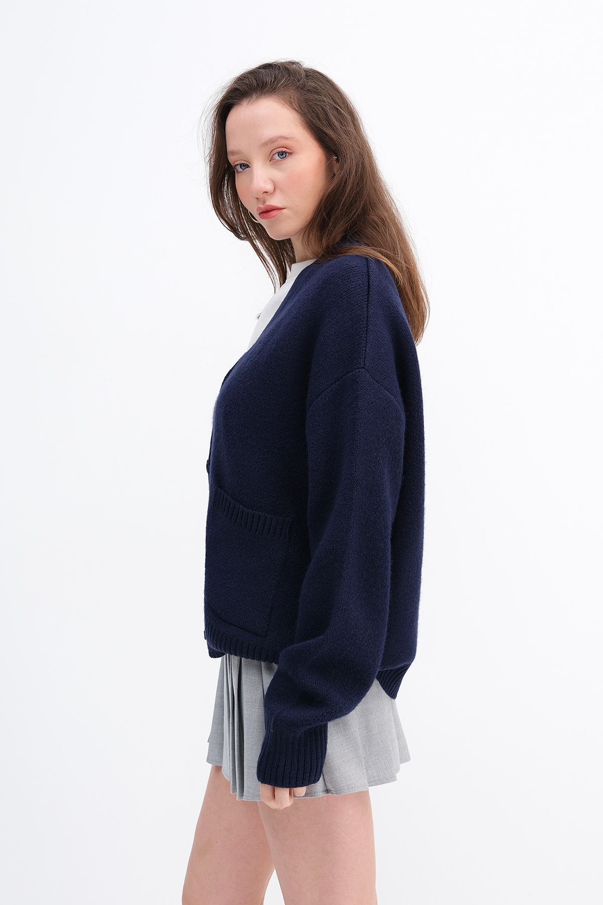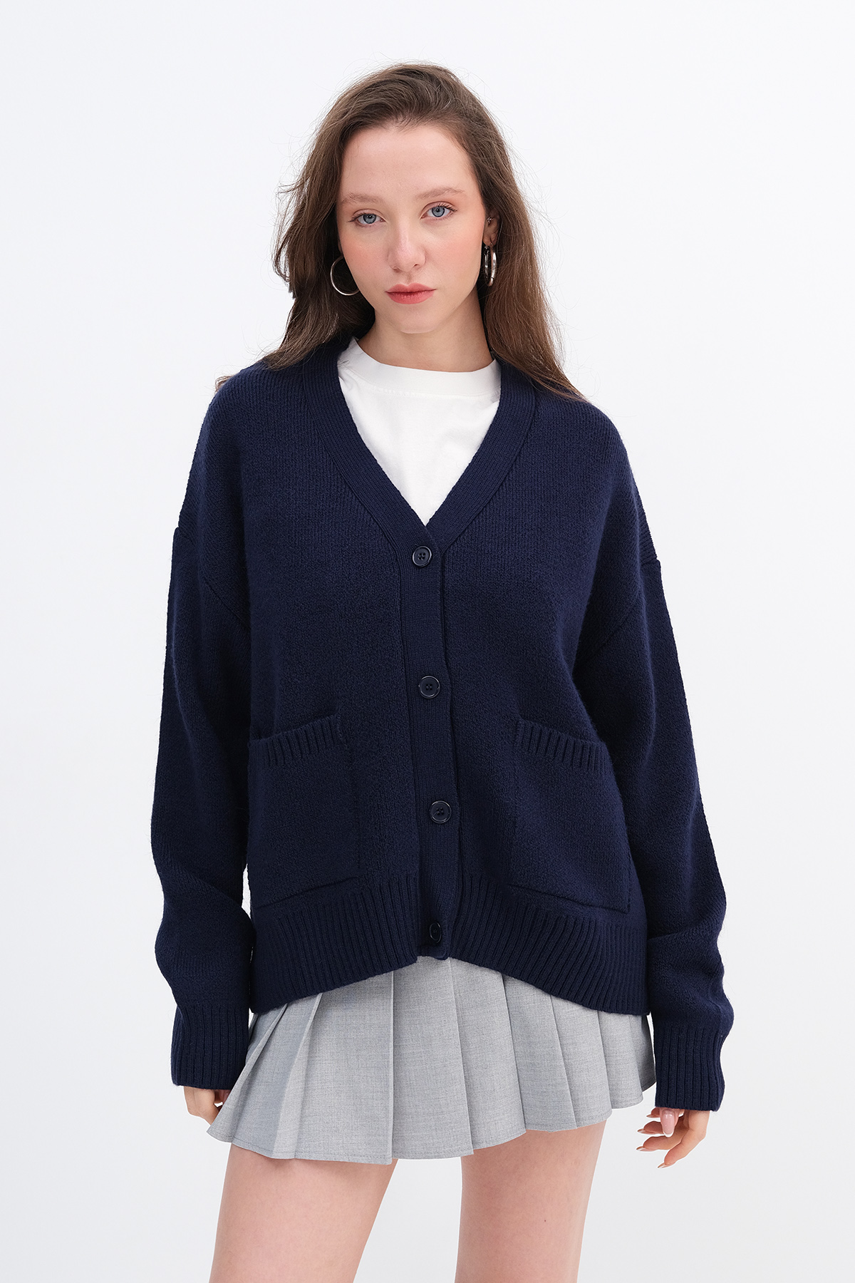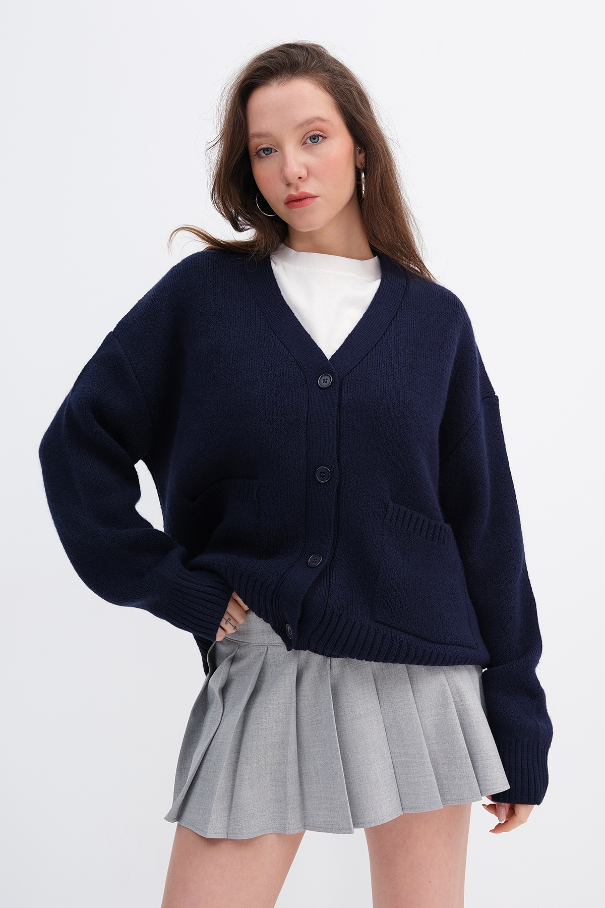 * V yaka, uzun kollu, düşük omuz, düz renk, düğmeli, çift cepli,
