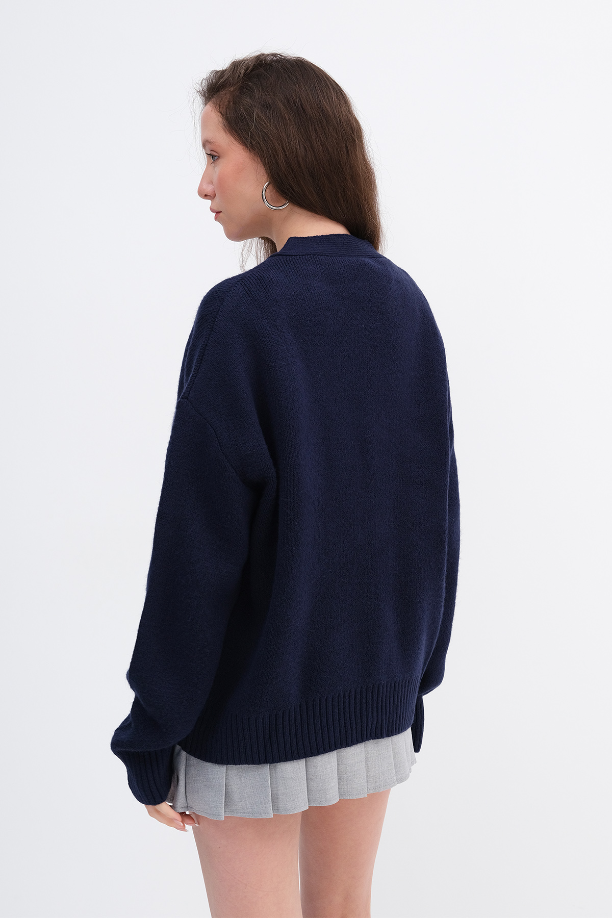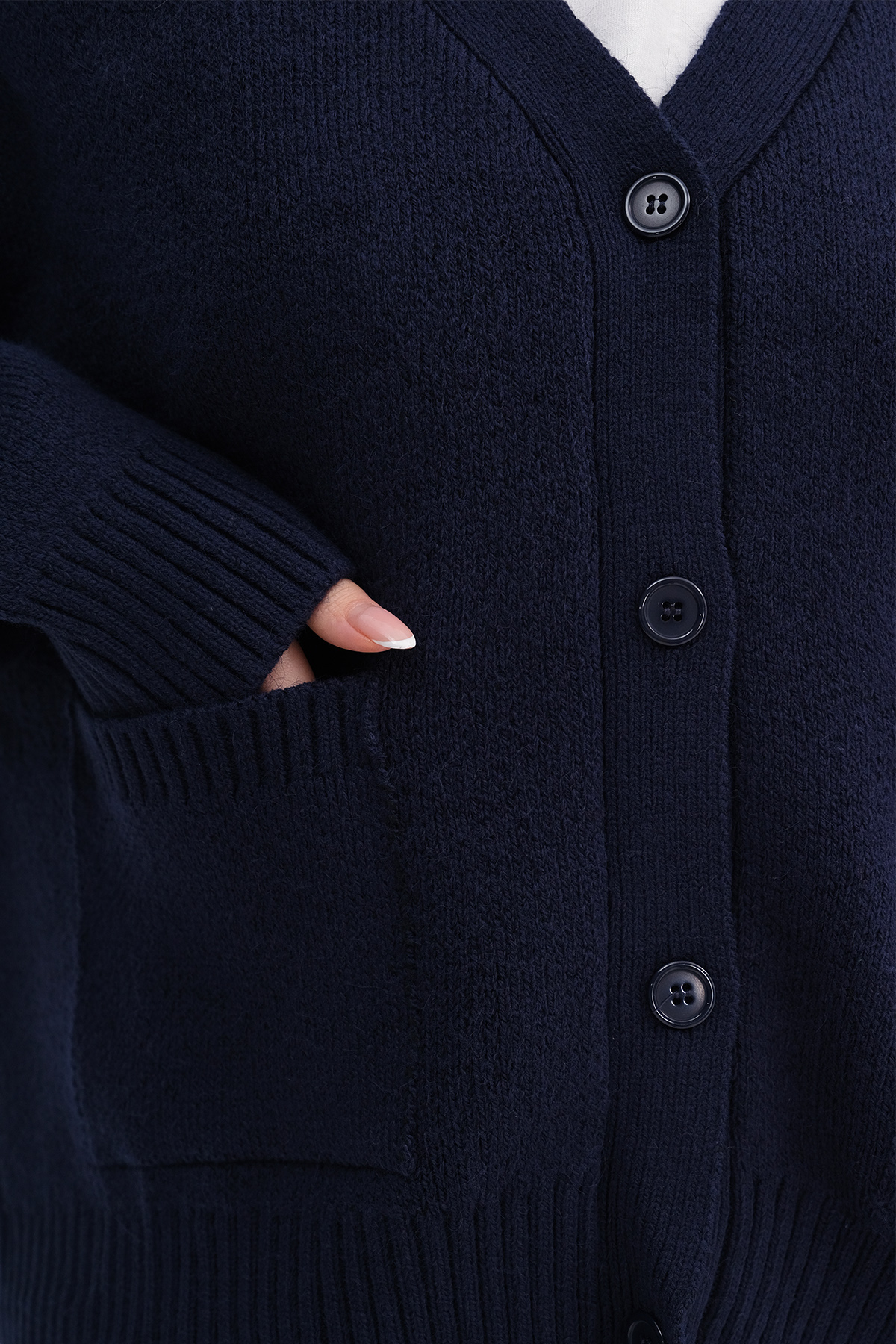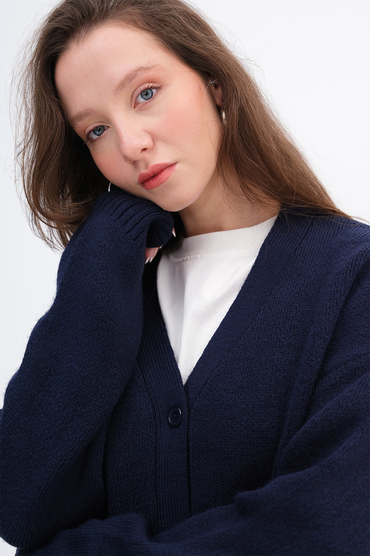 * V yaka, uzun kollu, düşük omuz, düz renk, düğmeli, çift cepli,