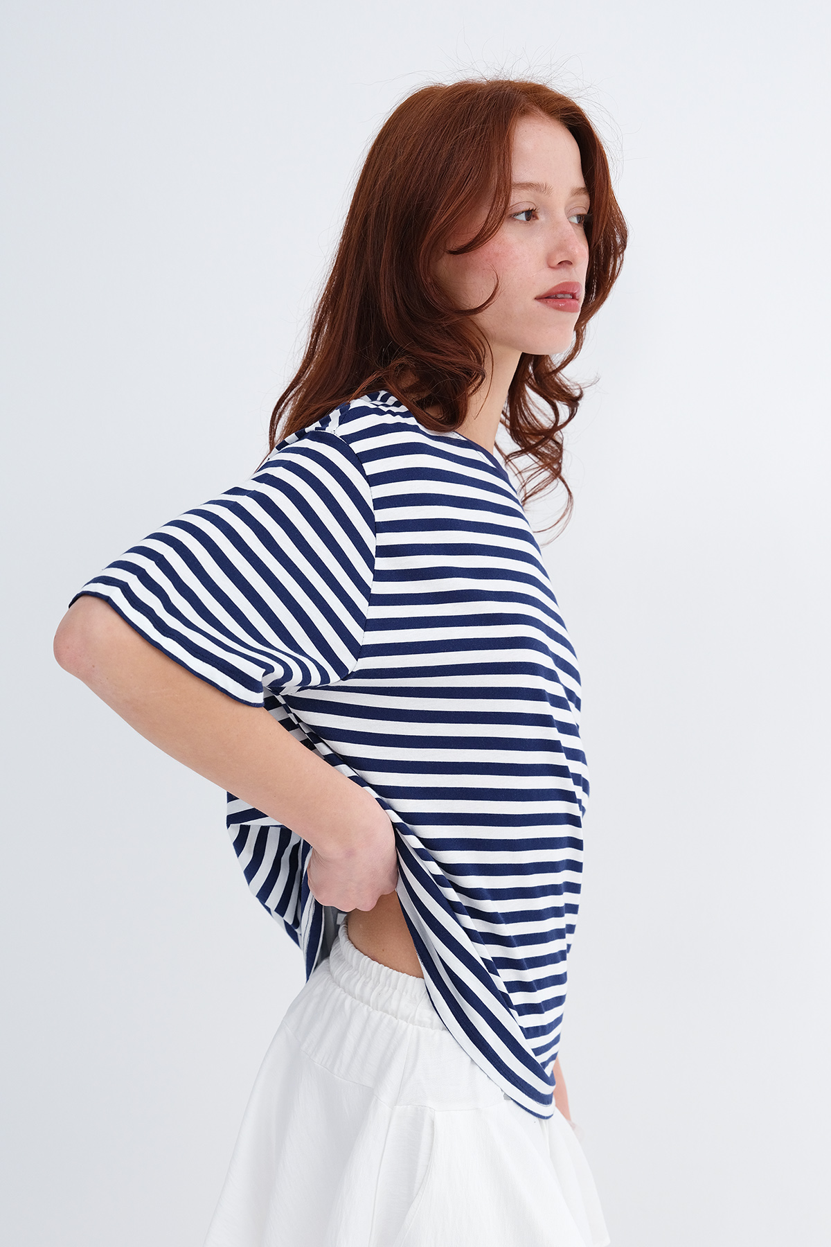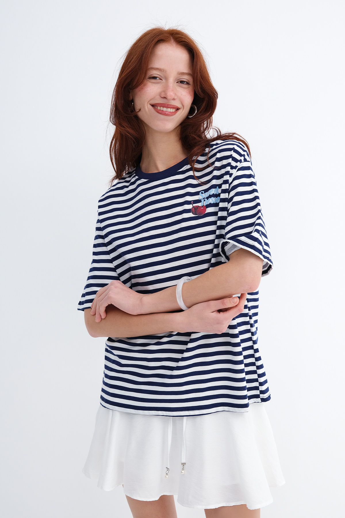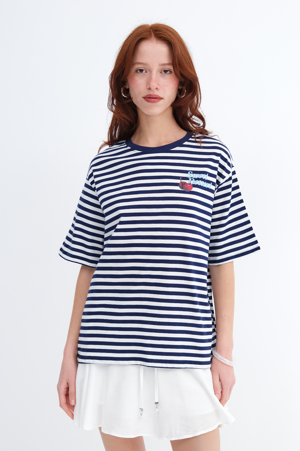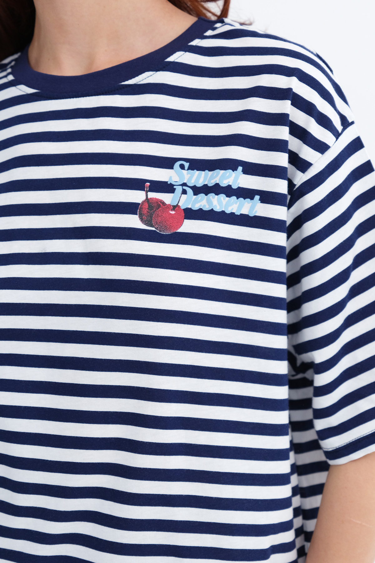 * Çizgili, kirazlı, rahat kalıp t-shirt,