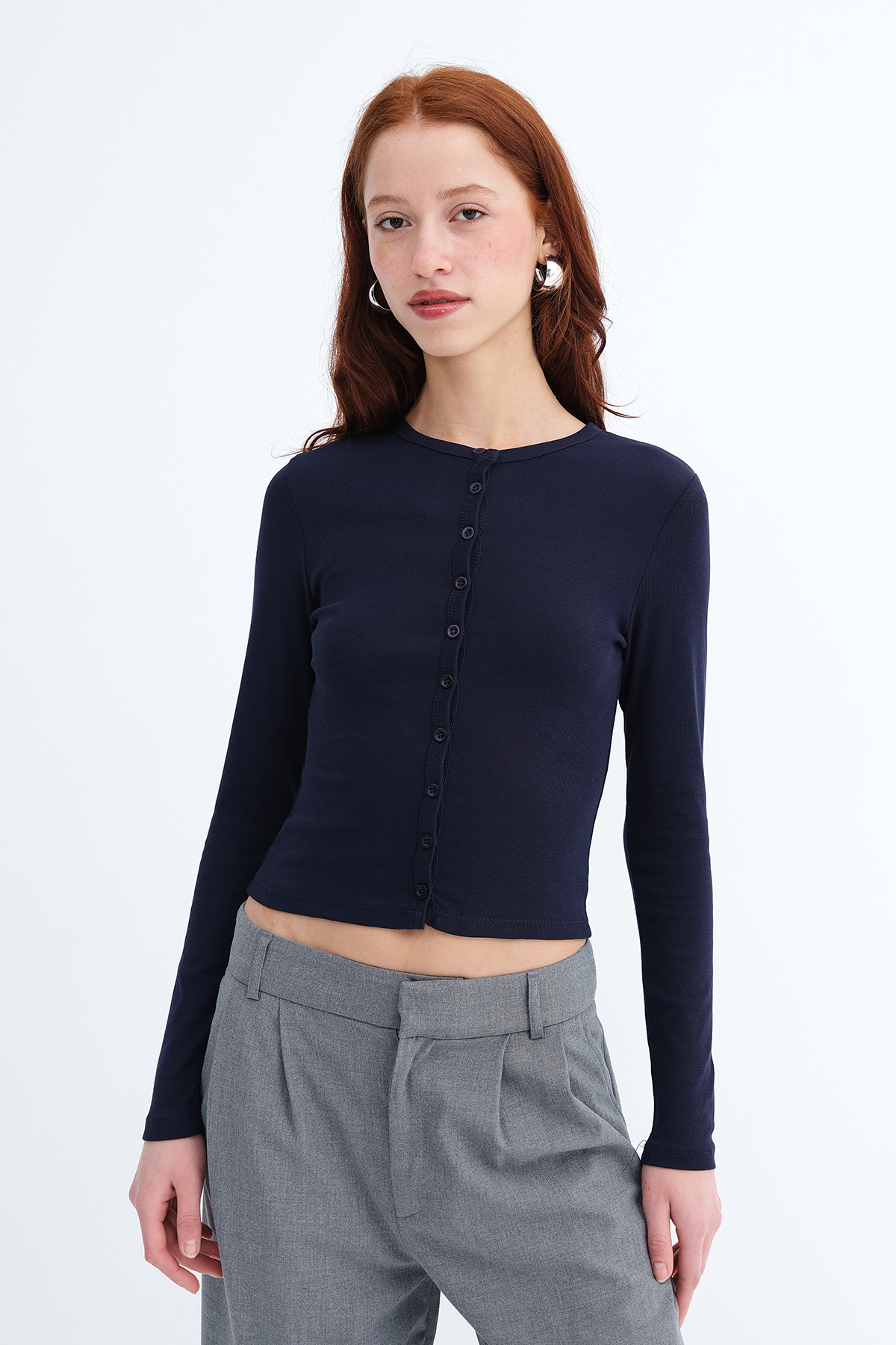 * Düğmeli, düz renk hırka,