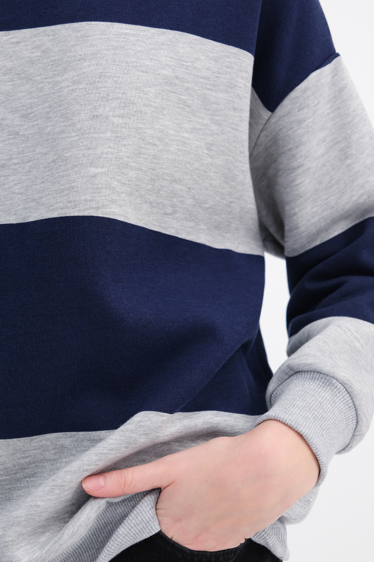 * Kayık yaka, çizgili, şardonlu, manşetleri ve etek ucu lastikli,
