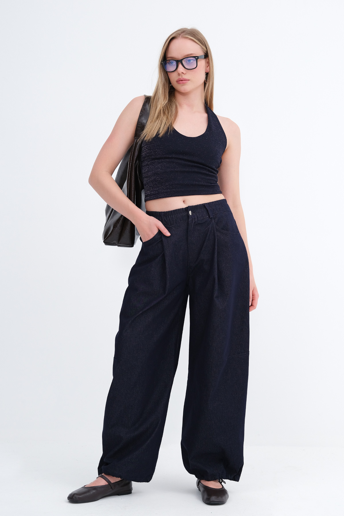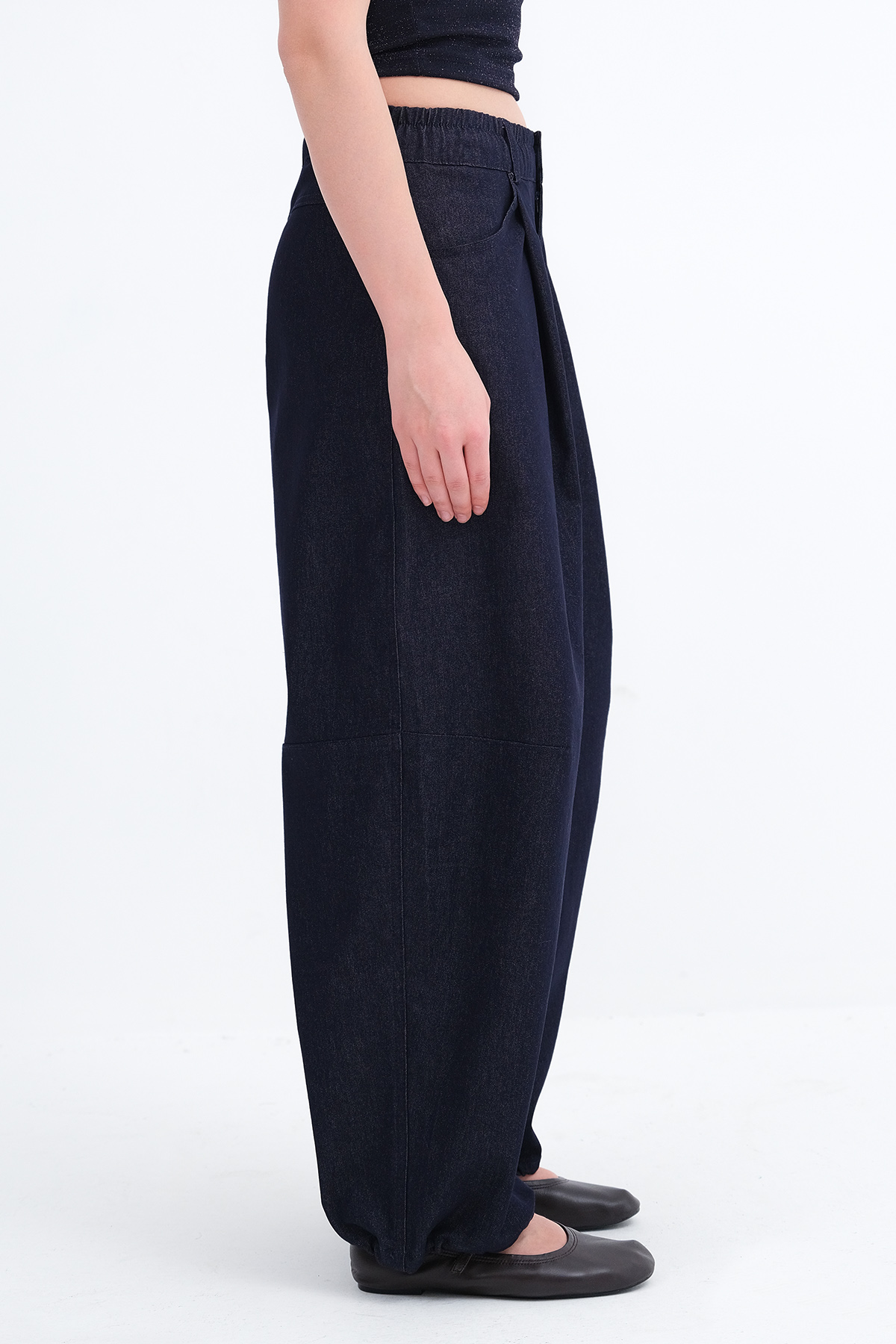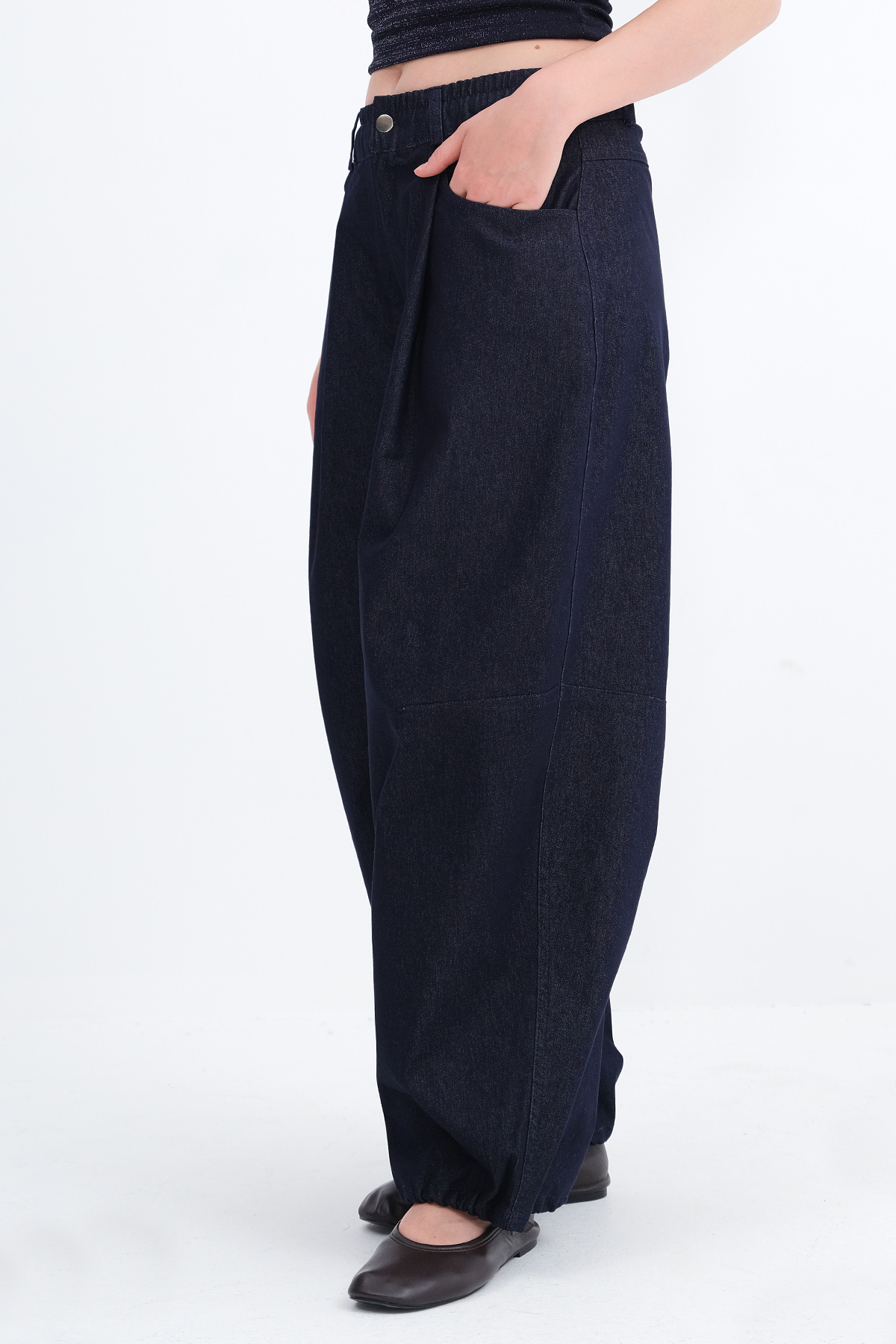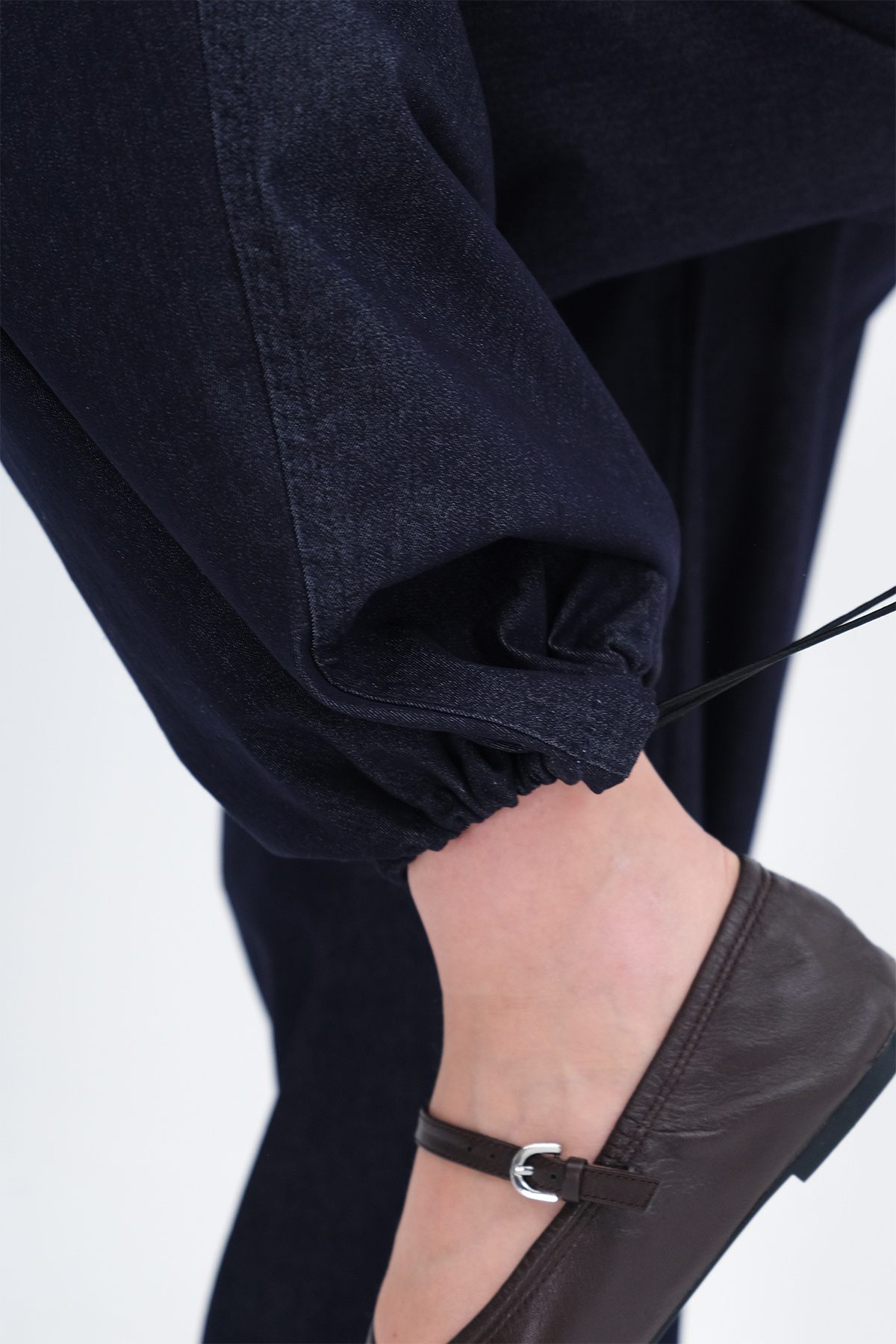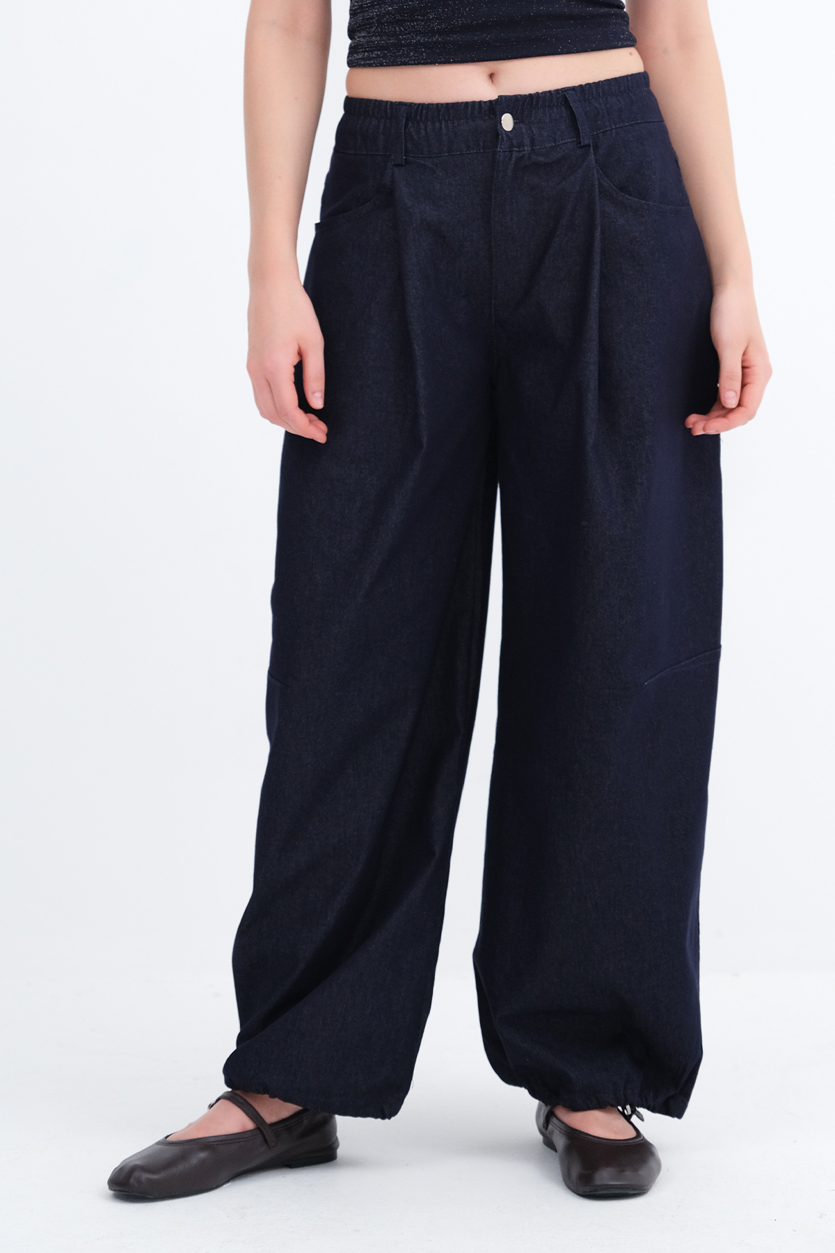 * Paçası lastikli, denim pantolon,