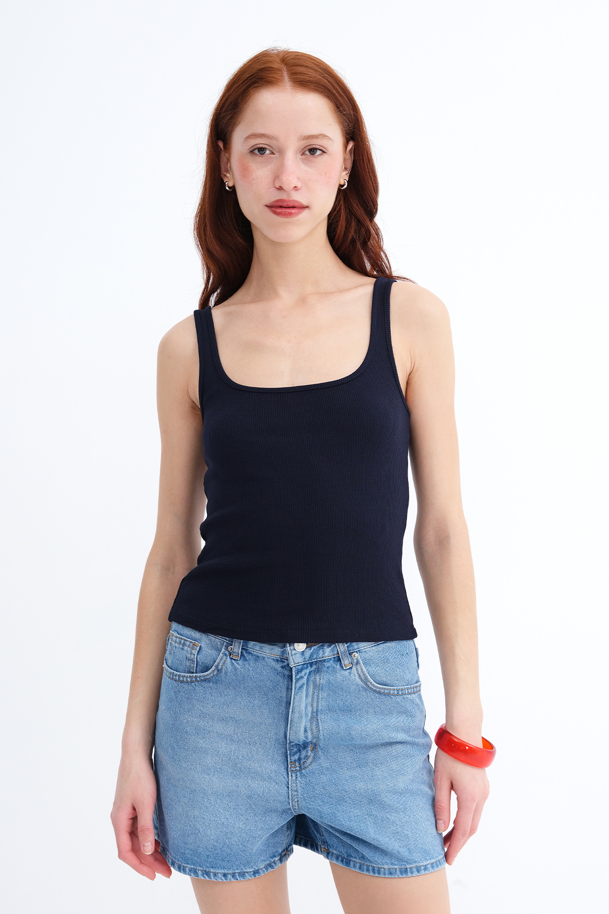 * U yaka, kolsuz, kalın askılı,