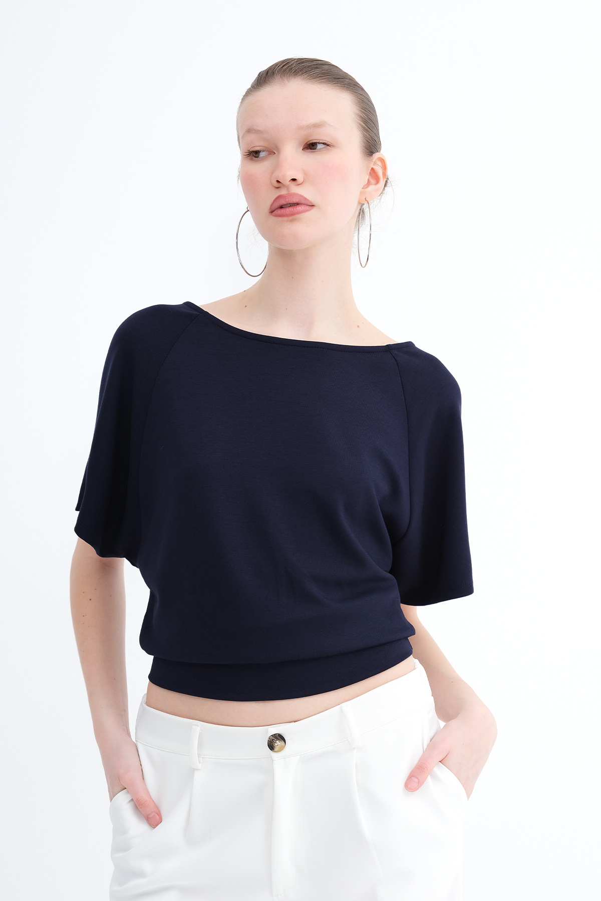 * Kayık yaka, kısa kollu,