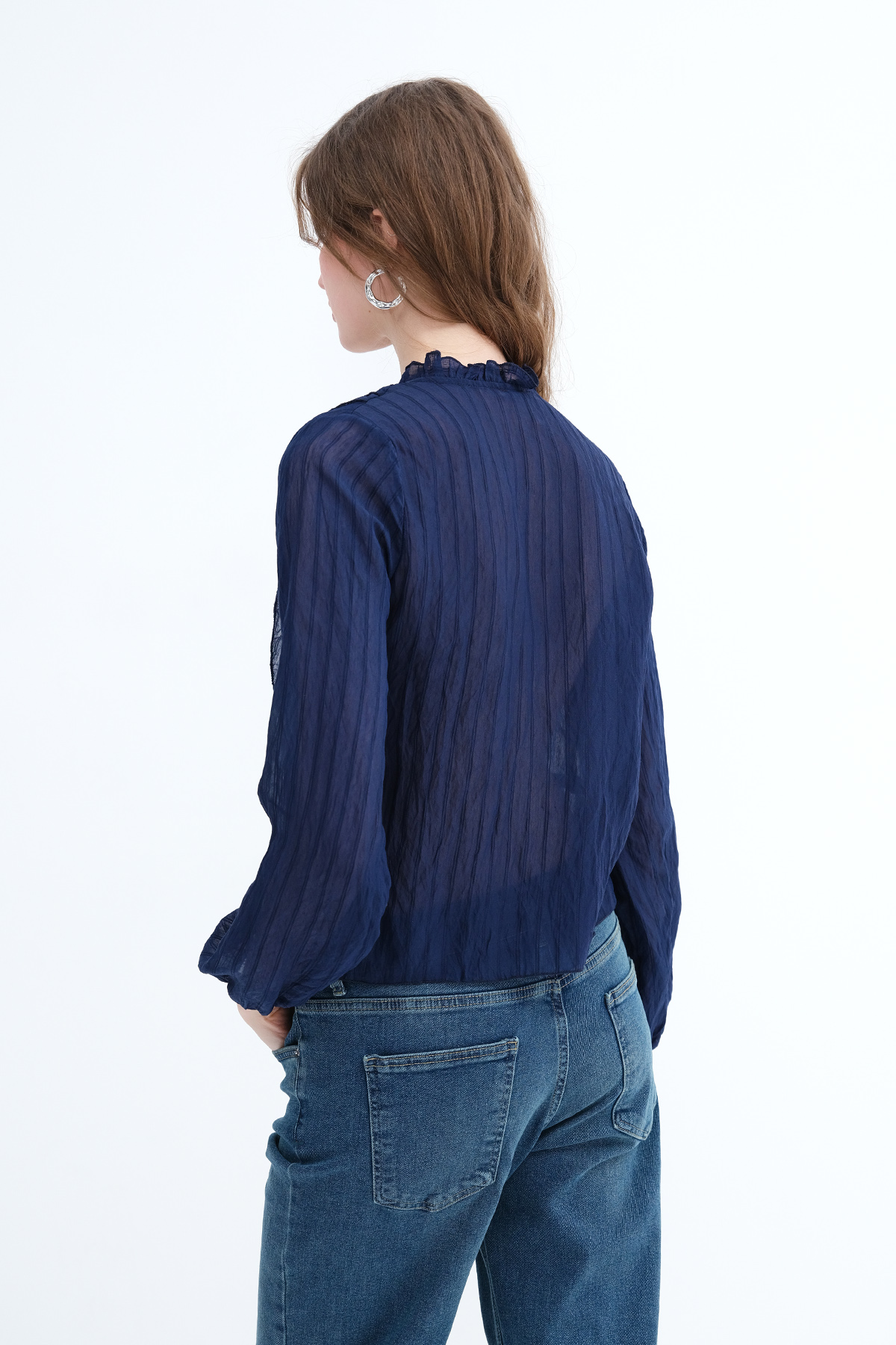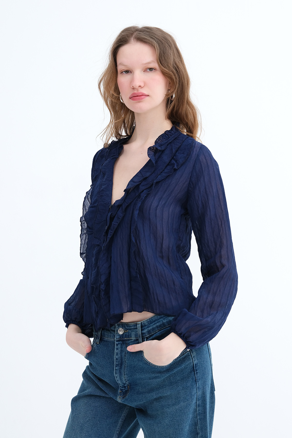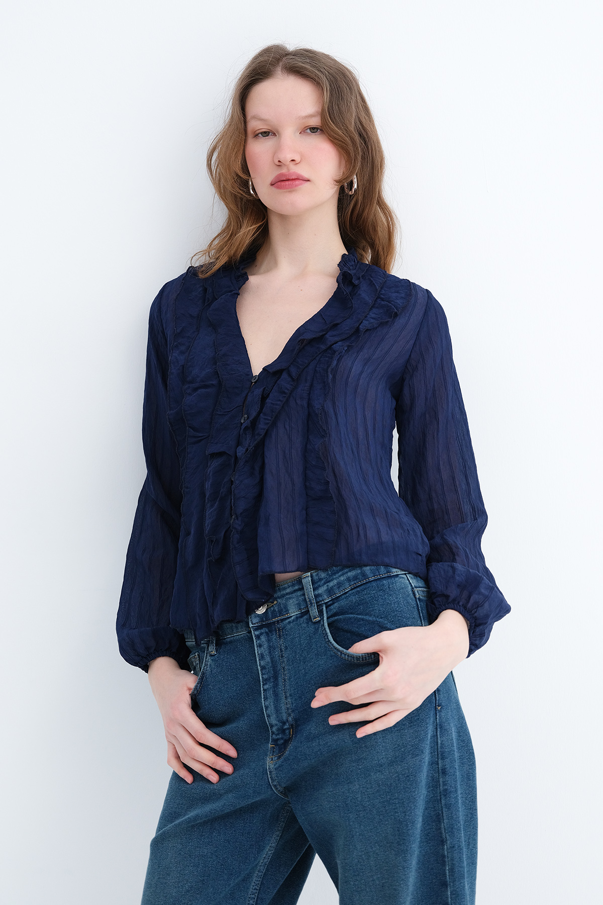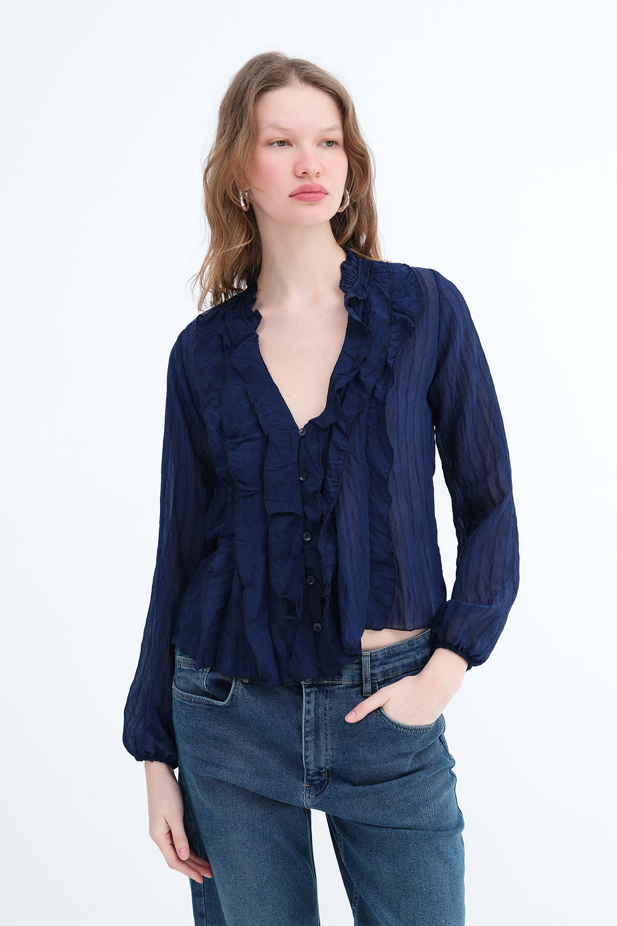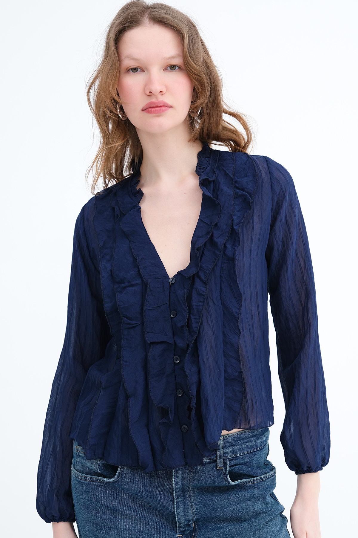 * Düğmeli fırfırlı bluz,