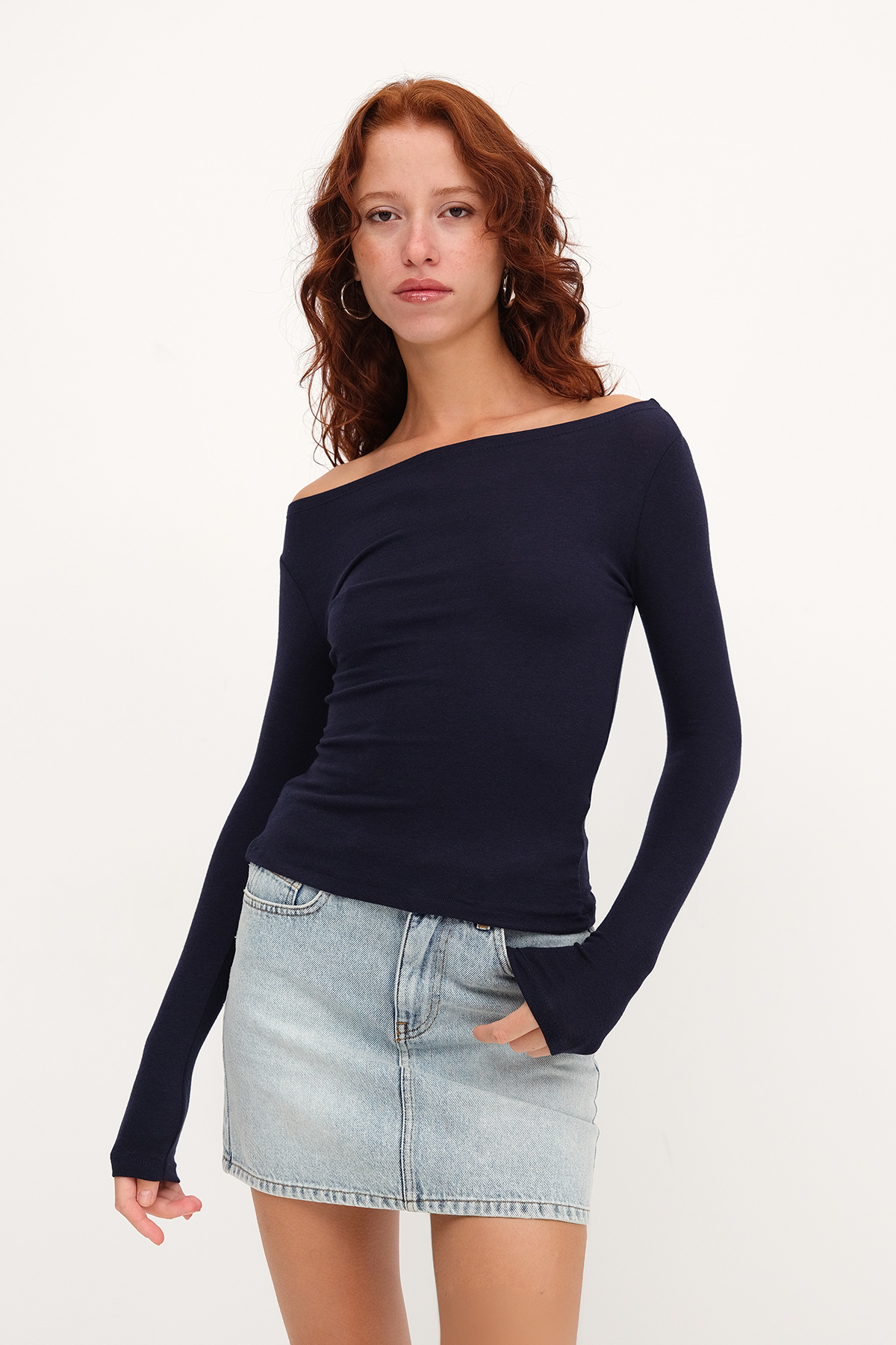 * Kayık yaka, uzun kollu, vücuda oturan basic bluz,