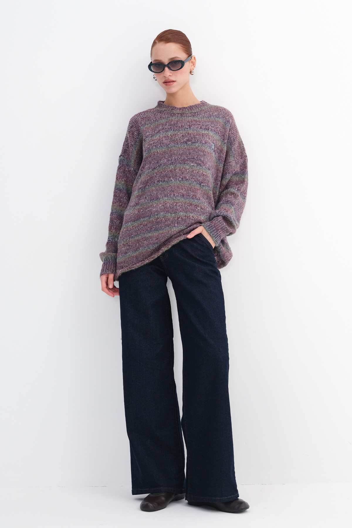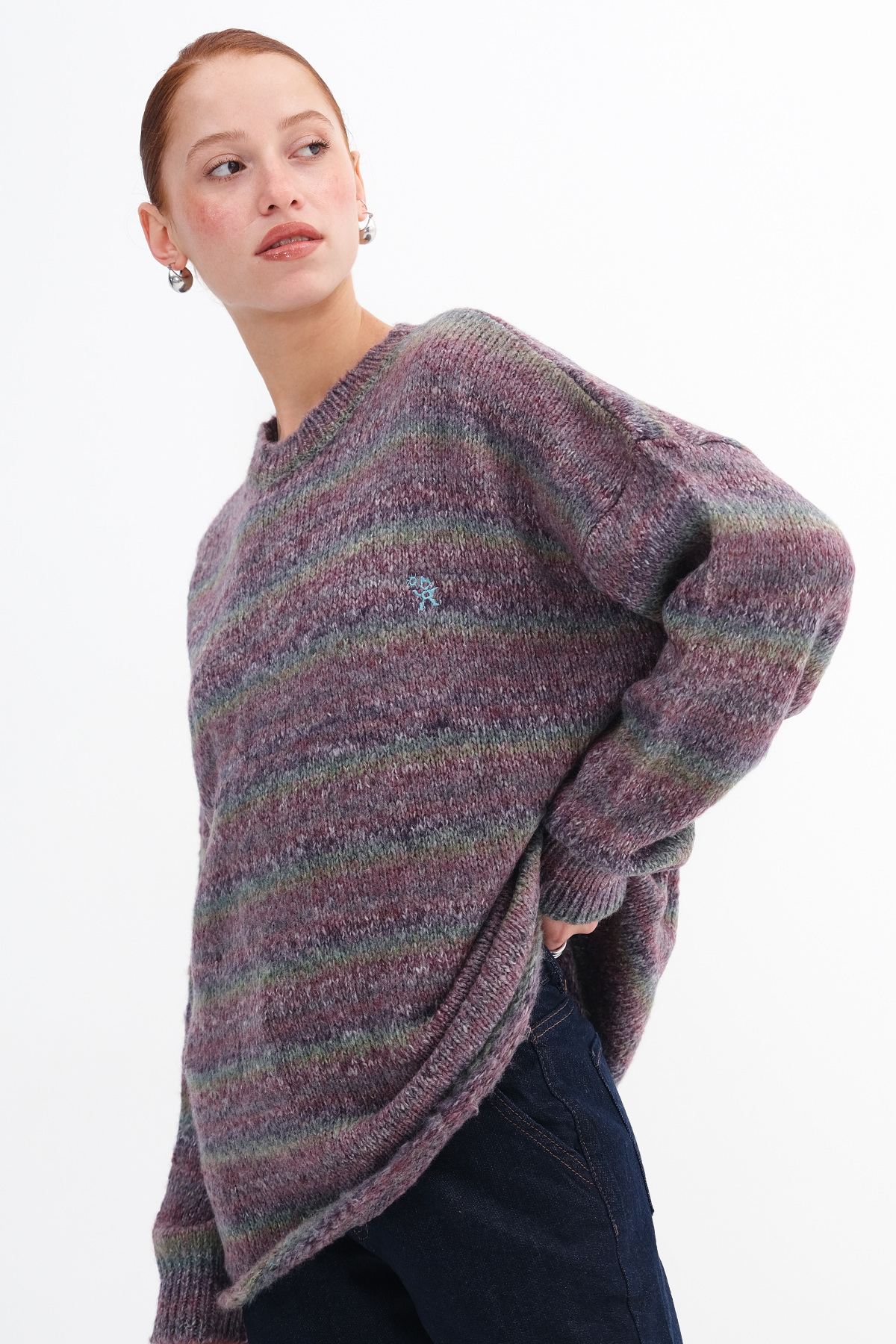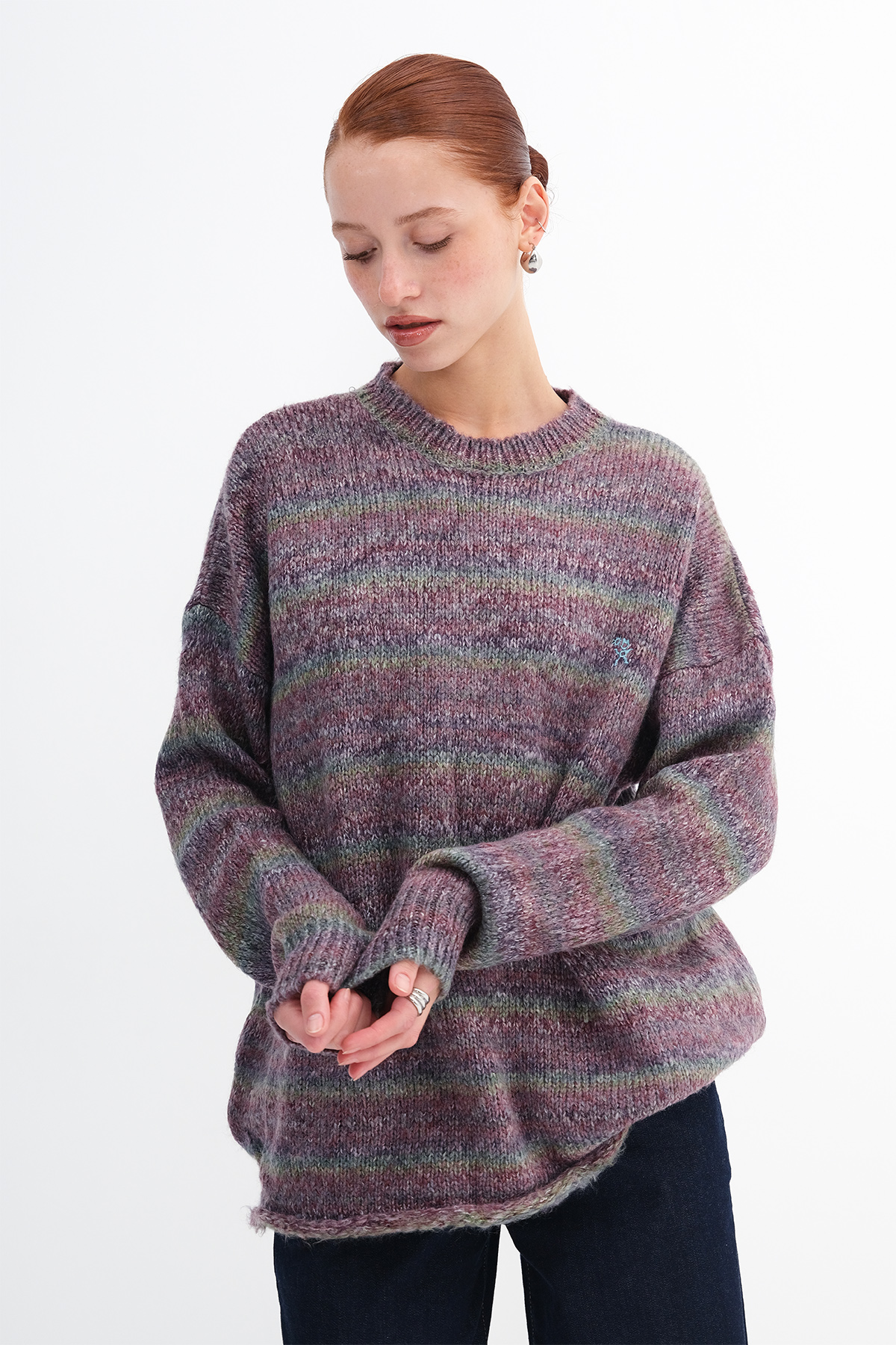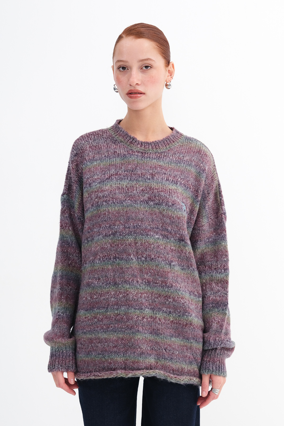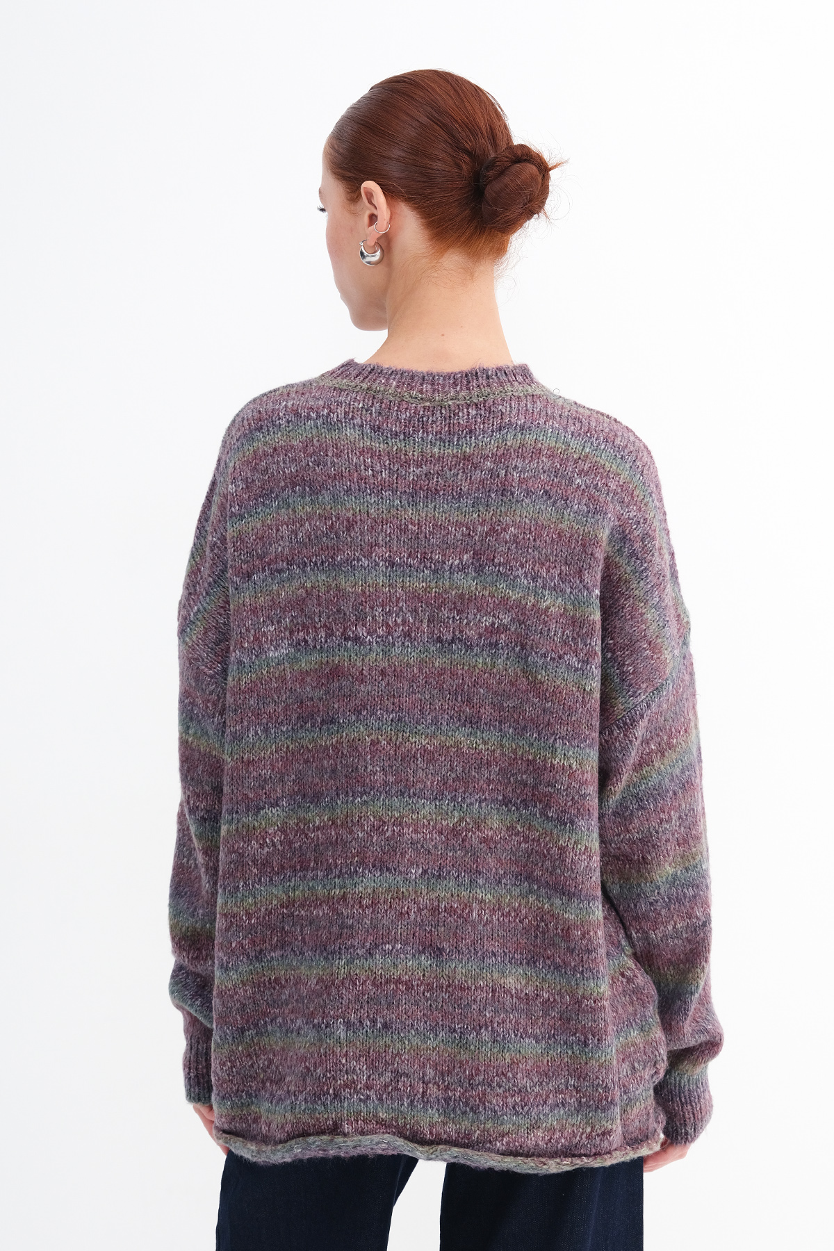 * Çok renkli, rahat kalıp, çizgili triko kazak,