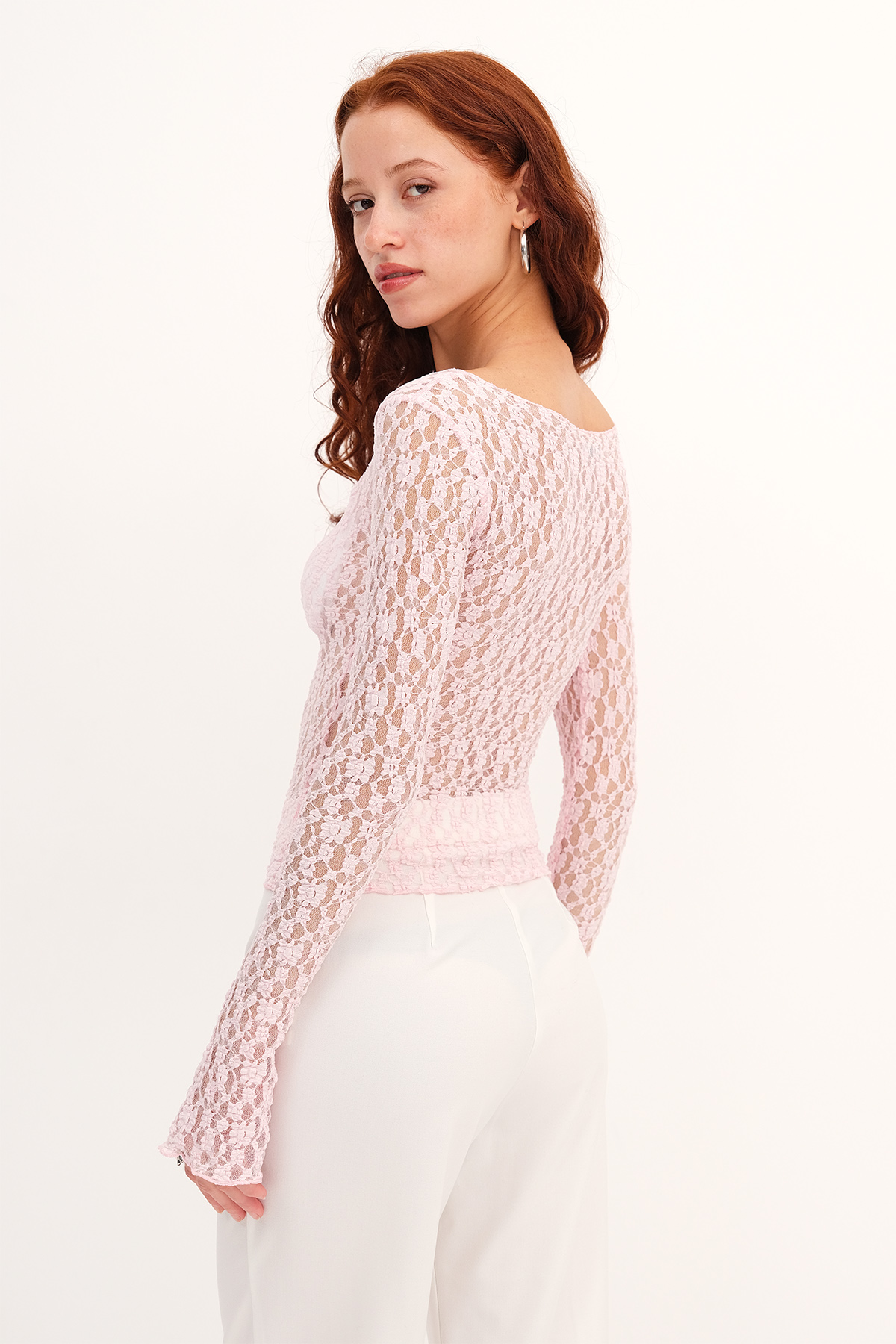 * Kayık yaka, uzun kollu,* Dantelli, transparan bluz,* Ürün içeriği: %95 Polyester %5 Elastan* Manken üzerindeki ürün 36/S bedendir.* Numune beden ölçüleri: Boy: 47 cm Göğüs: 70 Kol boyu: 61 cm (1-3 cm değişiklik gösterebilir)* Ürün çekimlerinde renkler, ışık farklılığından dolayı değişkenlik gösterebilir.