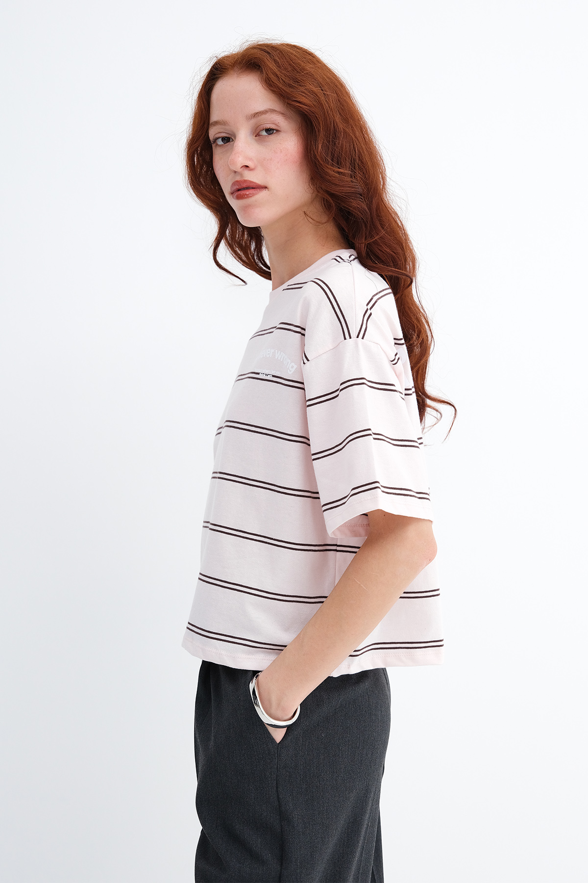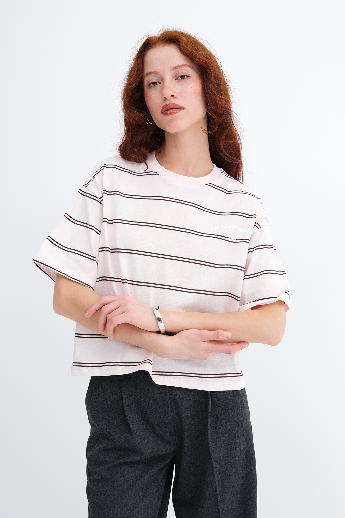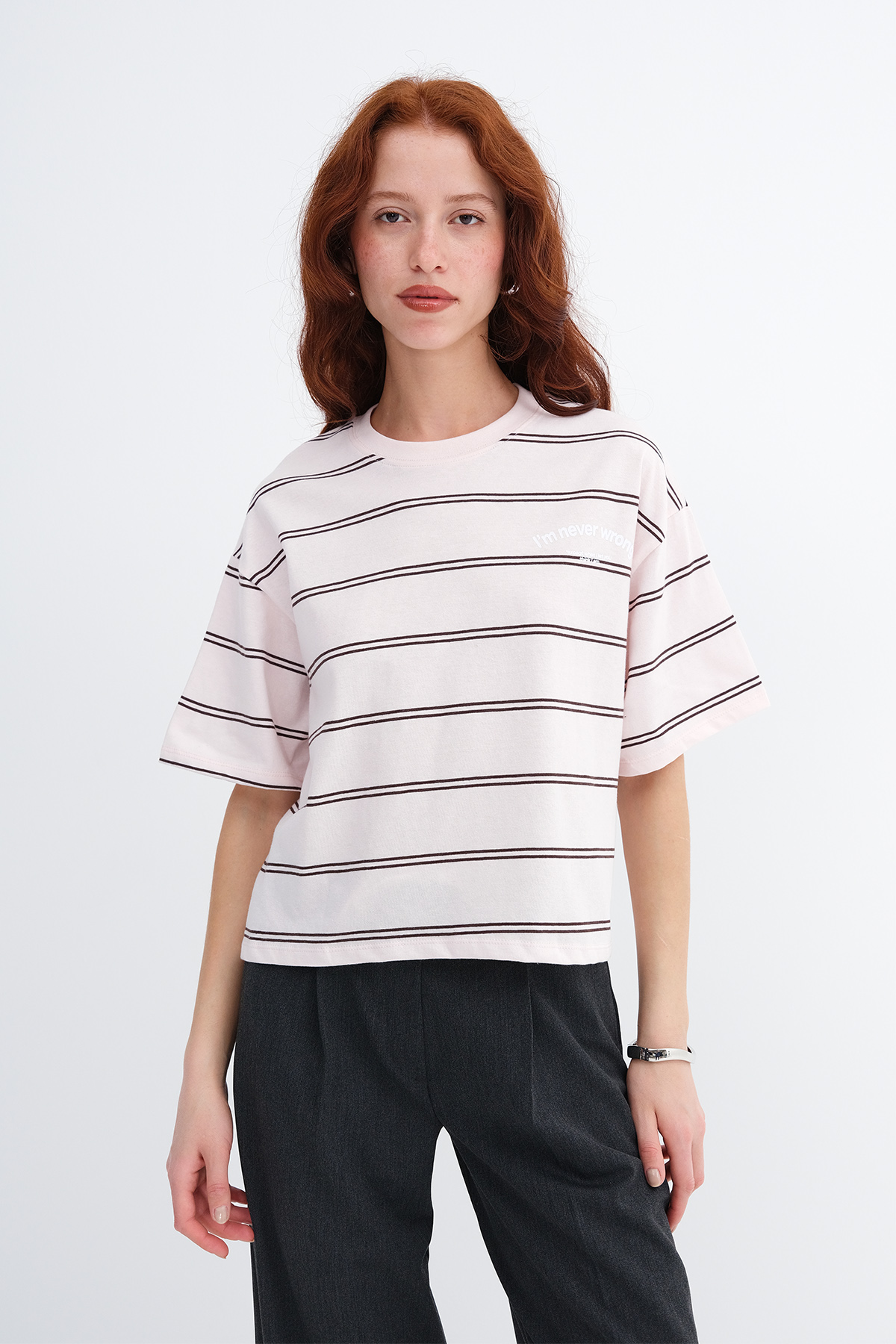 * Rahat kalıp, yazı baskılı, çizgili t-shirt,