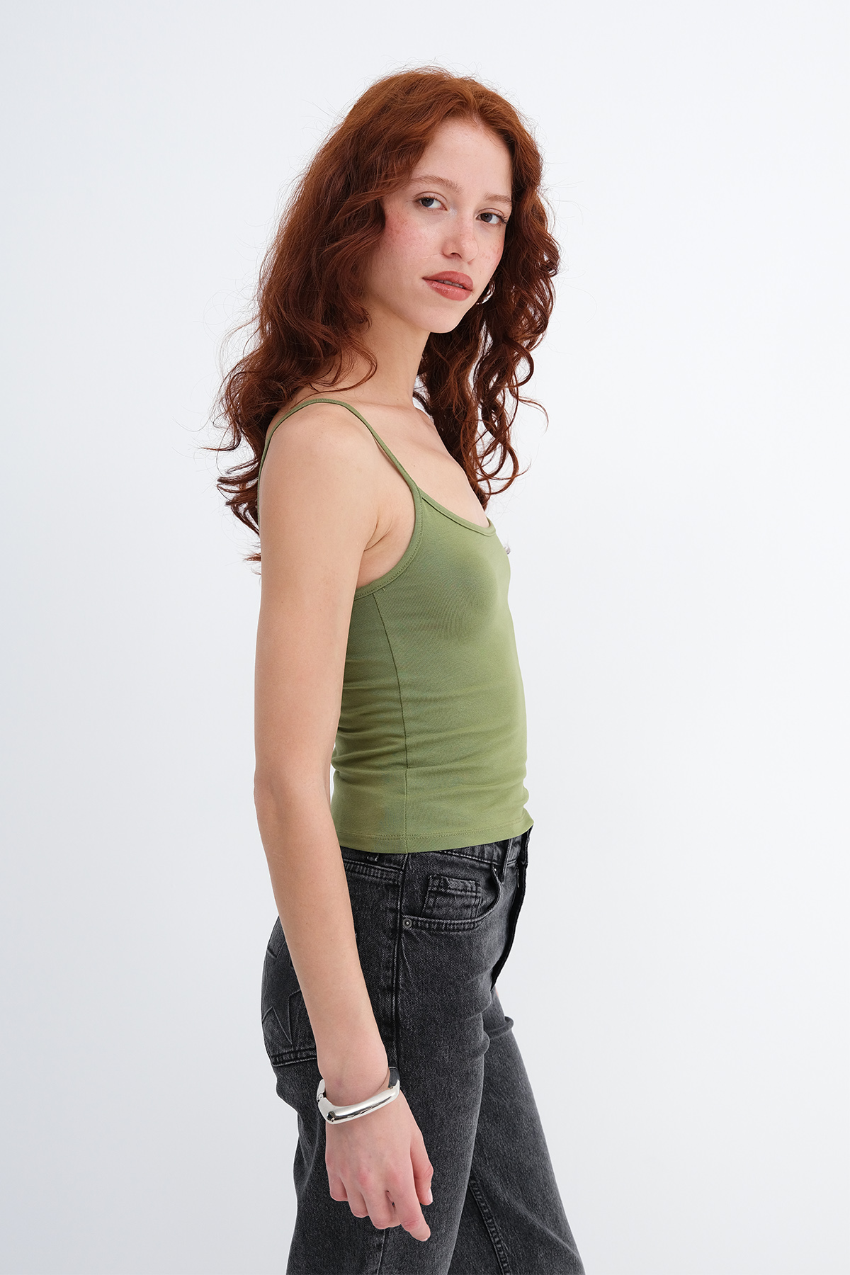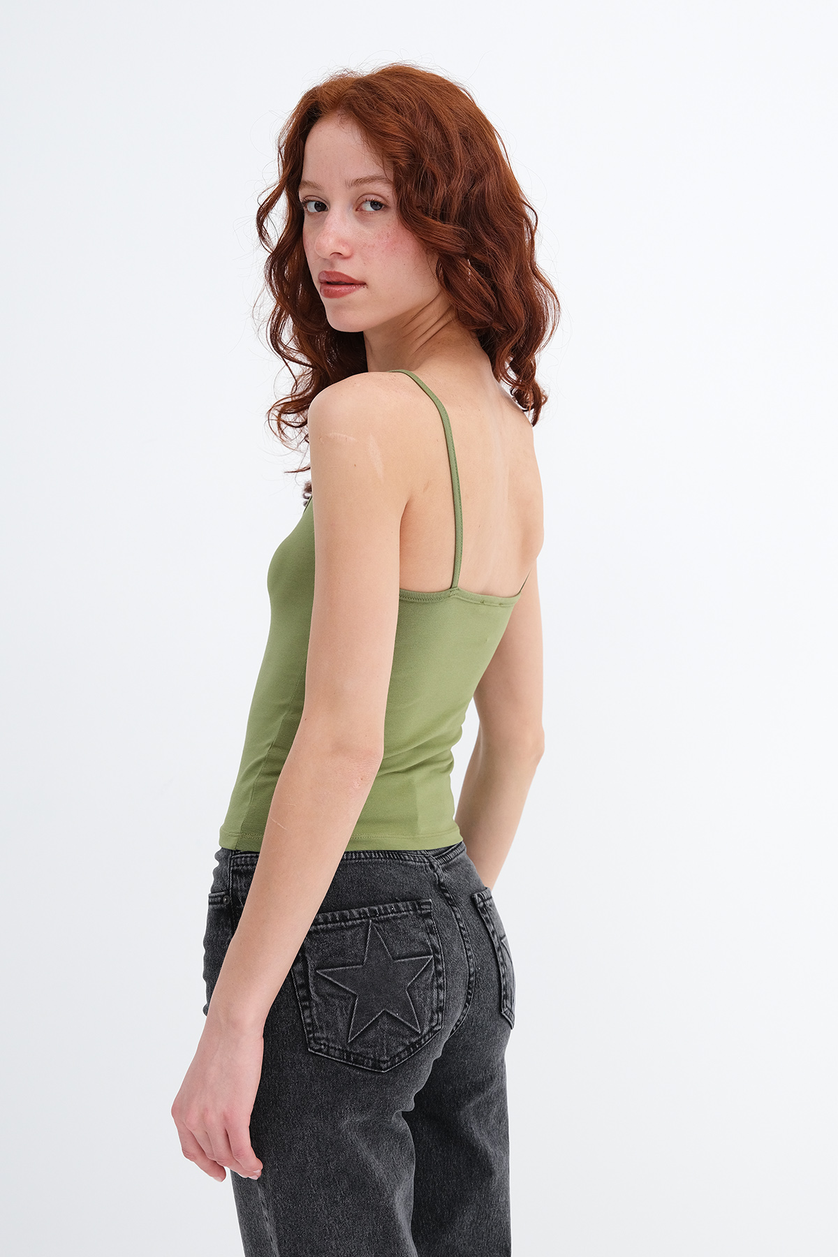 * U yaka, ince askılı,