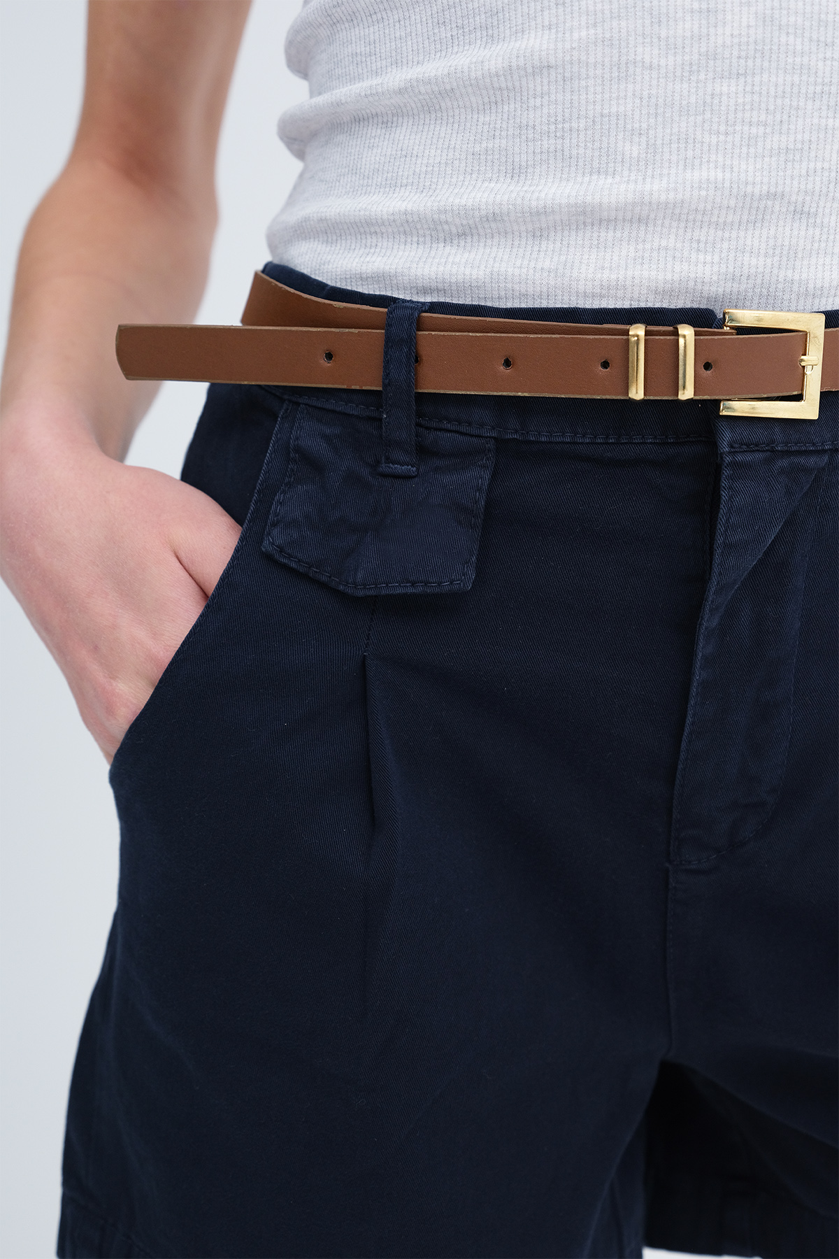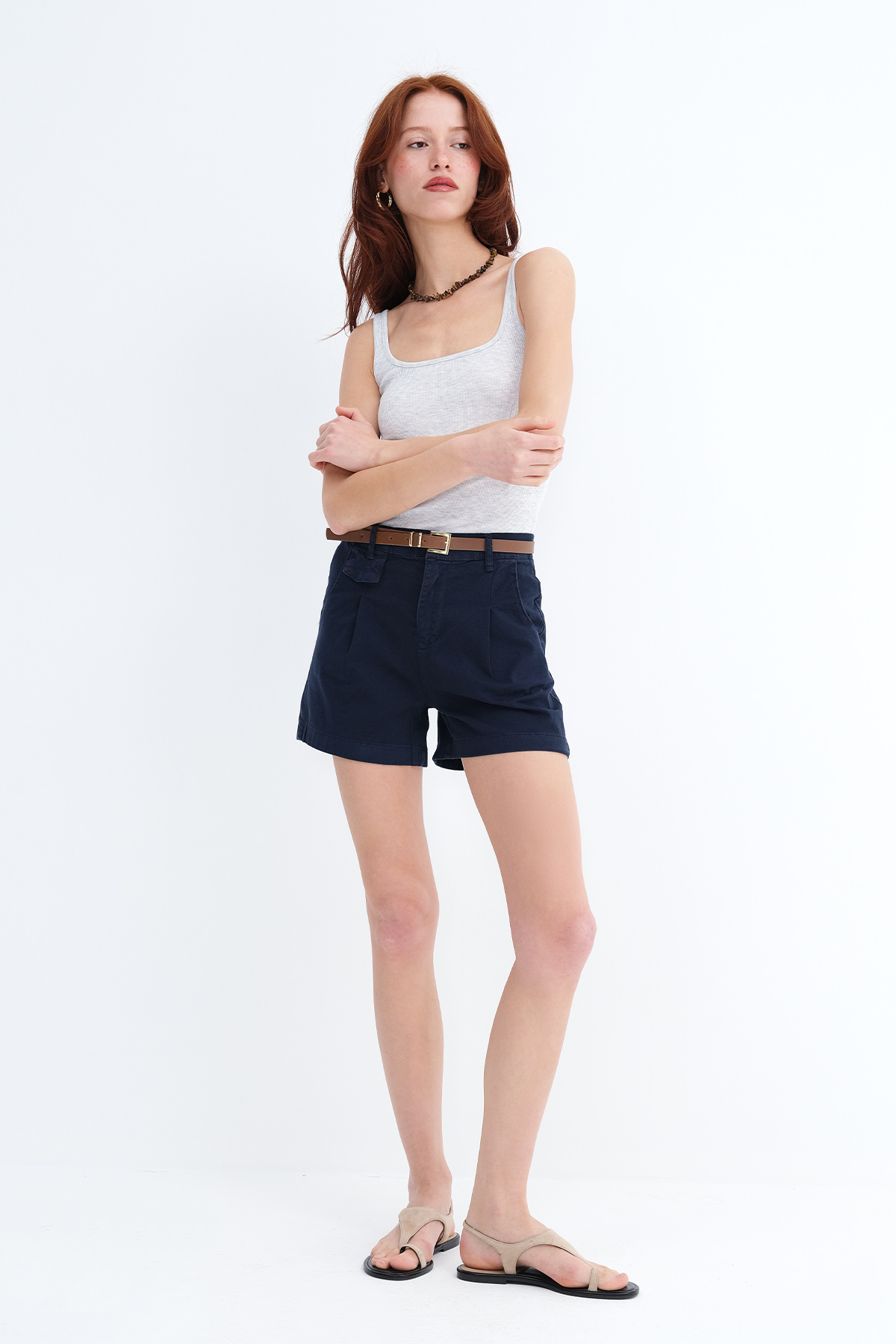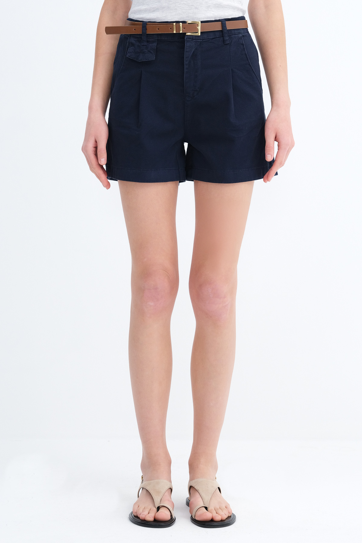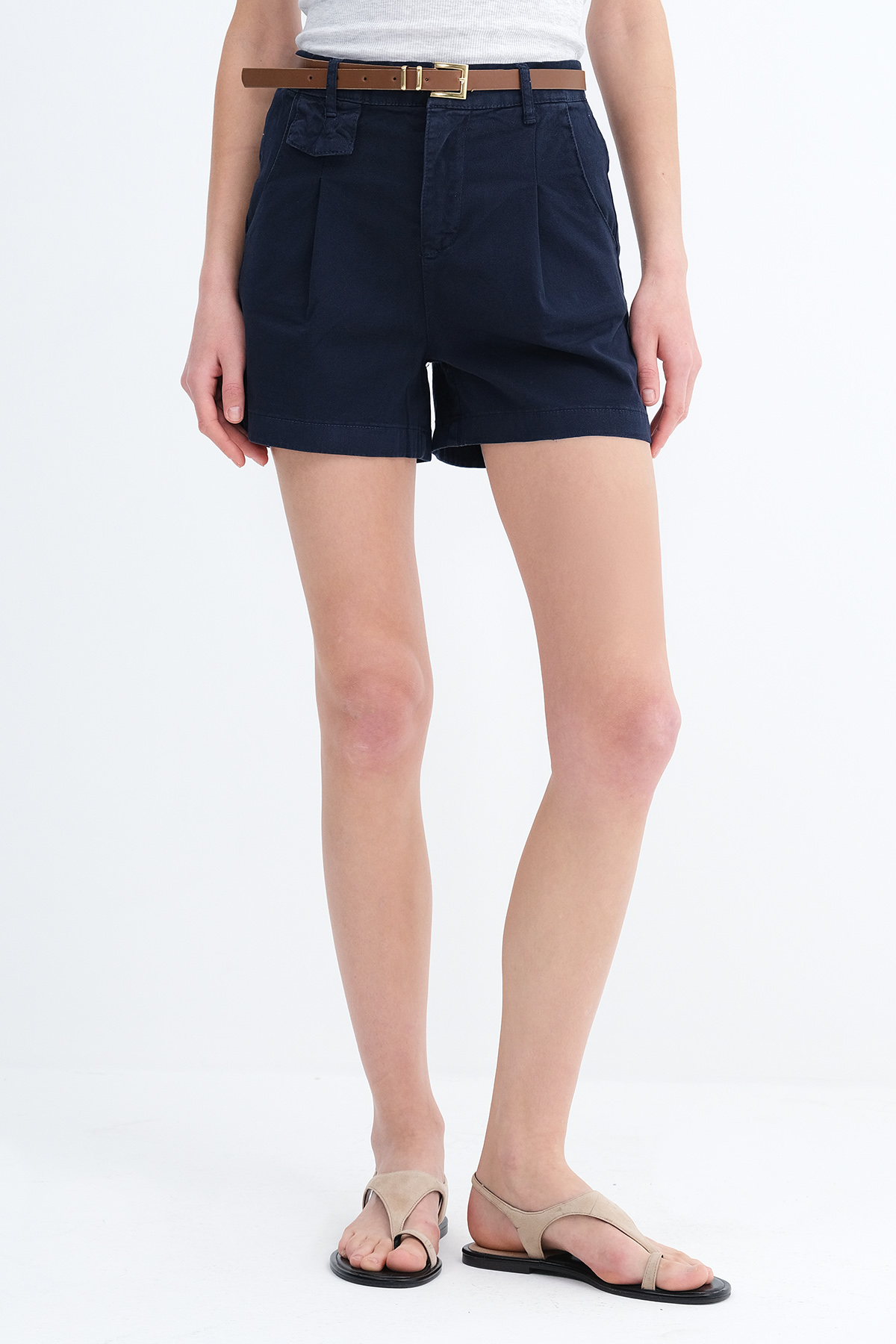* Fermuar patlı, kemerli, cepli, rahat kalıp şort,