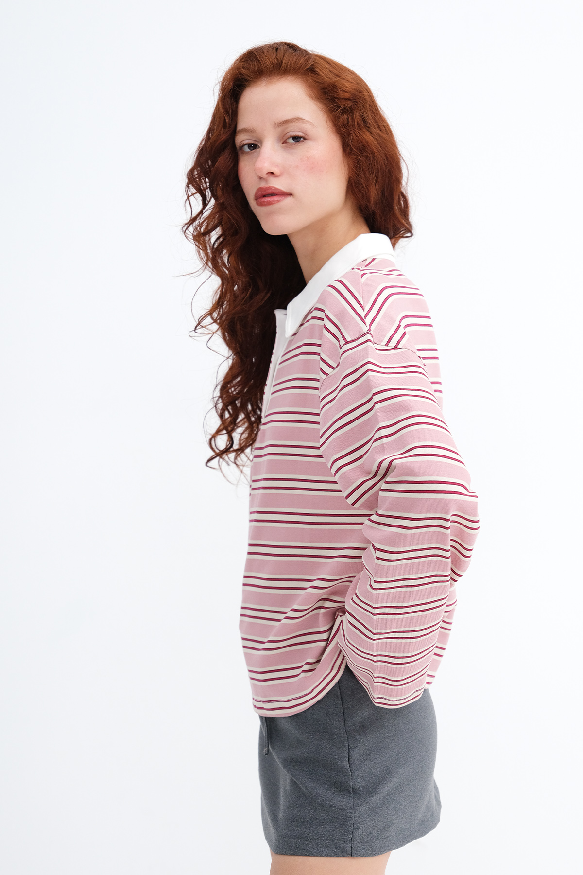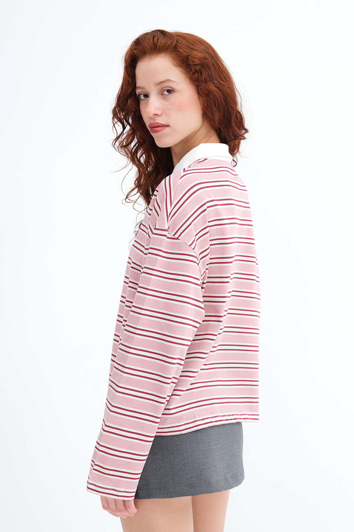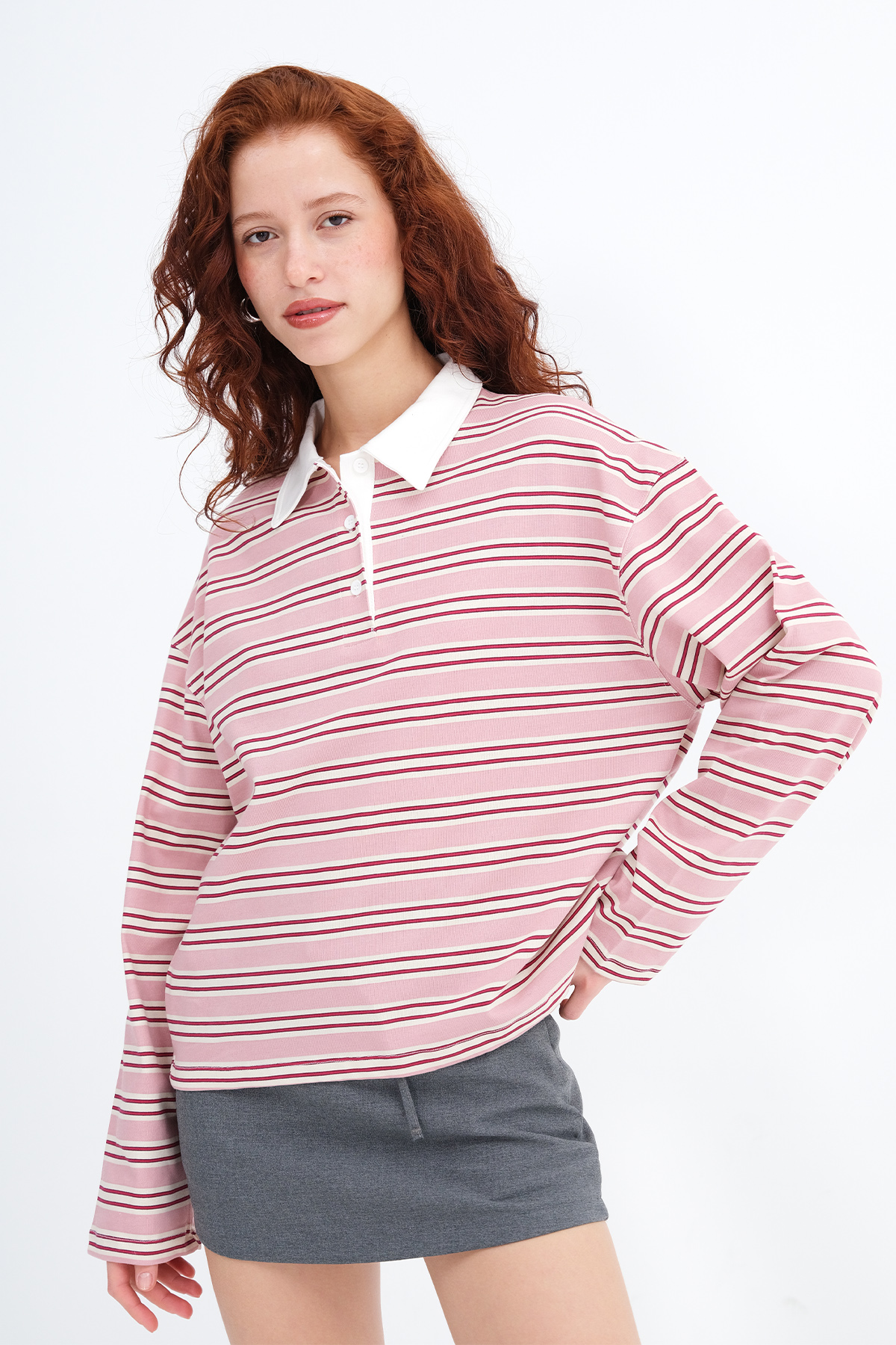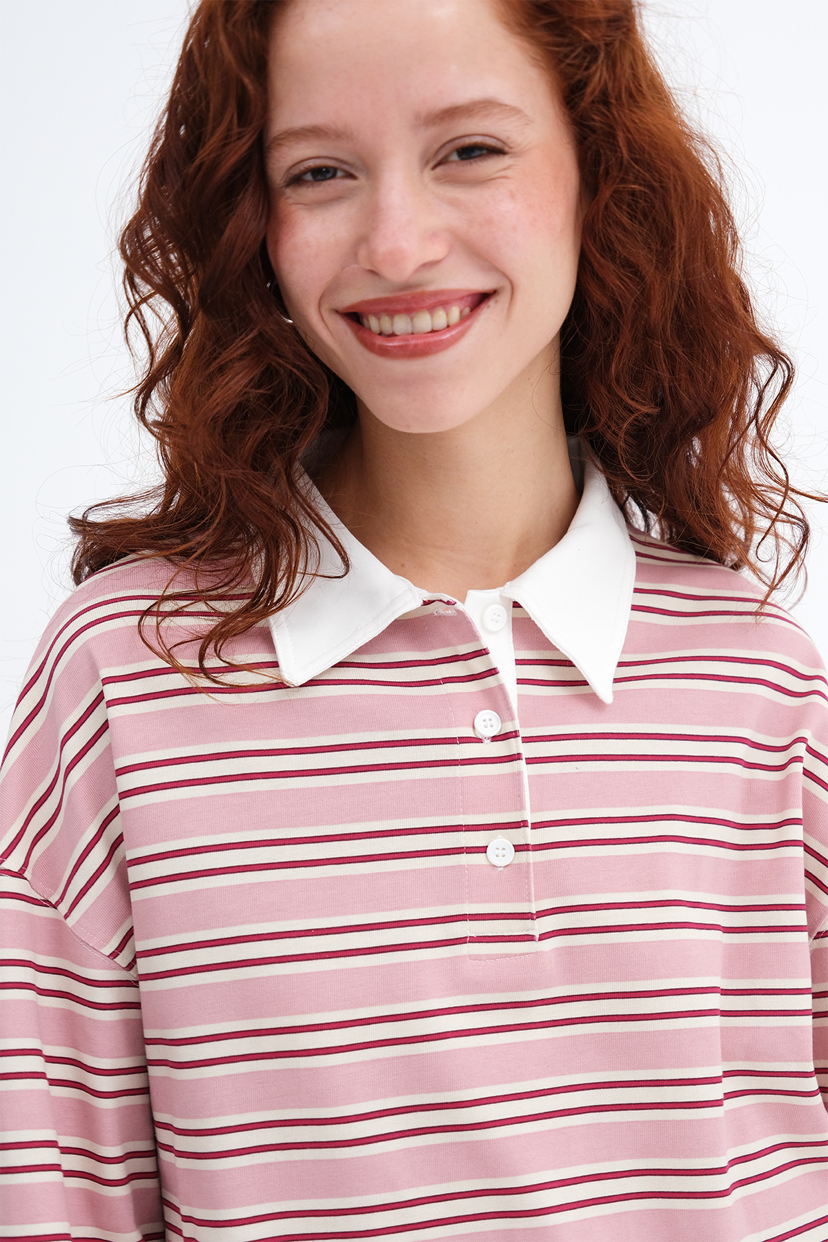 * Yakası düğmeli, çizgili t-shirt,