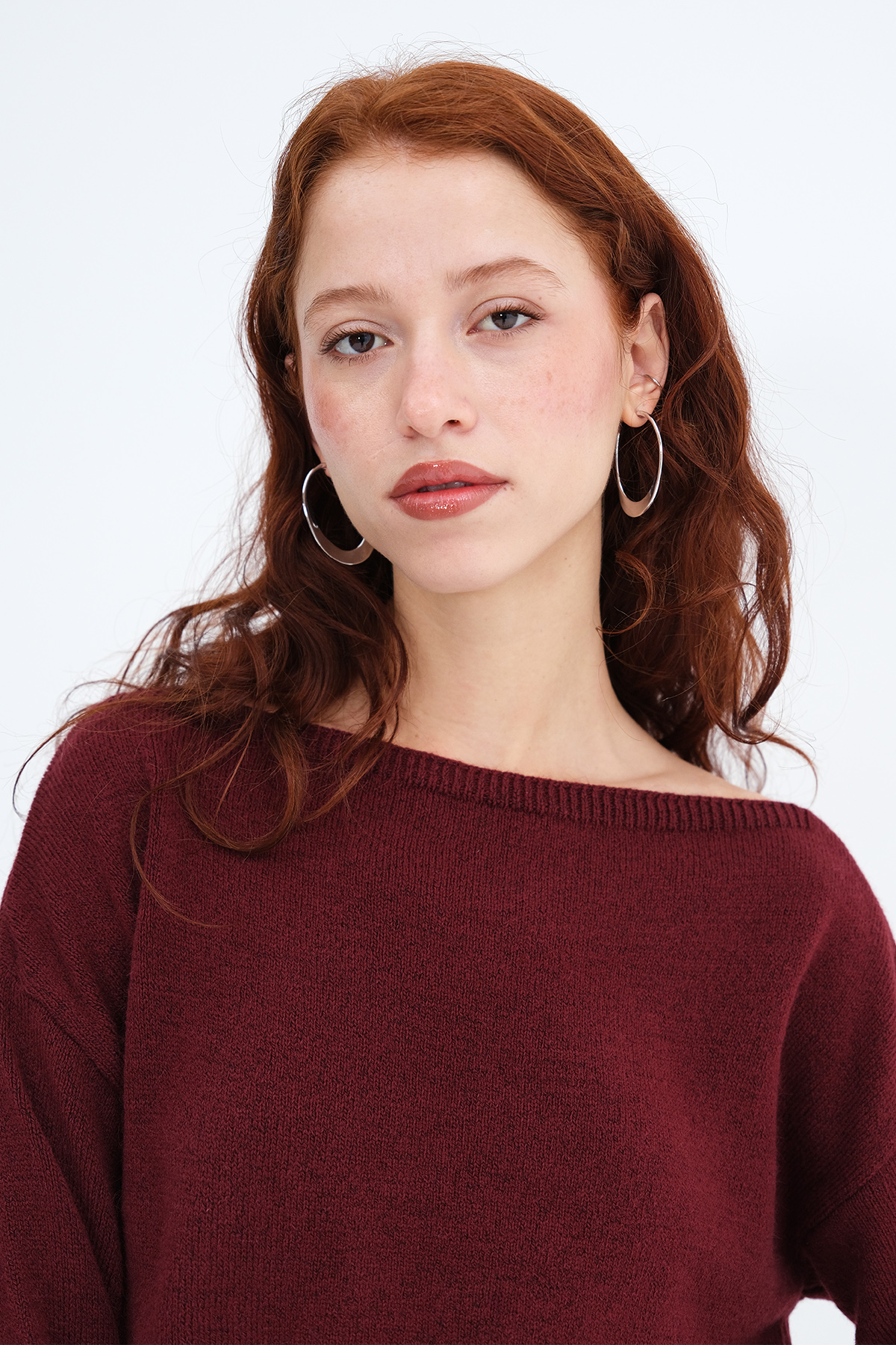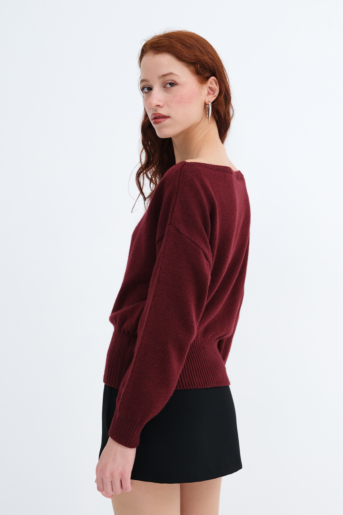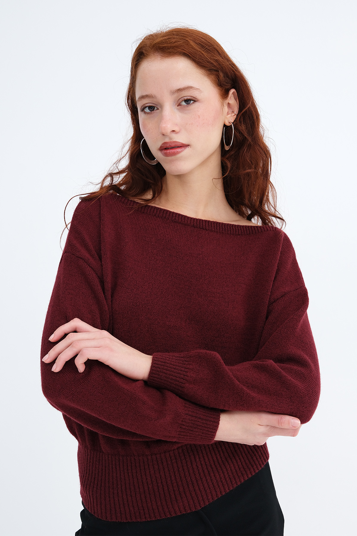 * Kayık yaka, uzun kollu, düşük omuz,
