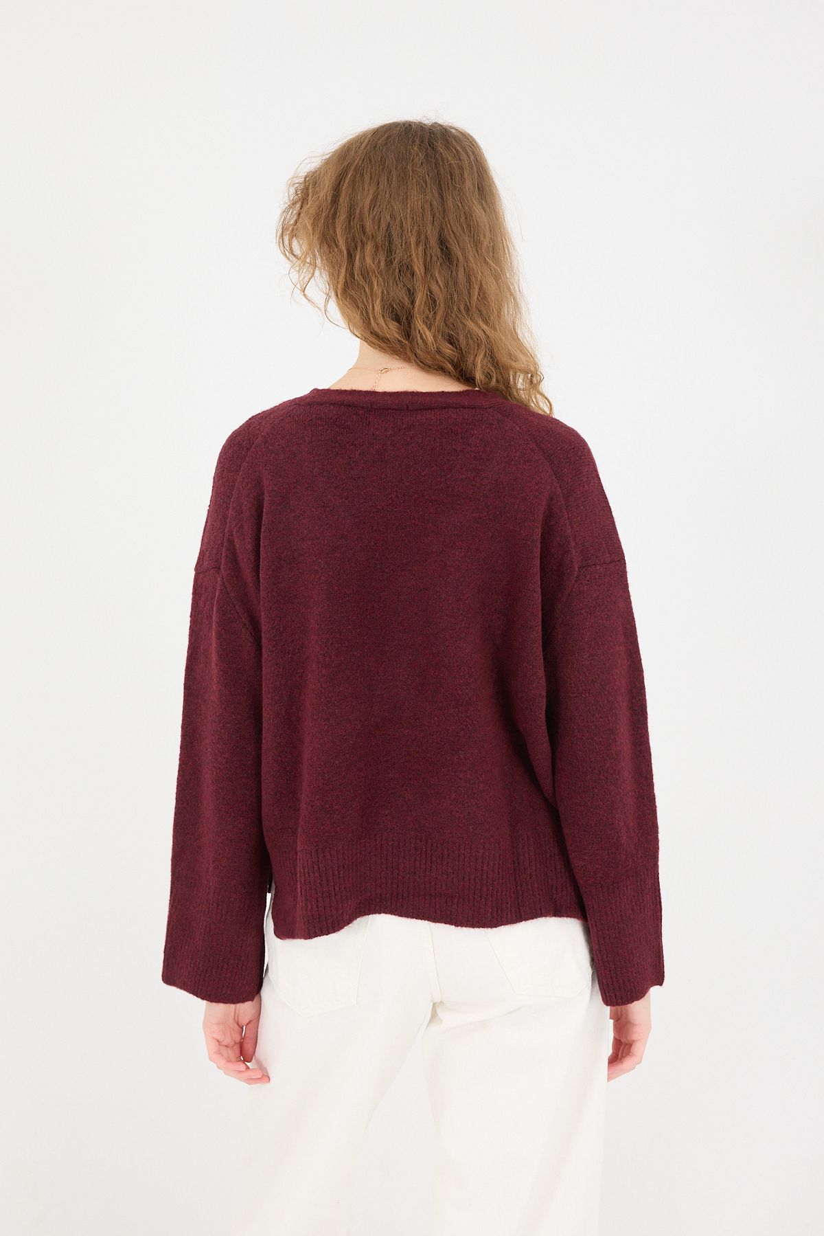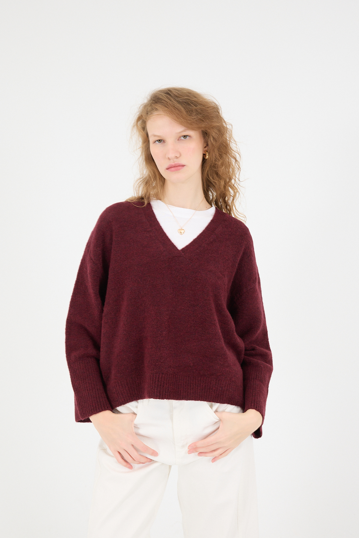 * V yaka, uzun kollu,* Düşük omuz, düz renk,* Rahat kalıp, triko kazak,* Ürün içeriği:%49 Akrilik %32 Polyester %16 Naylon %3 Elastan* Manken üzerindeki ürün standart bedendir.* Numune beden ölçüleri: Boy: 55 cm Göğüs: 110 cm Kol boyu: 45 cm (1-3 cm değişiklik gösterebilir)* Ürün çekimlerinde renkler, ışık farklılığından dolayı değişkenlik gösterebilir.