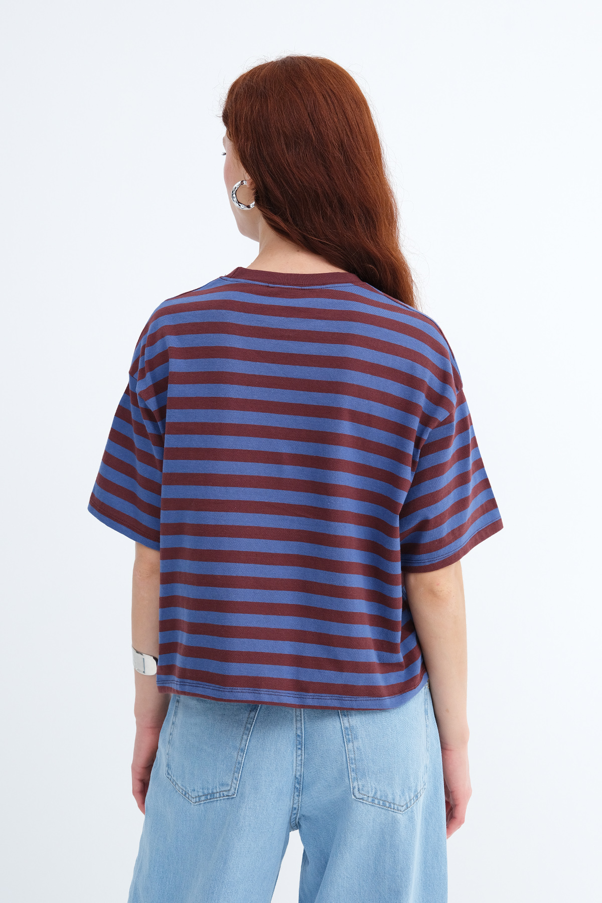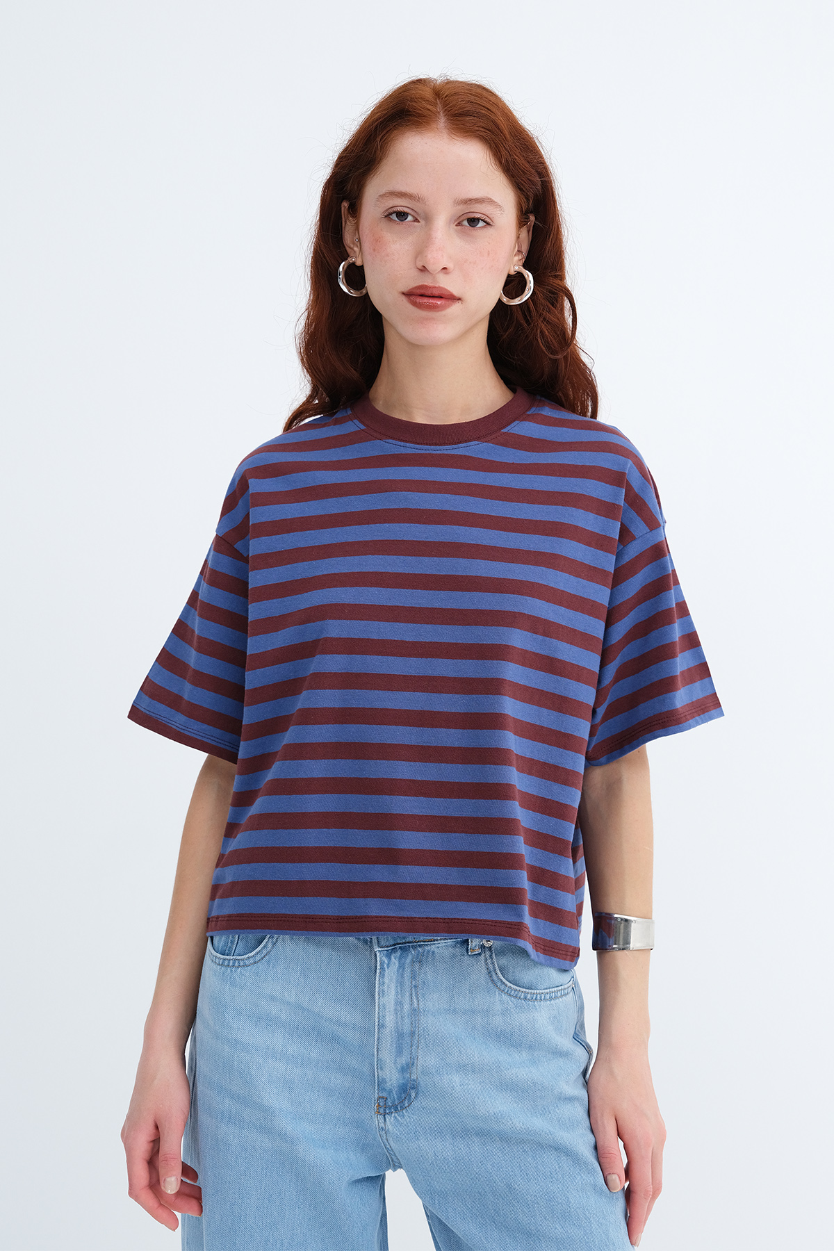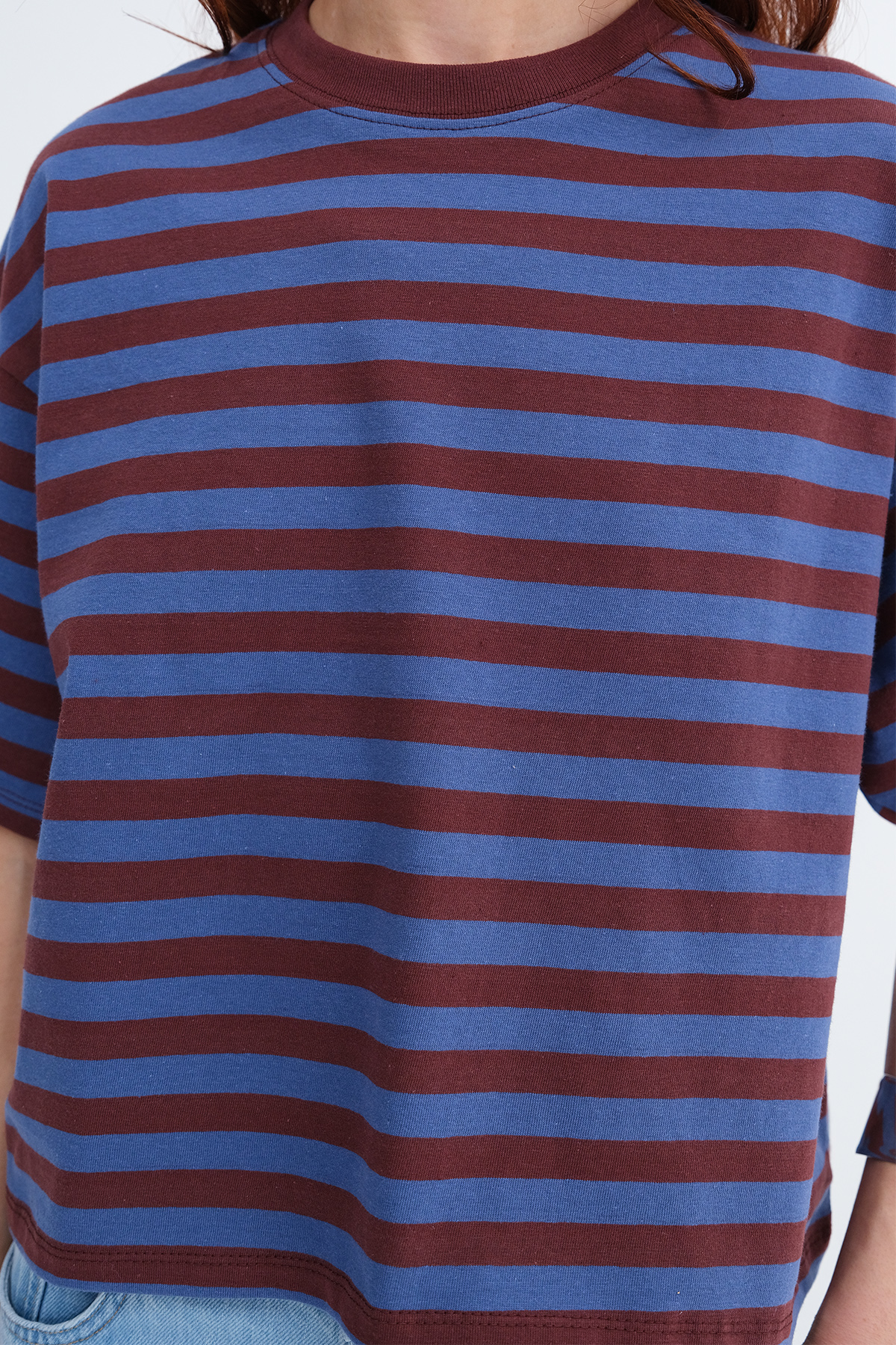 * Düşük omuz, rahat kalıp, çizgili t-shirt,