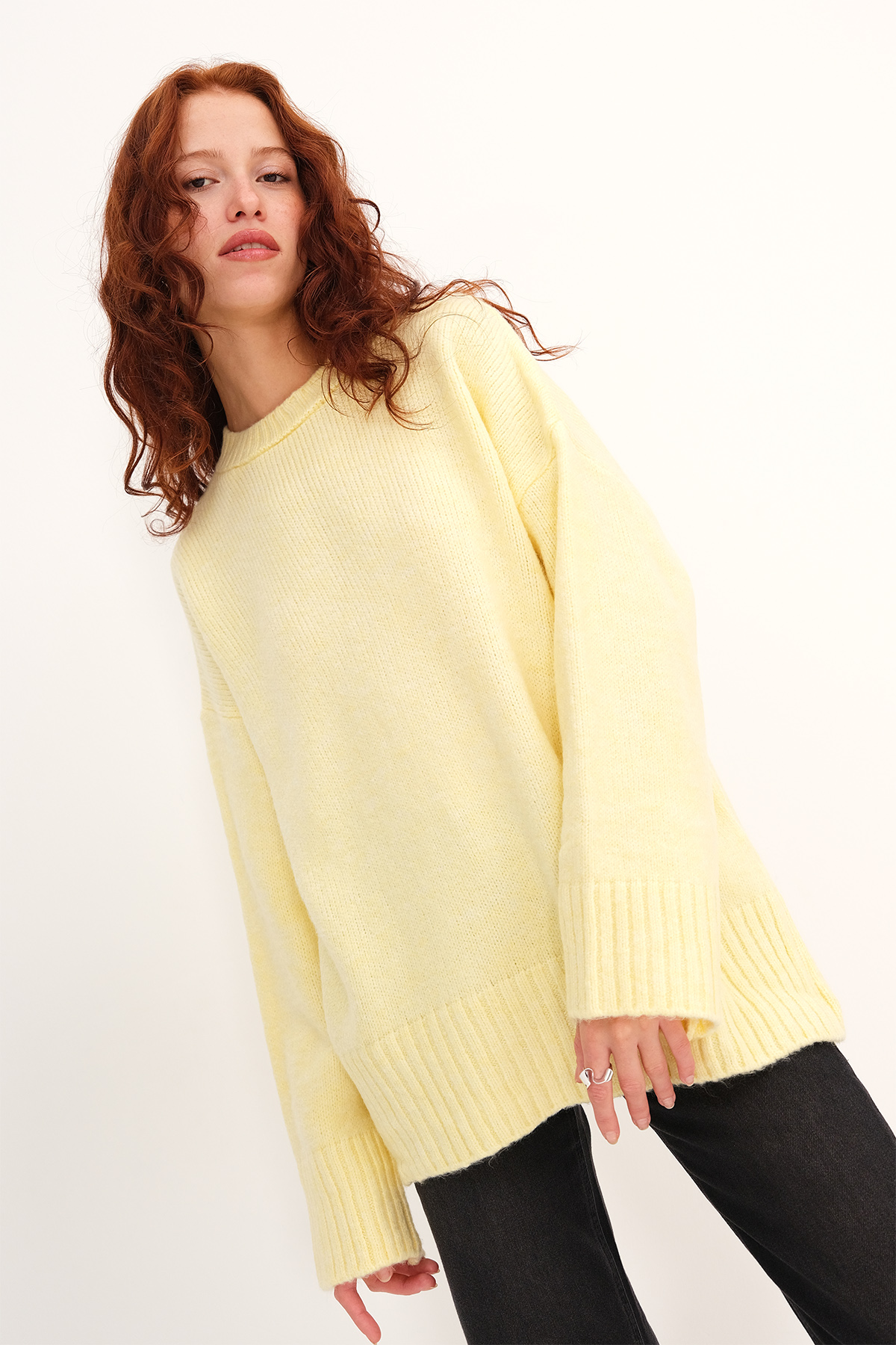 * Bisiklet yaka, uzun kollu,* Düşük omuz, basic,* Rahat kalıp, triko kazak,* Ürün içeriği: %74 Akrilik %19 Polyester %7 Elastan* Manken üzerindeki ürün standart bedendir.* Numune beden ölçüleri: Boy: 63 cm Göğüs: 120 cm Kol boyu: 41 cm (1-3 cm değişiklik gösterebilir)* Ürün çekimlerinde renkler, ışık farklılığından dolayı değişkenlik gösterebilir.