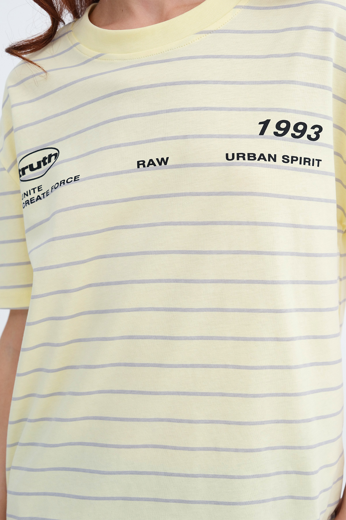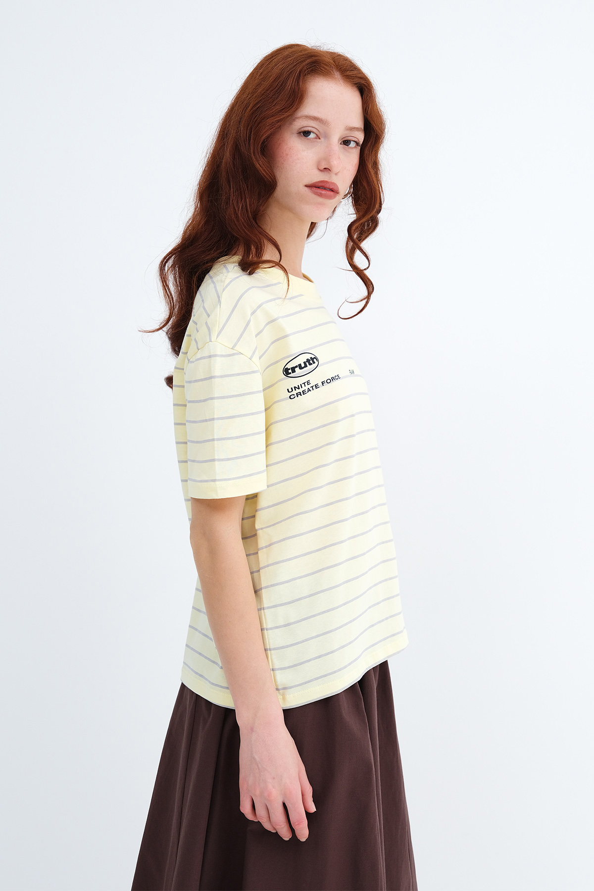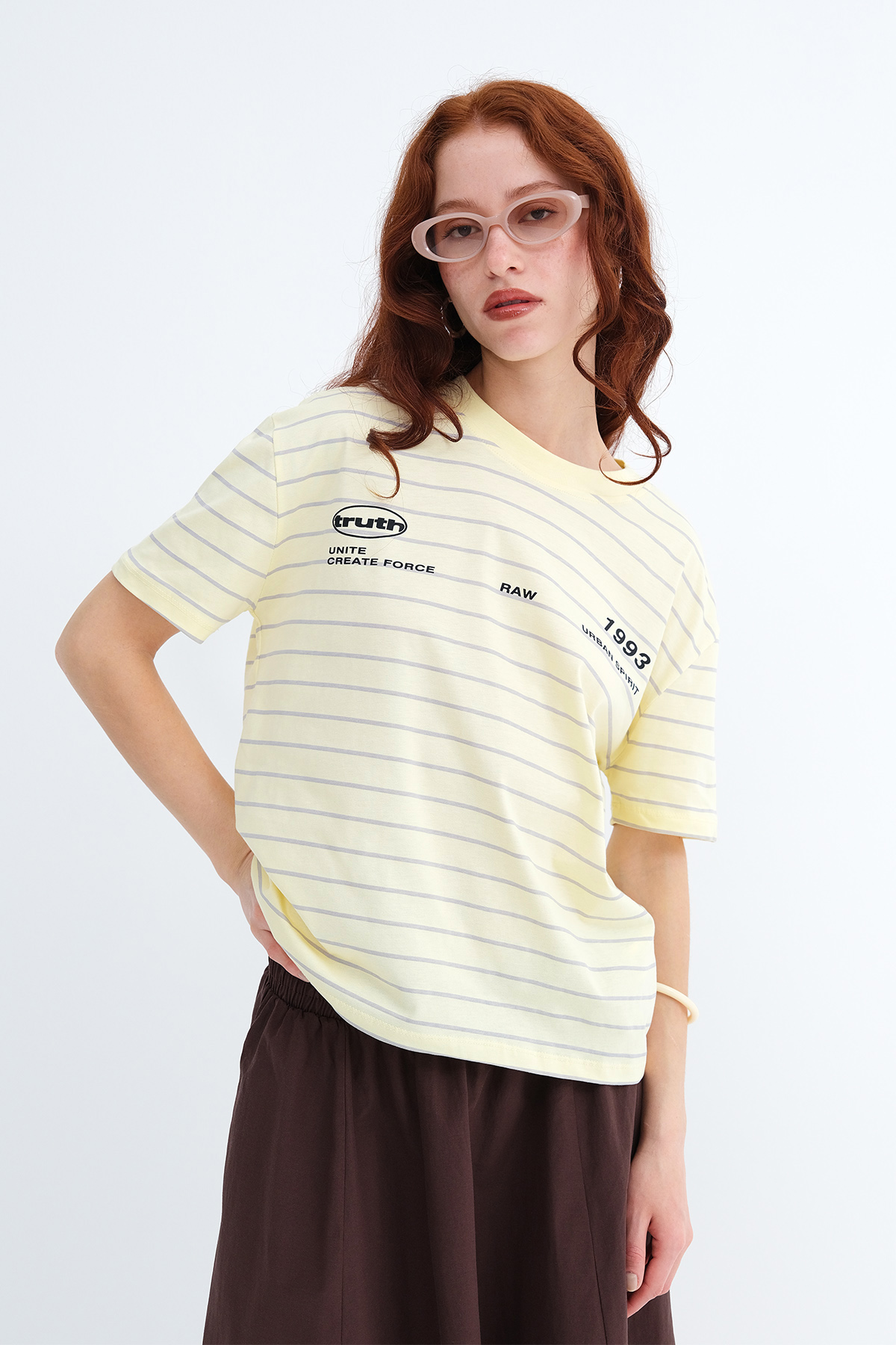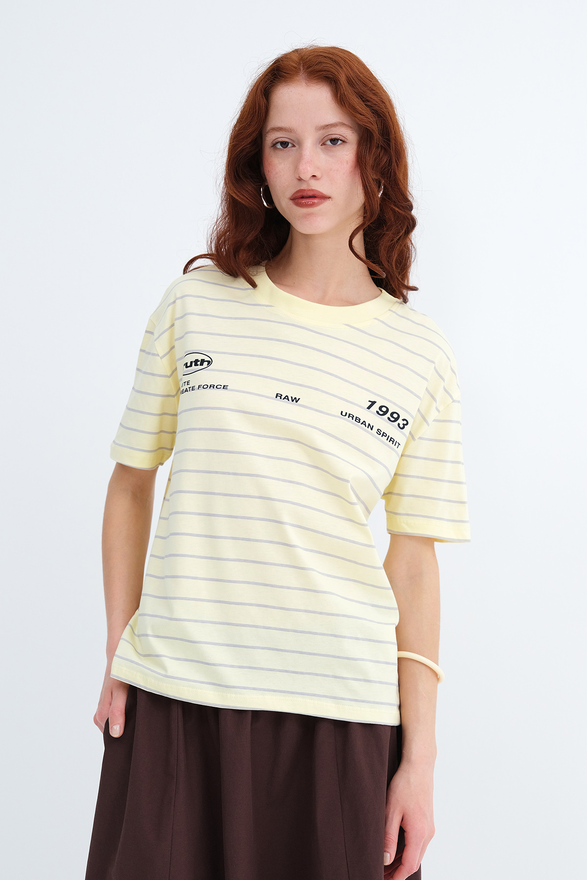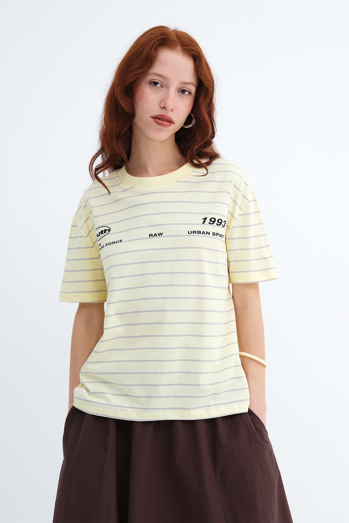 * Çizgili, yazı baskılı, rahat kalıp t-shirt,