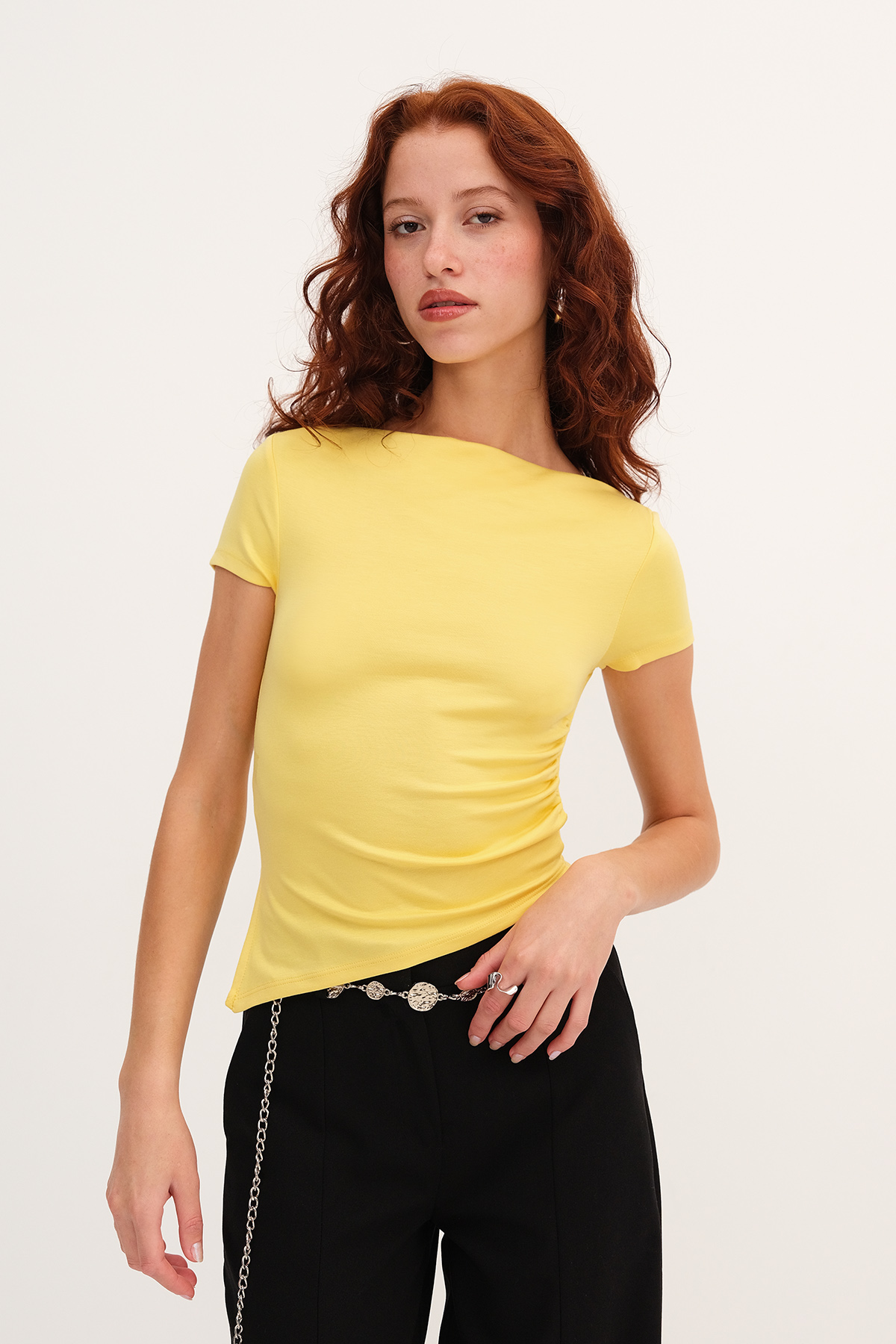 * Kayık yaka, kısa kollu,* Asimetrik kesim, yanı büzgülü,* Düz renk bluz,* Ürün içeriği:%95 Pamuk %5 Elastan,* Manken üzerindeki ürün 36/S bedendir.* Numune Beden Ölçüleri: Boy: 41 cm Göğüs: 60 cm Kol Boyu: 11 cm (1-3 cm arasında değişiklik gösterebilir)* Ürün çekimlerinde renkler, ışık farklılığından dolayı değişkenlik gösterebilir.