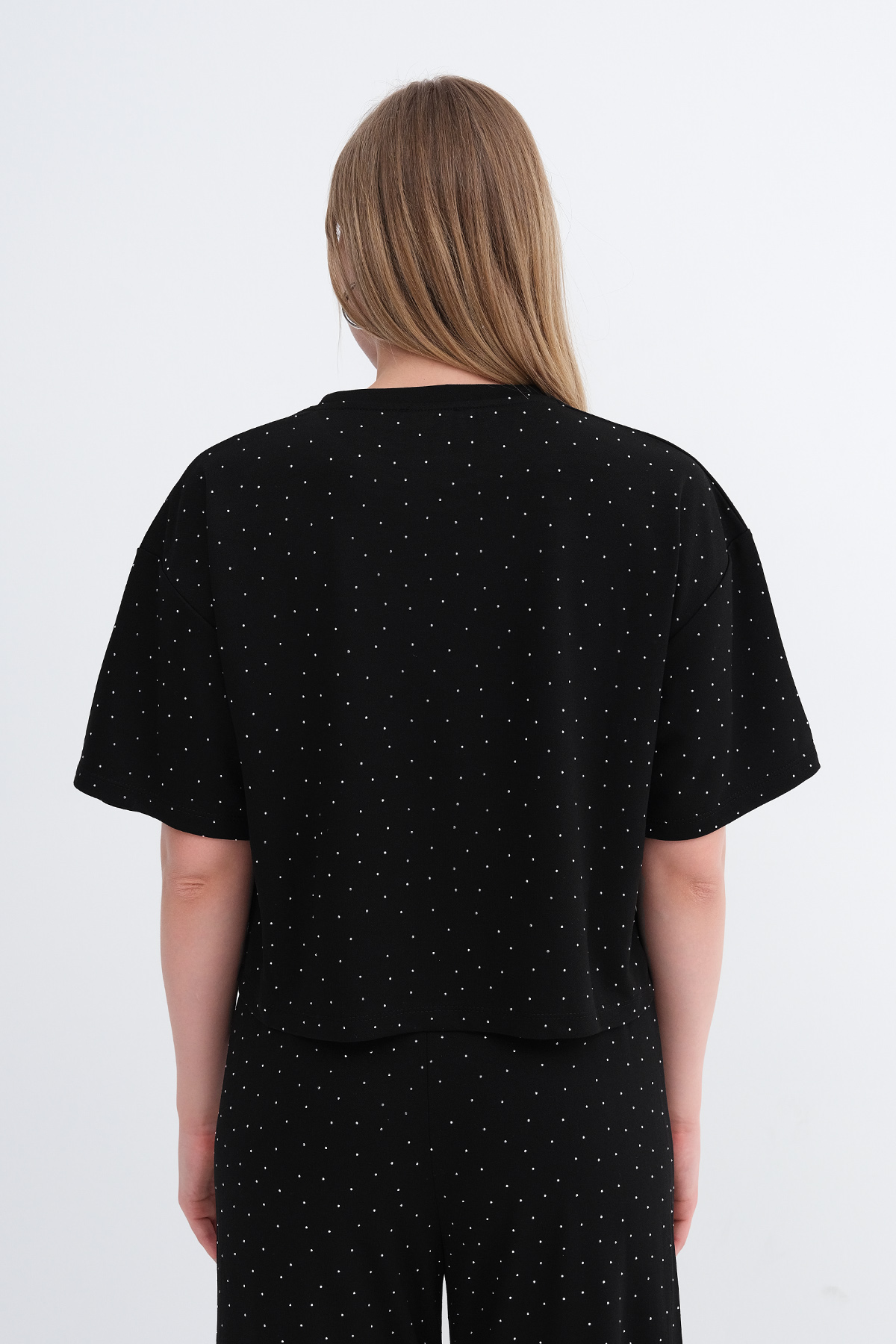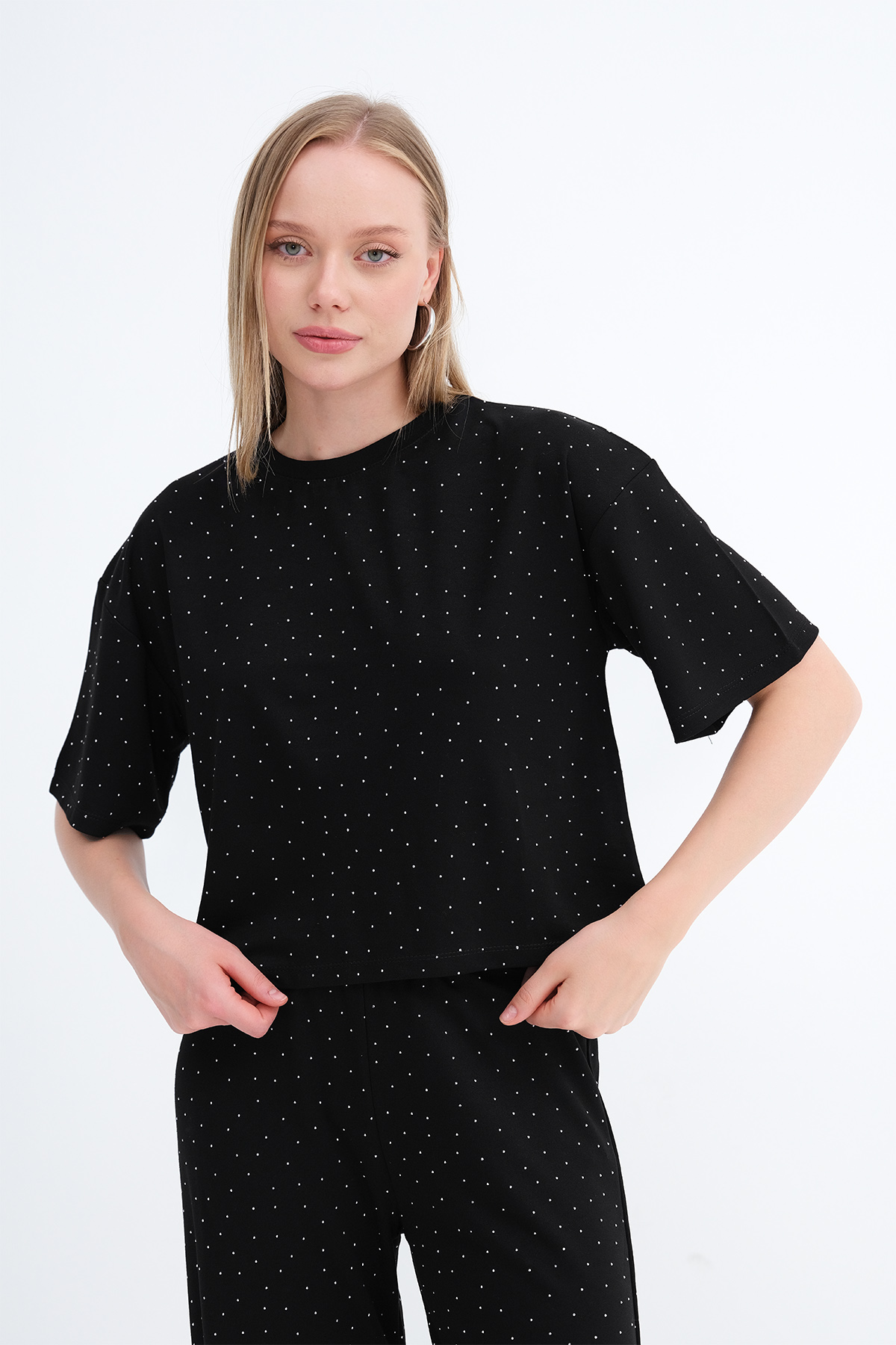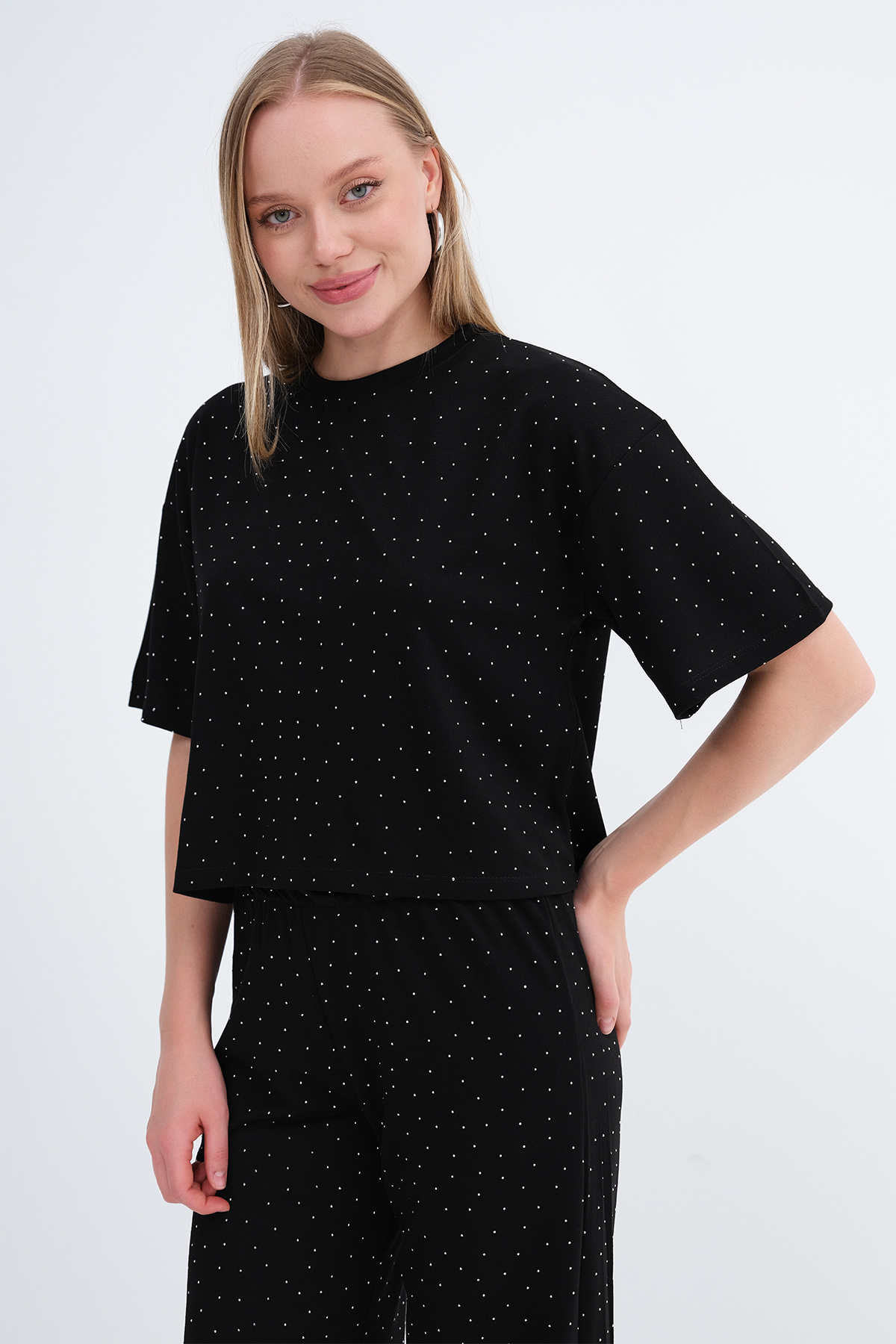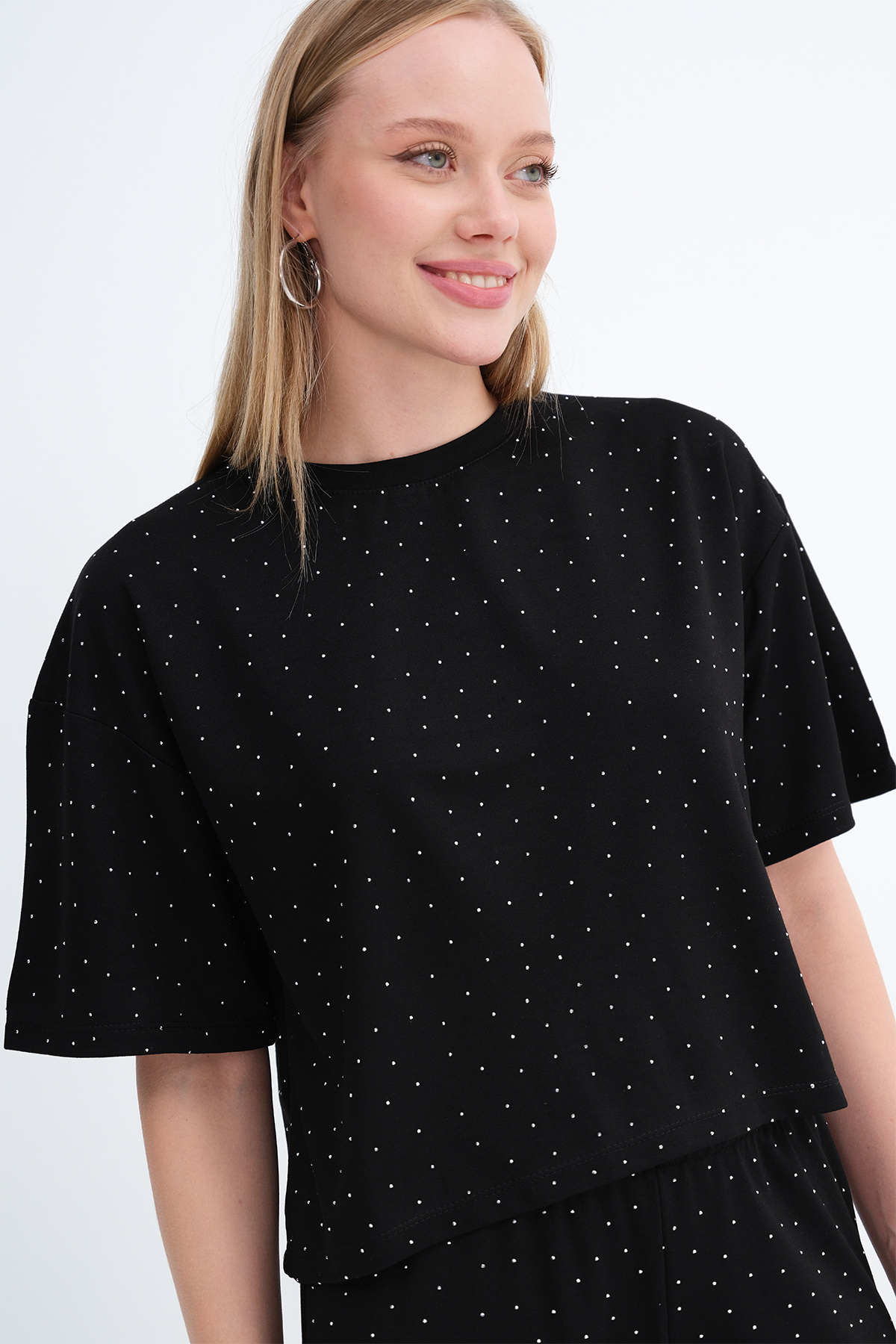 * Taşlı, düz renk, rahat kalıp t-shirt,