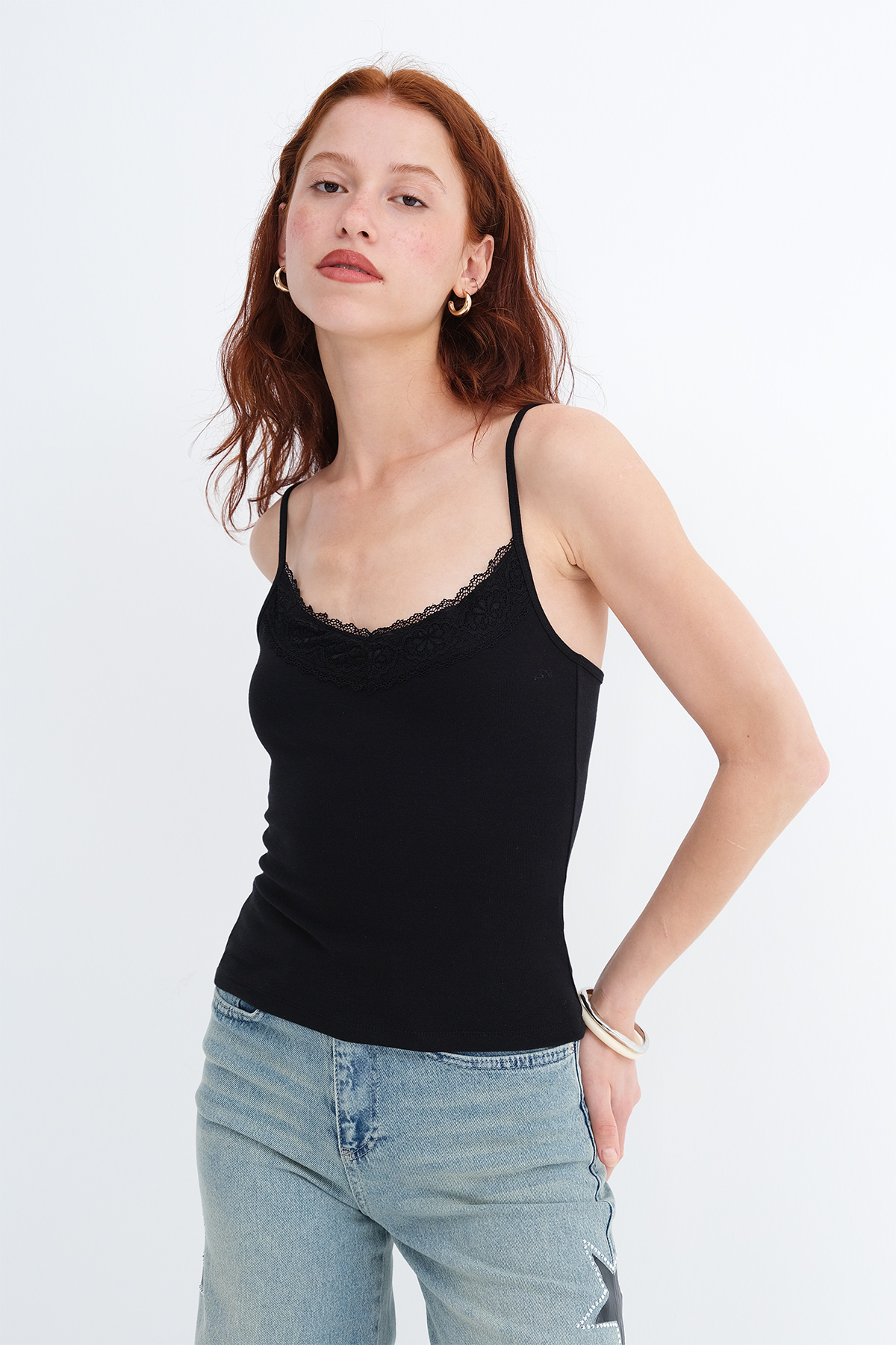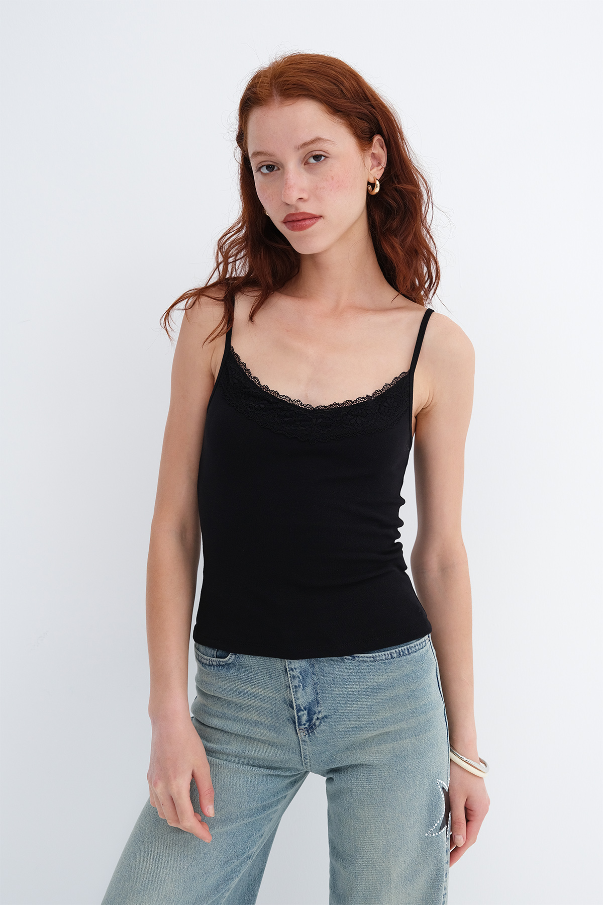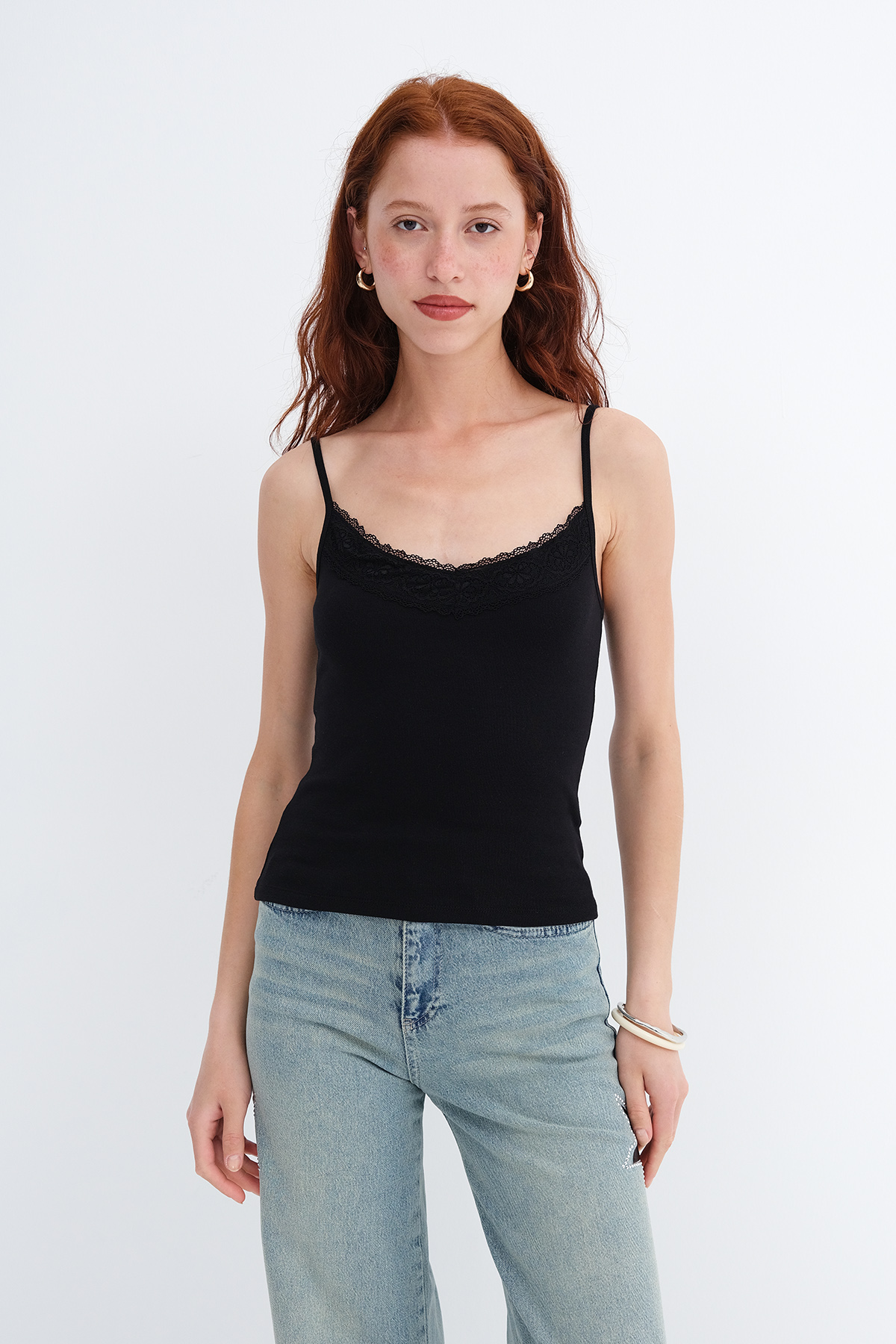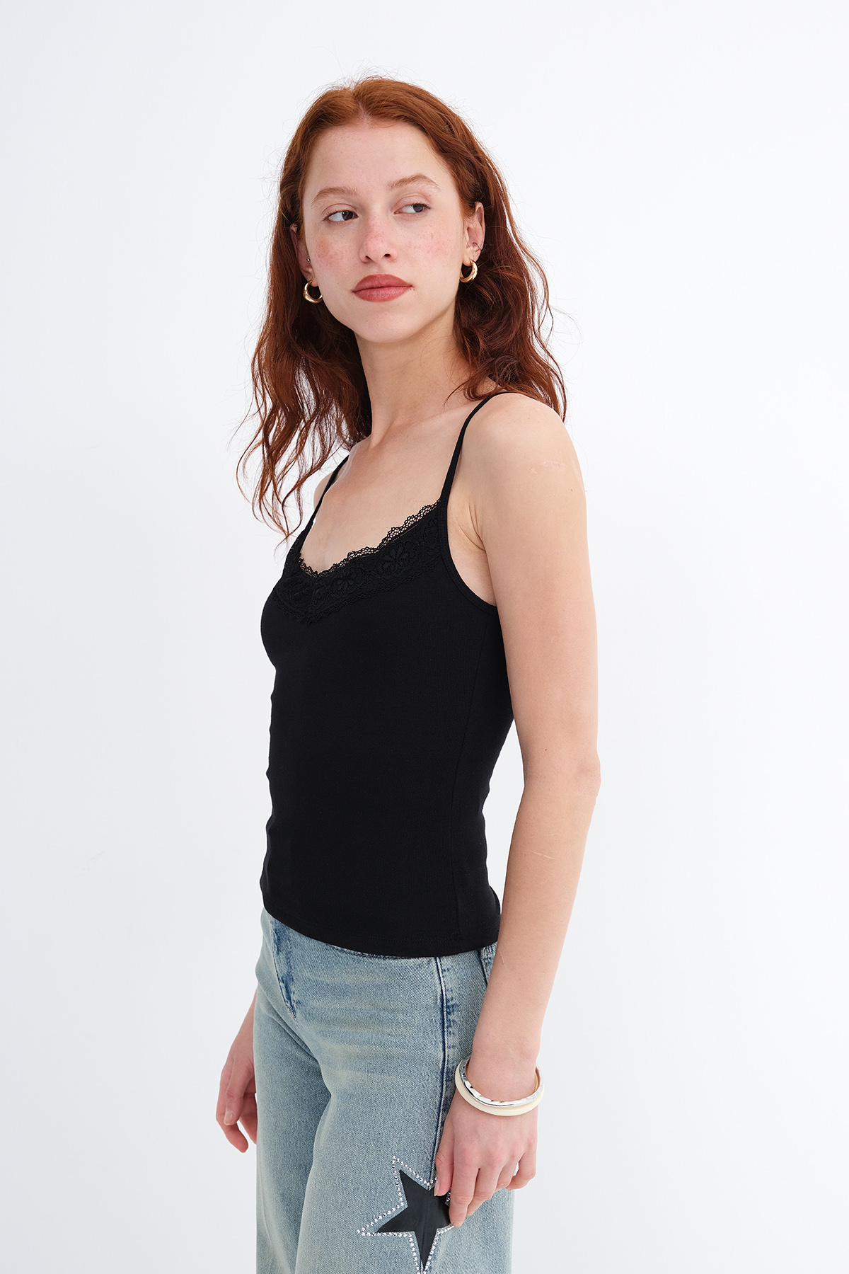 * Dantel detaylı, vücudu saran atlet,