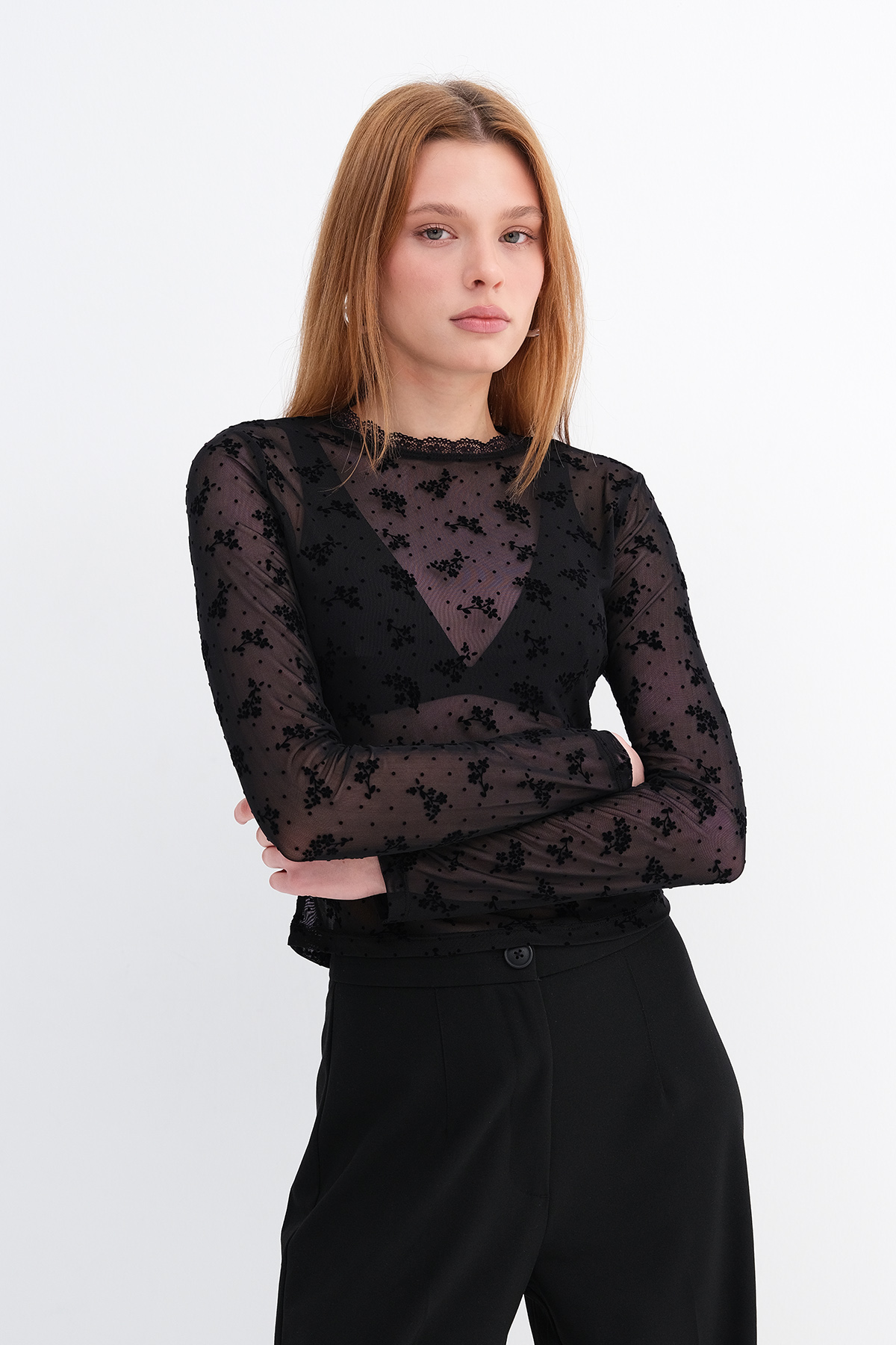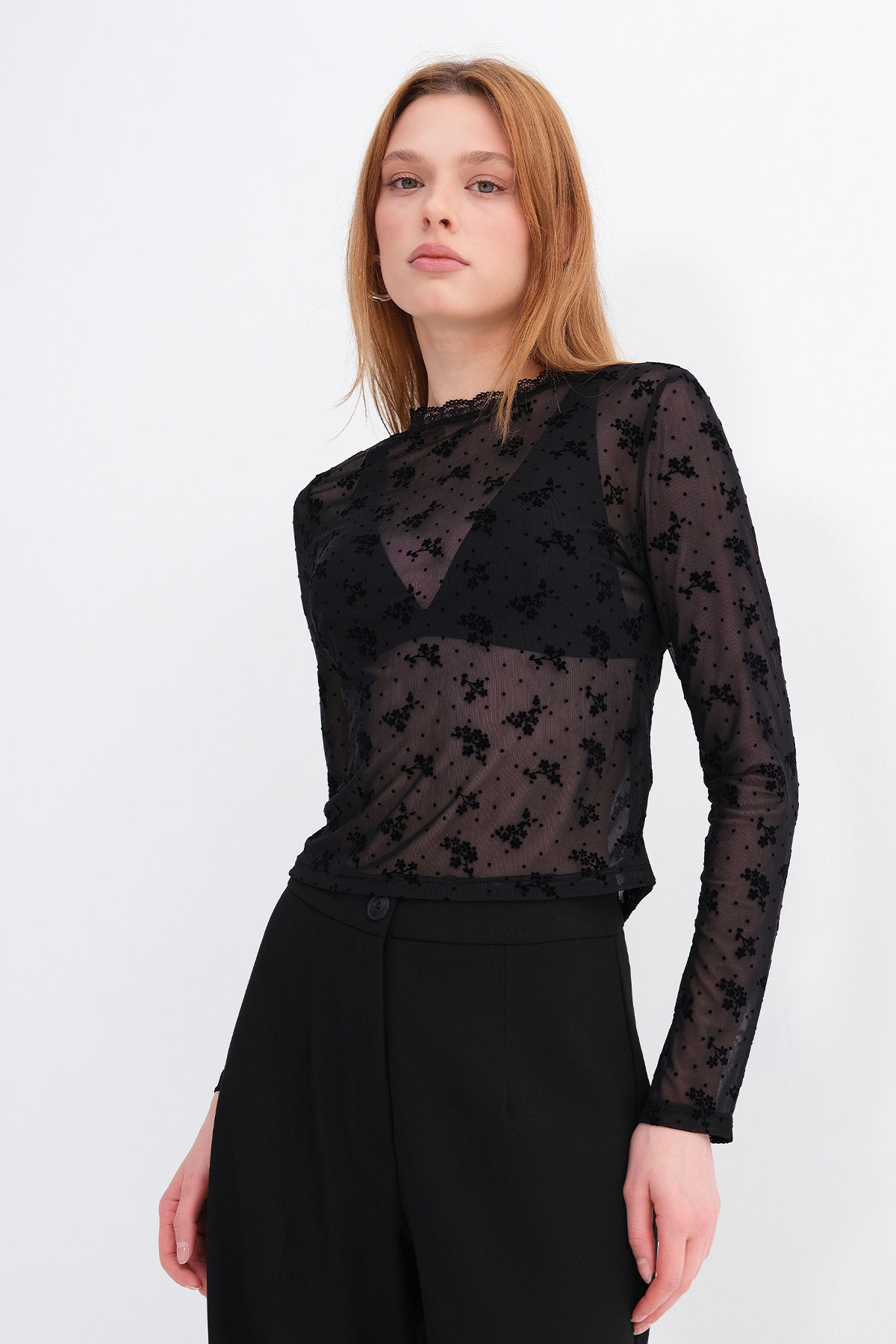 * Çiçek desenli, transparan bluz,