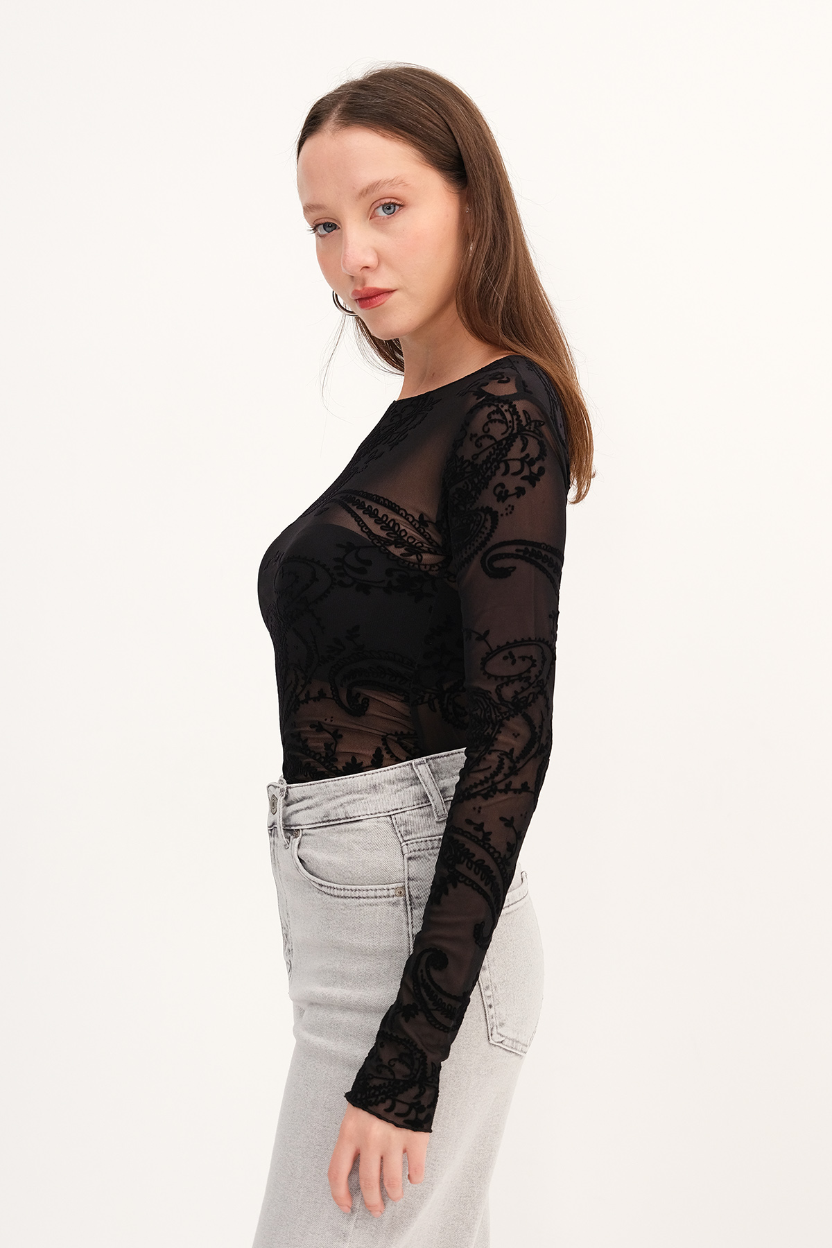 * Bisiklet yaka, uzun kollu,* Desenli, transparan, yanı büzgülü,* Tül bluz,* Ürün içeriği:%95 Polyester %5 Elastan,* Manken üzerindeki ürün 36/S bedendir.* Numune Beden Ölçüleri: Boy: 50 cm Göğüs: 66 cm Kol Boyu: 58 cm (1-3 cm arasında değişiklik gösterebilir)* Ürün çekimlerinde renkler, ışık farklılığından dolayı değişkenlik gösterebilir.