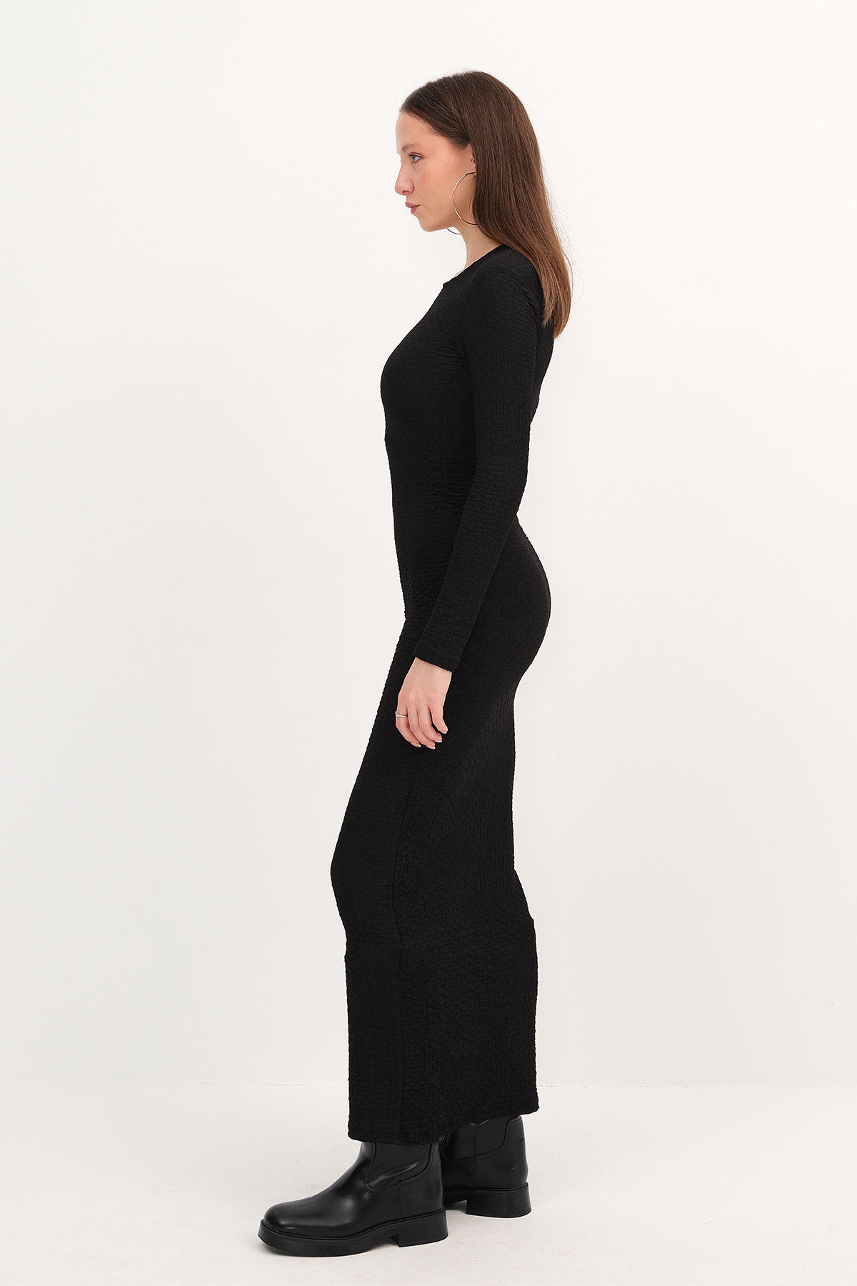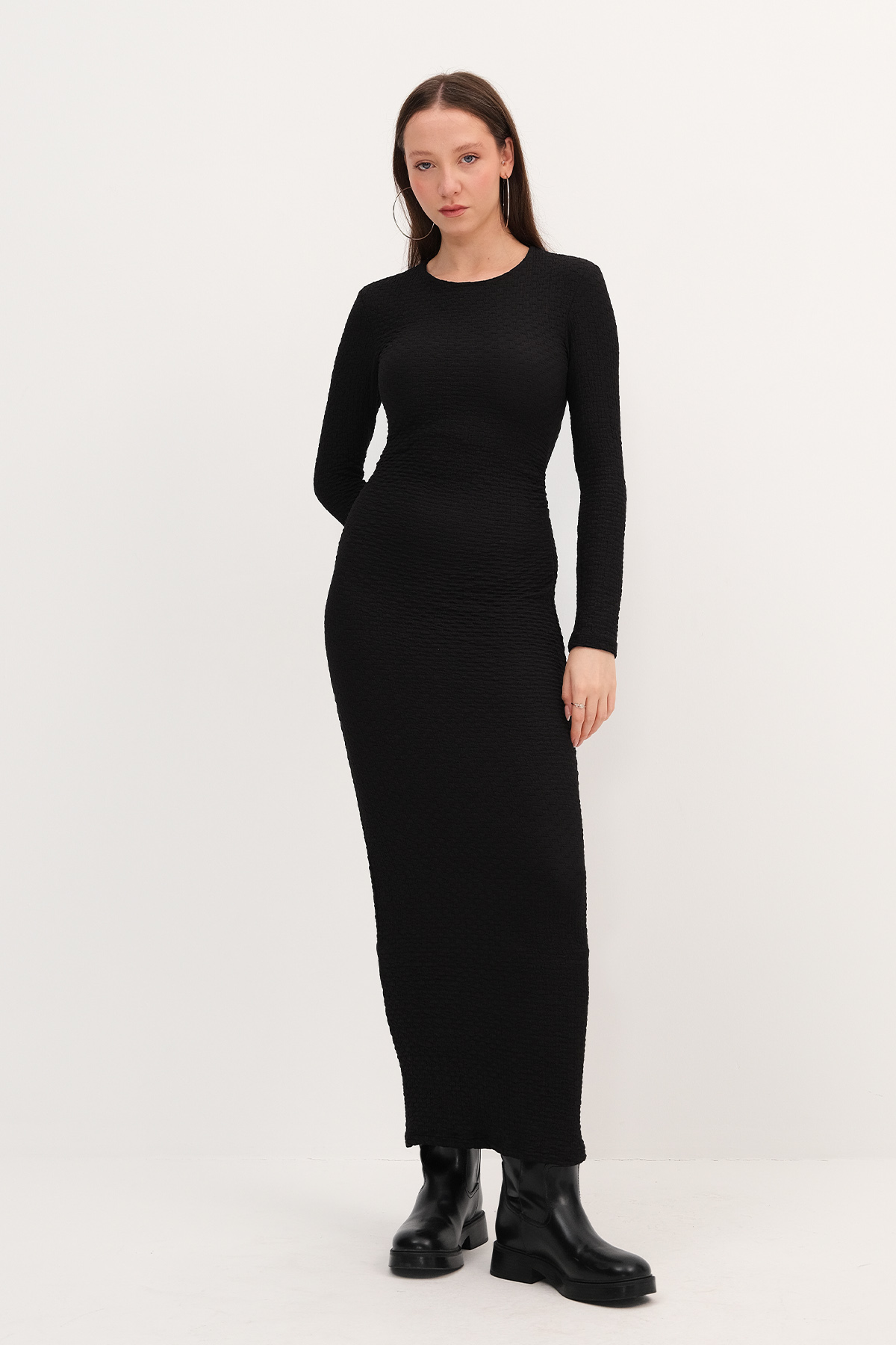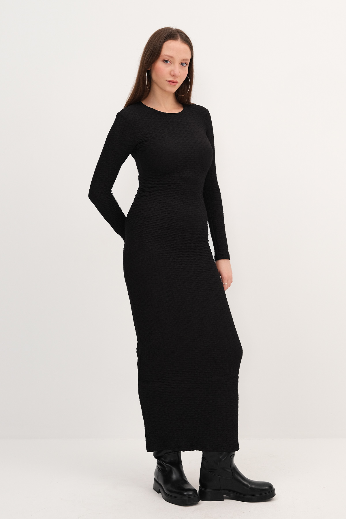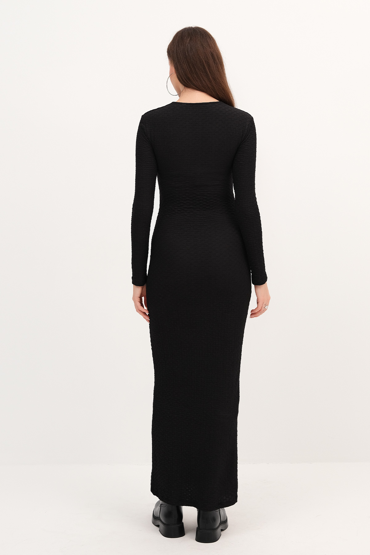 * Bisiklet yaka, uzun kollu,* Vücudu saran, düz renk,* Dokulu, büzgülü,* Astarsız uzun elbise,* Ürün içeriği: %90 Polyester %10 Elastan* Manken üzerindeki ürün 36/S bedendir.* Numune beden ölçüleri: Boy: 133 cm Göğüs: 33 cm Kol boyu: 57 cm (1-3 cm değişiklik gösterebilir)* Ürün çekimlerinde renkler, ışık farklılığından dolayı değişkenlik gösterebilir.