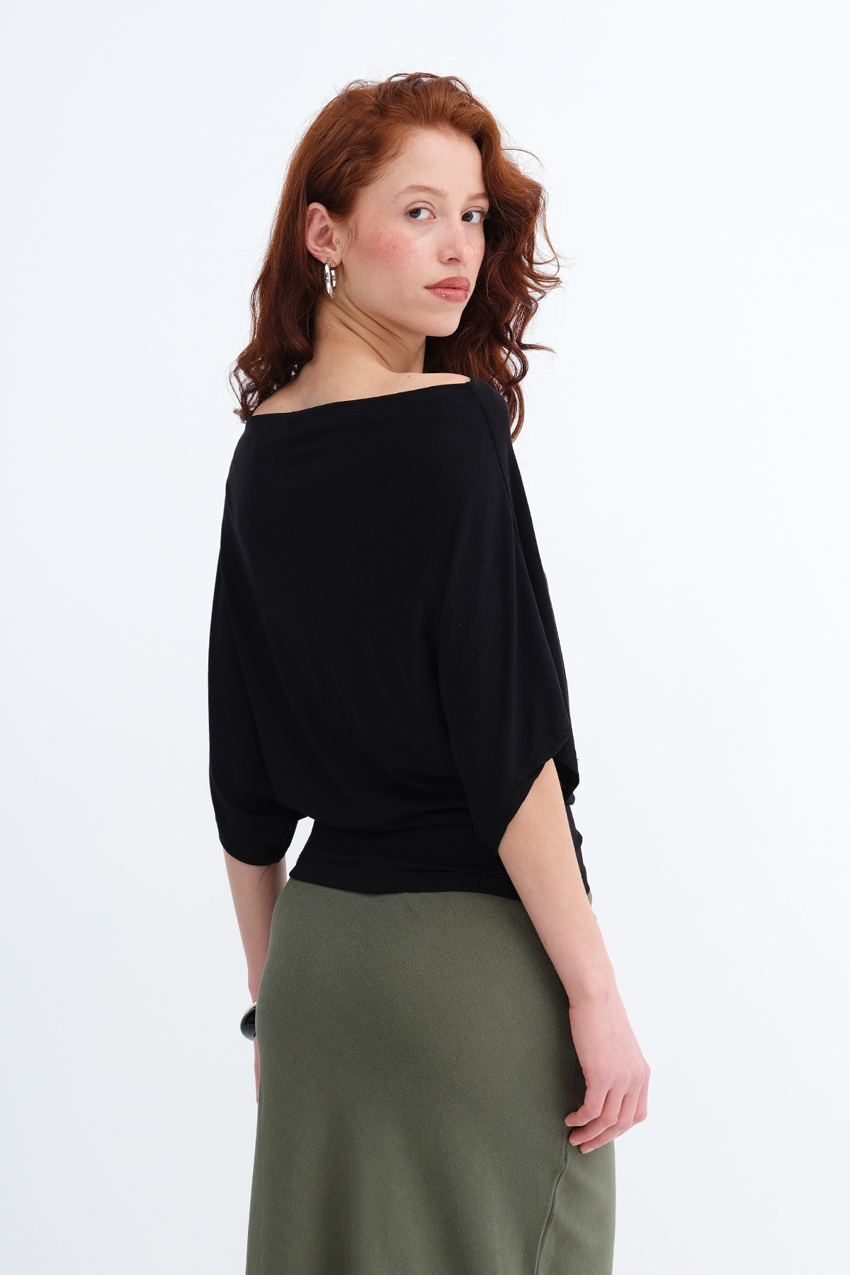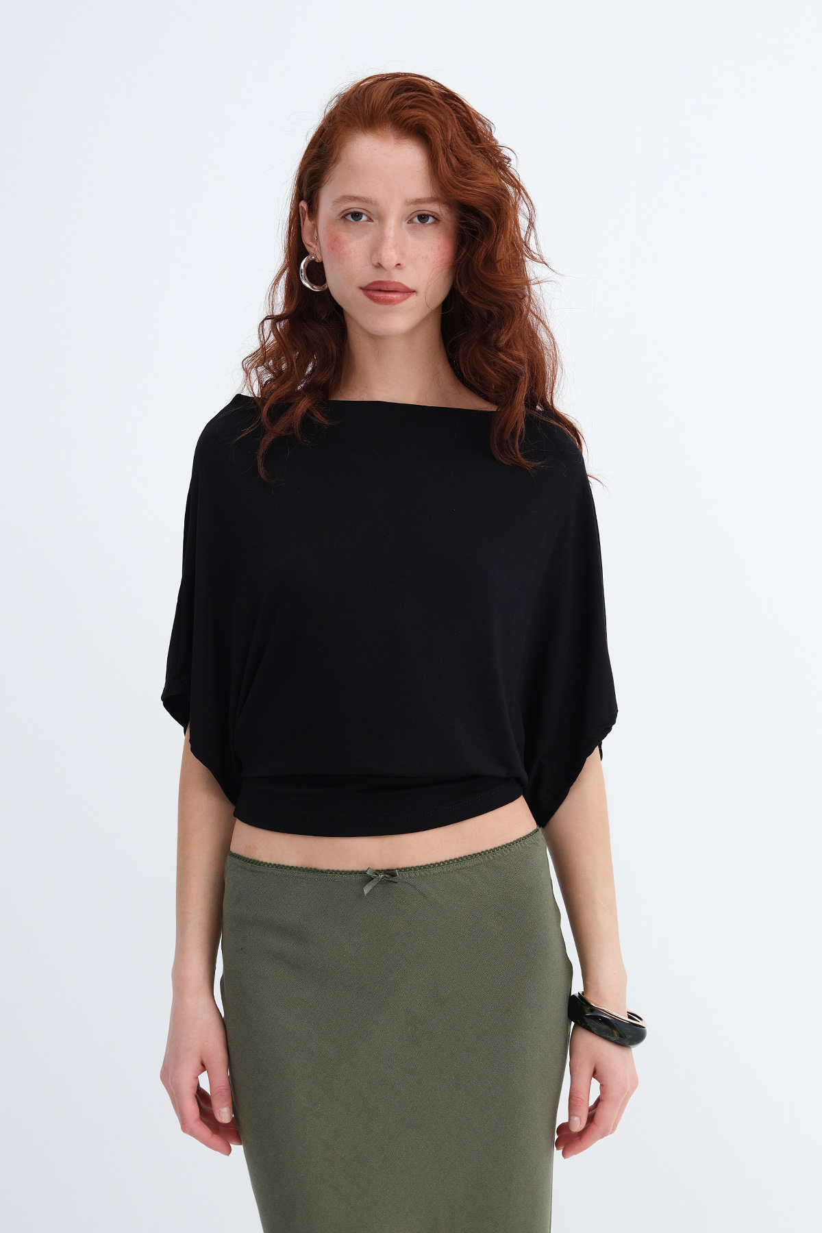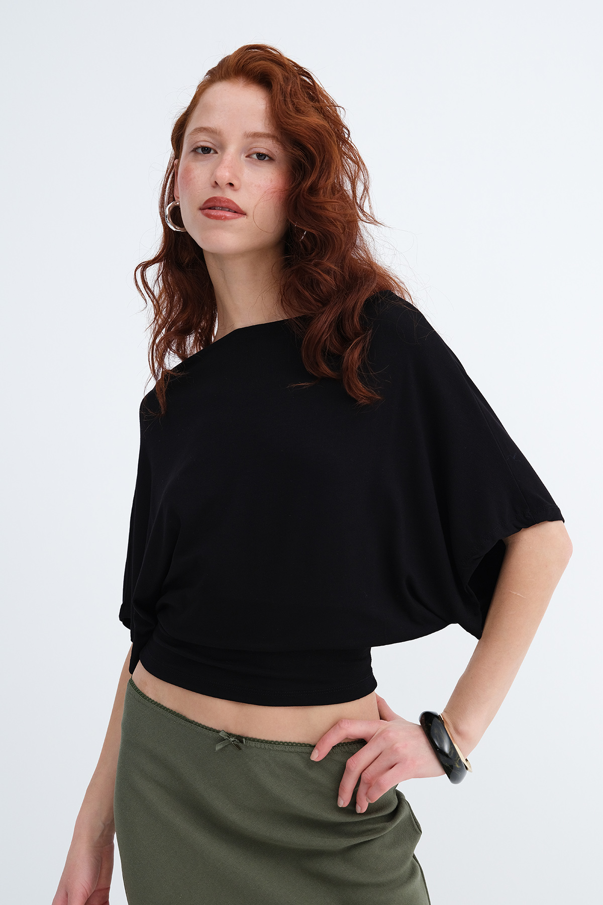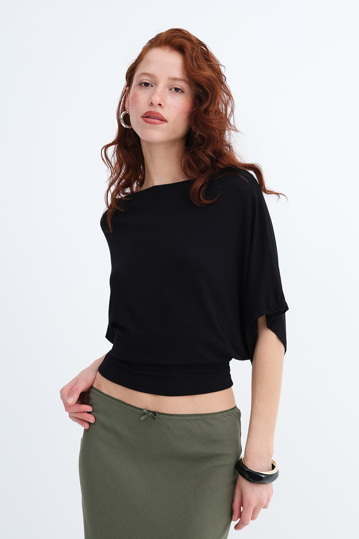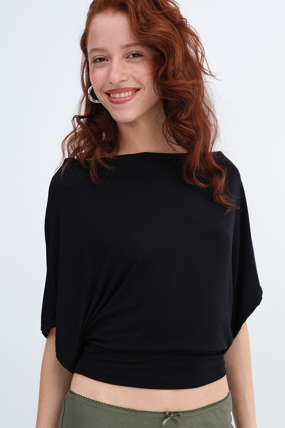 * Kayık yaka, kısa kollu, düz renk,