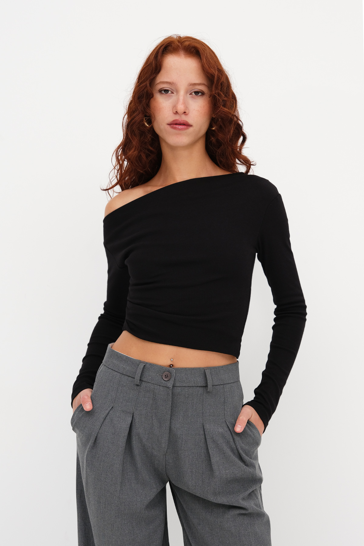 * Kayık yaka, uzun kollu, etek ucu asimetrik kesim,