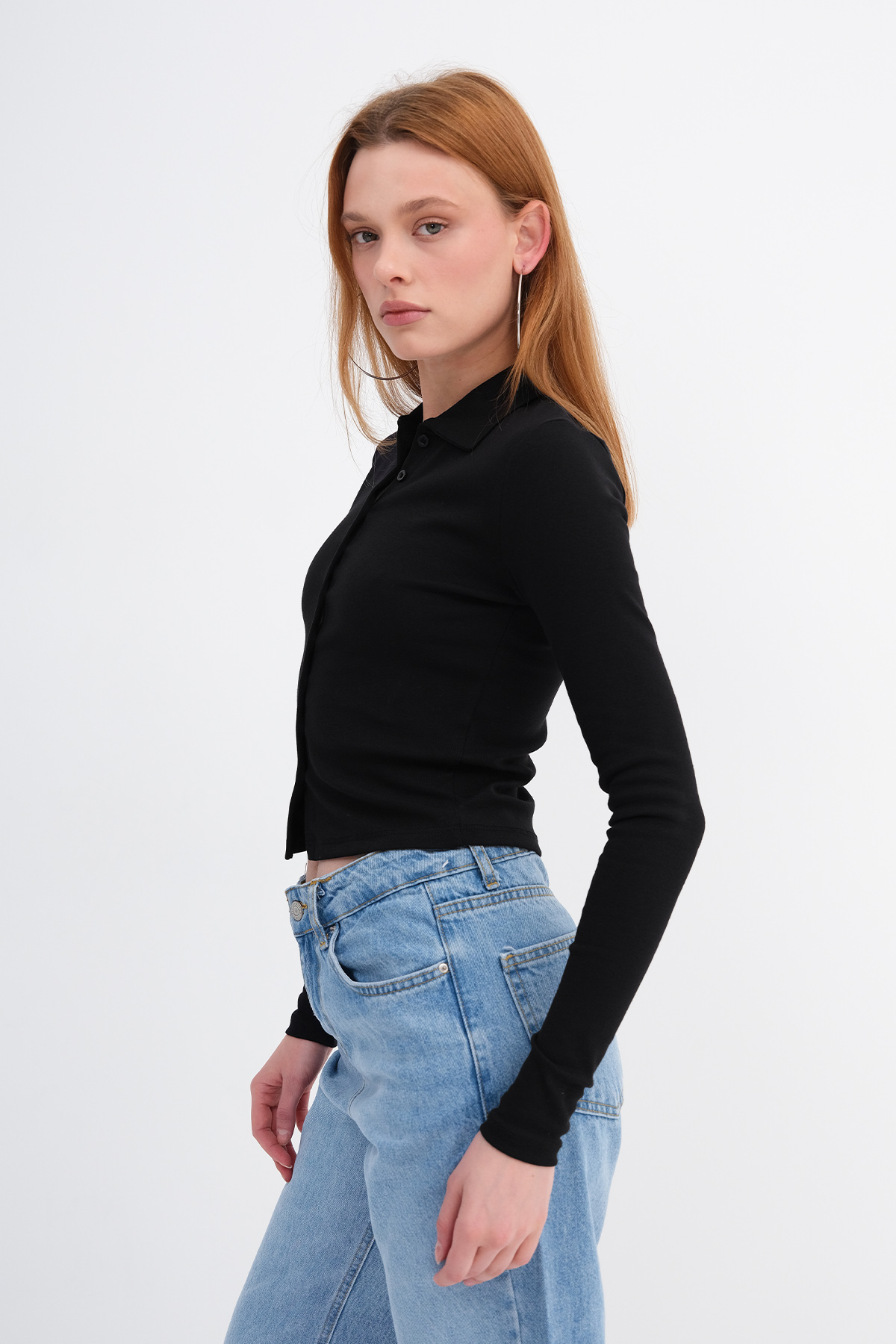 * Polo yaka, uzun kollu, düğmeli,