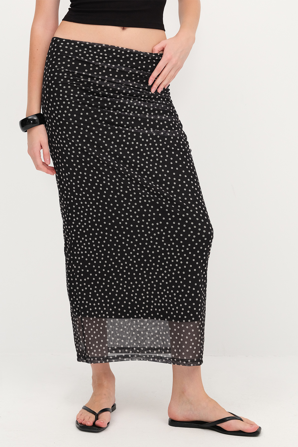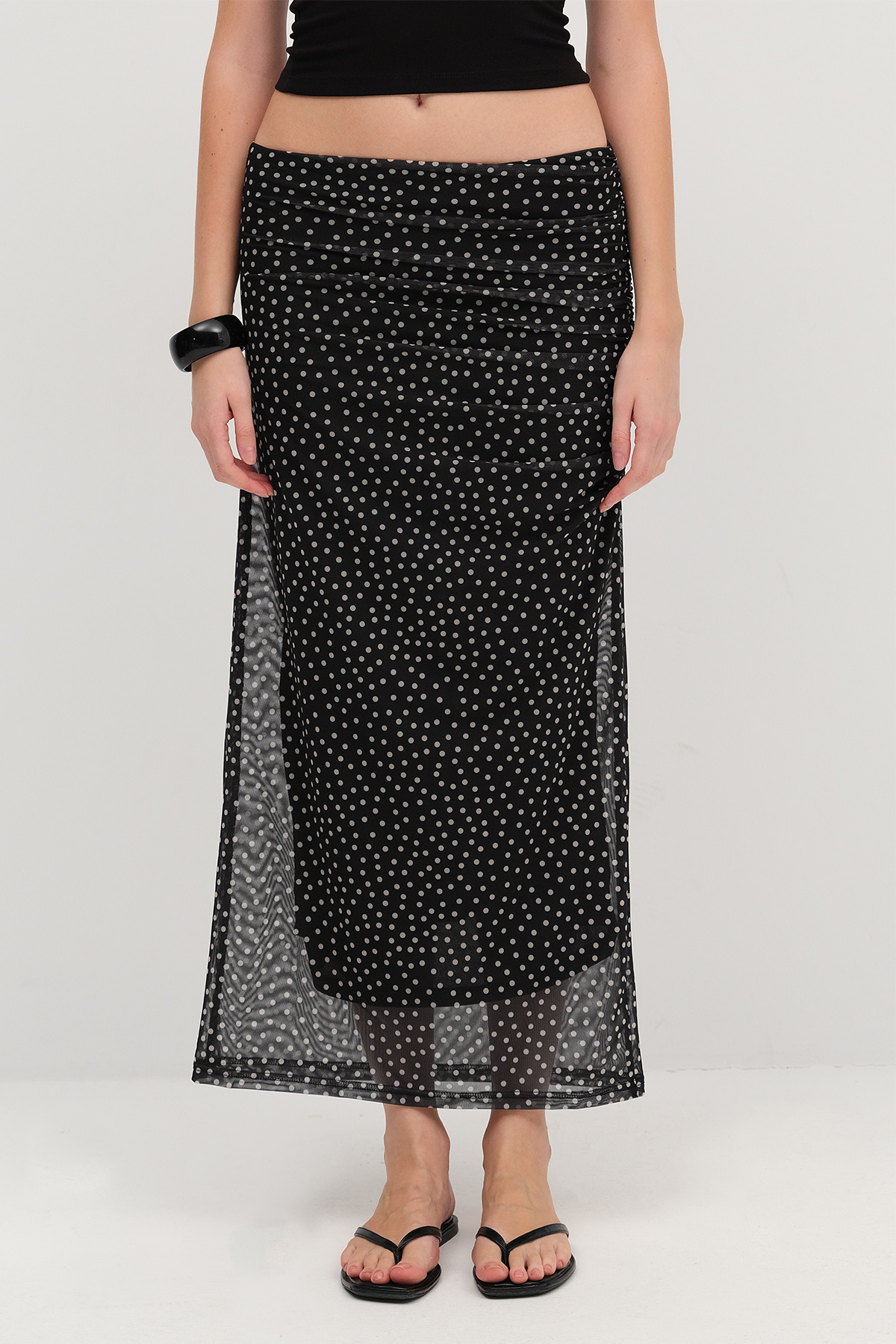 * Büzgülü, puantiyeli, astarlı, midi etek,