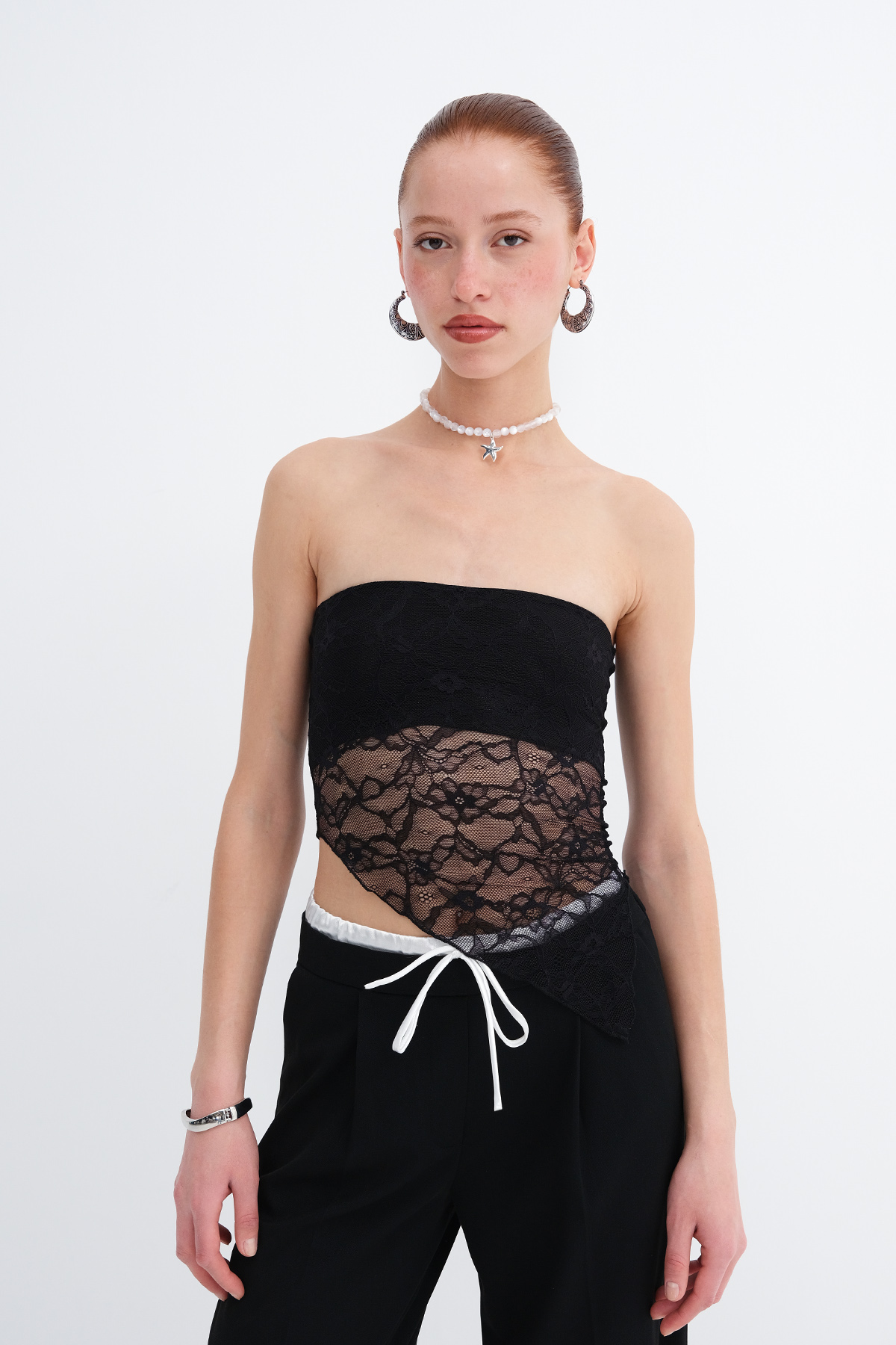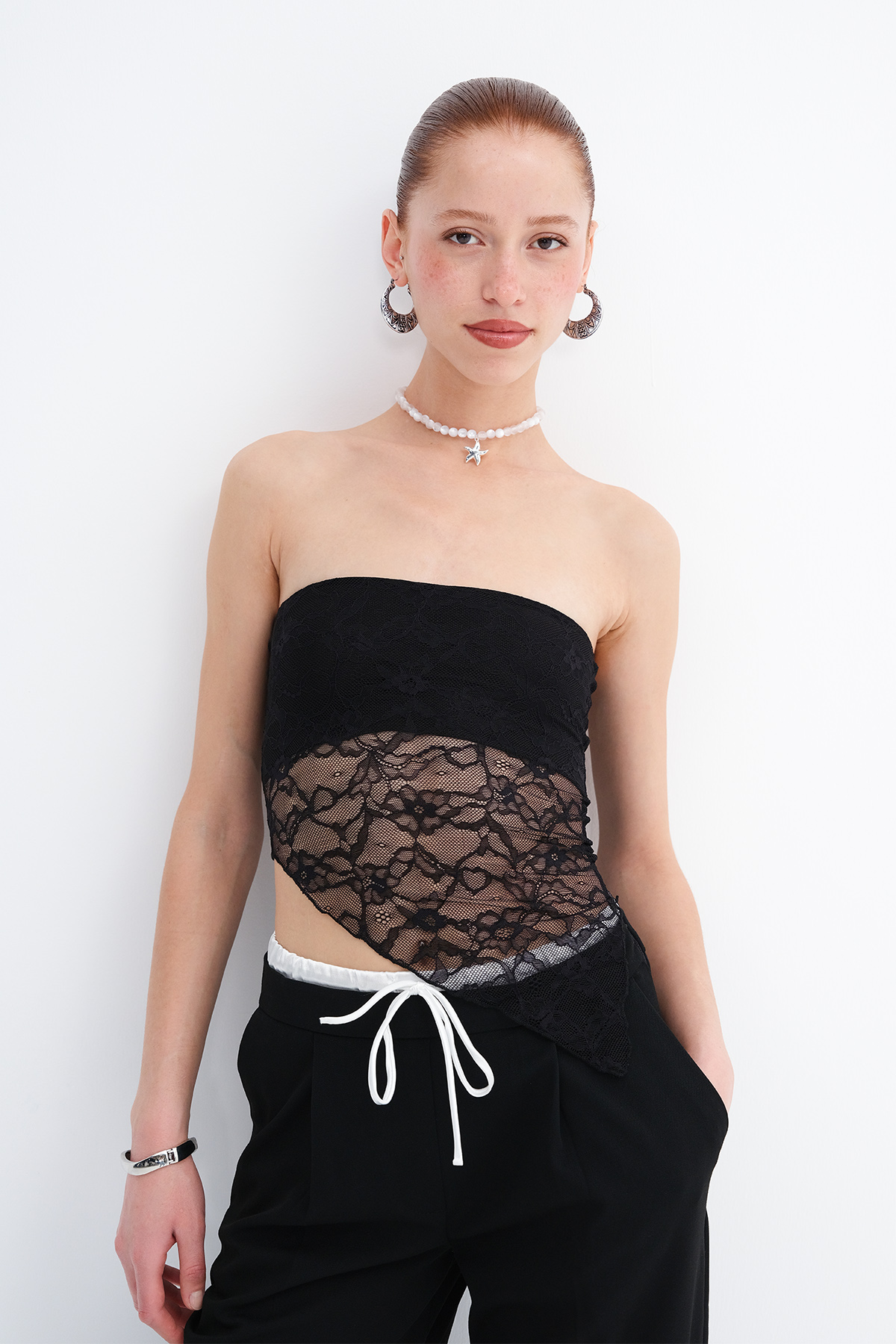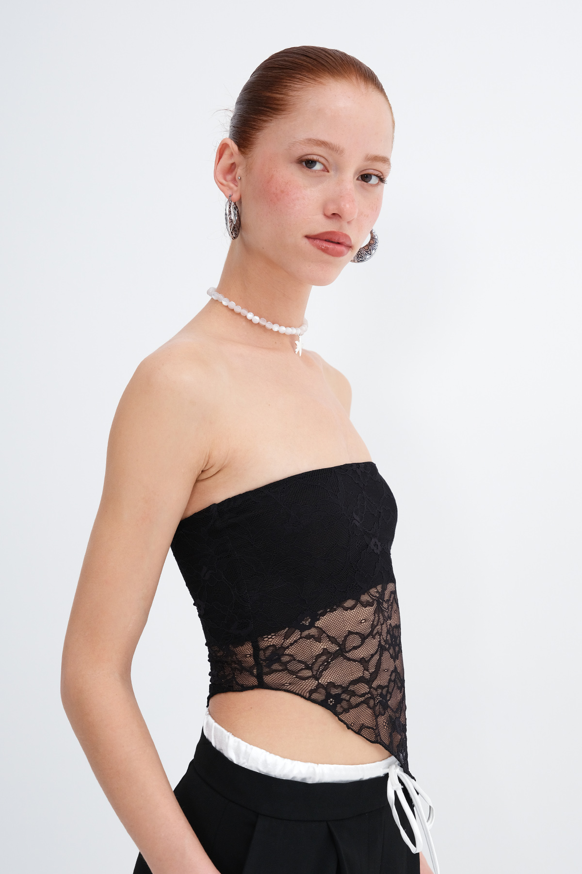 * Dantelli, asimetrik kesim, crop büstiyer,