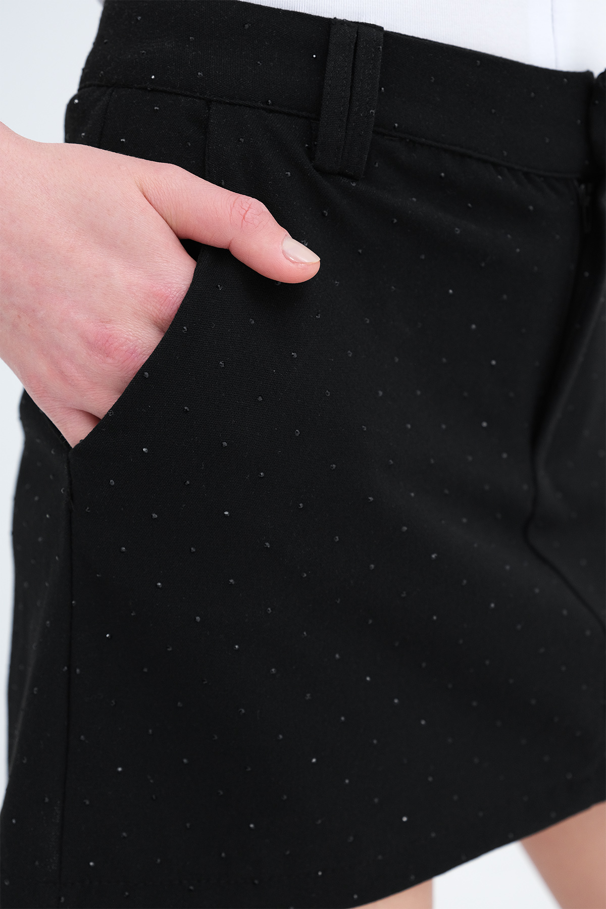 * Taşlı, astarı şortlu, mini etek,