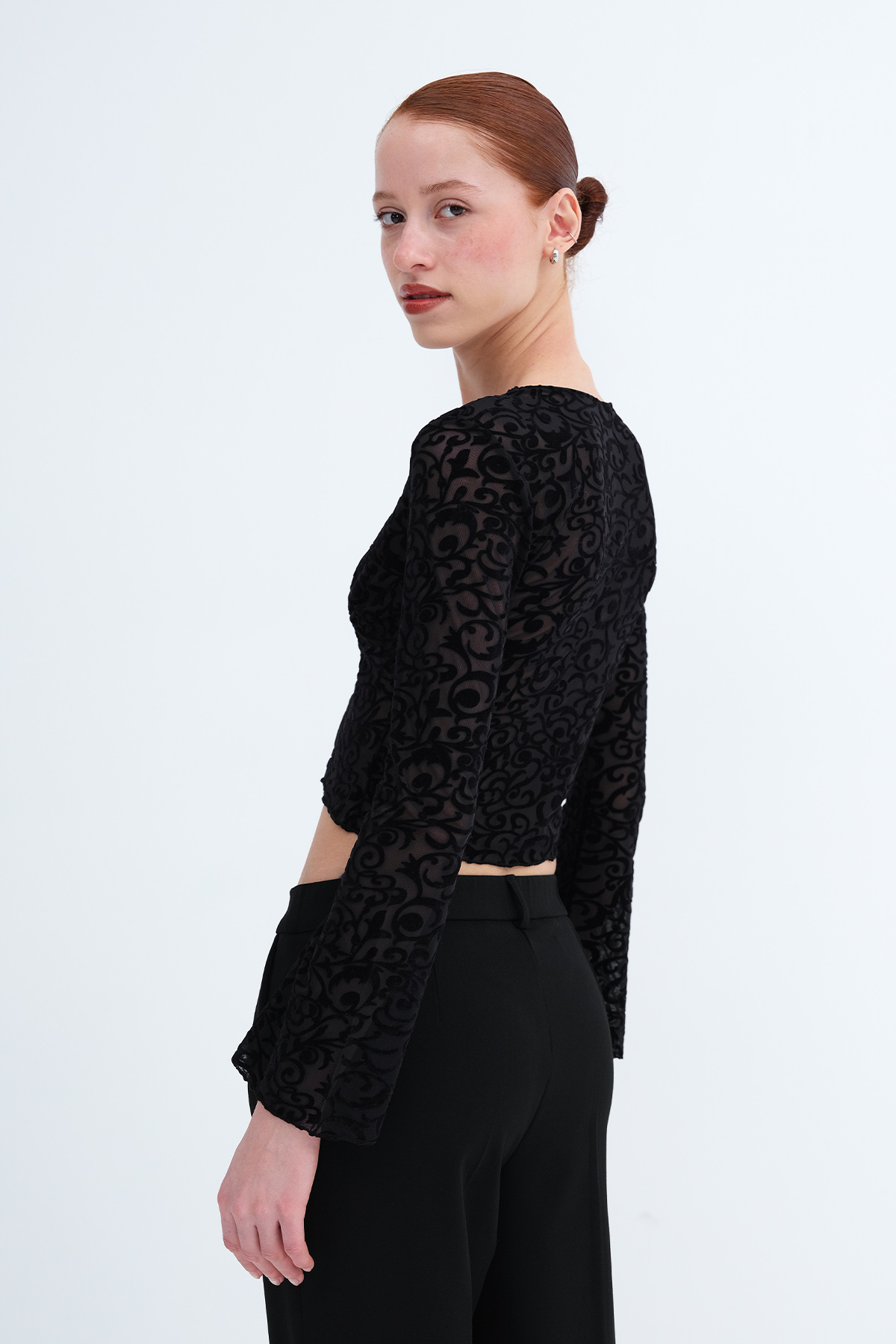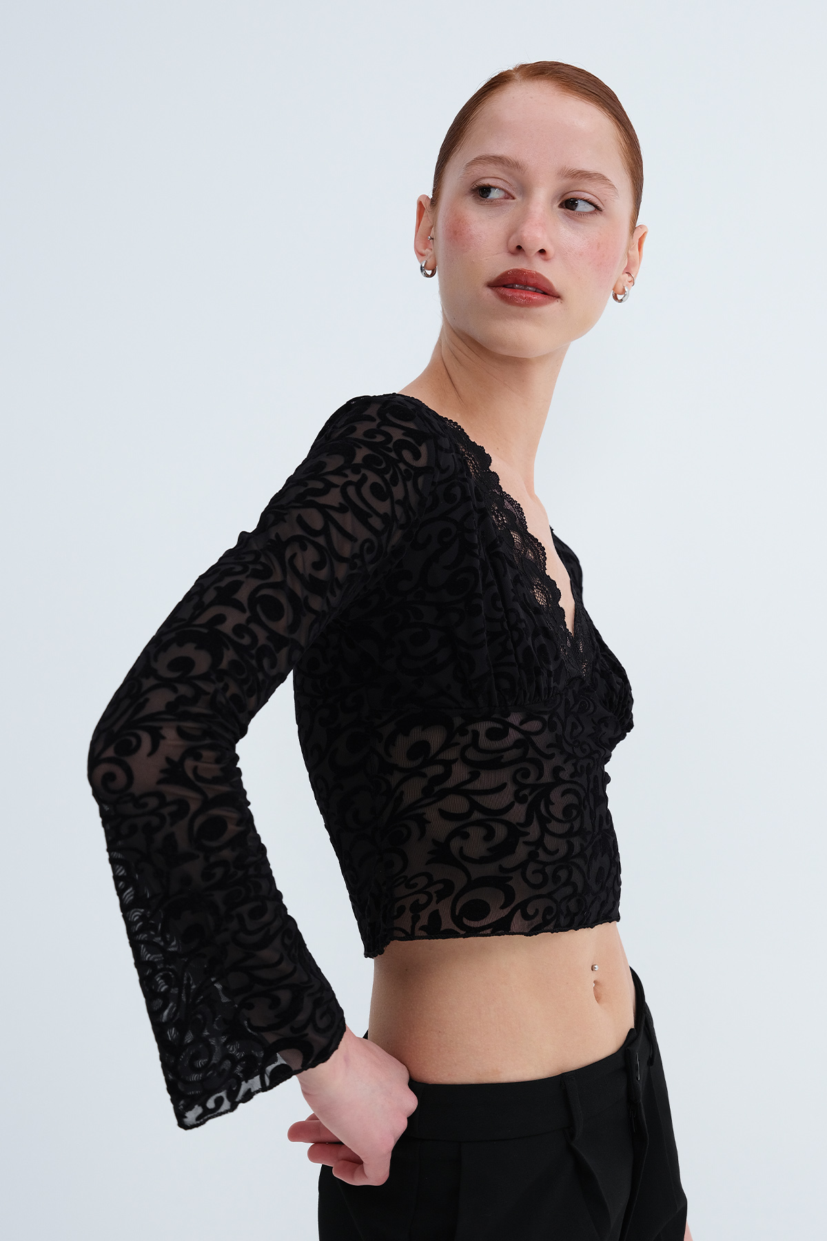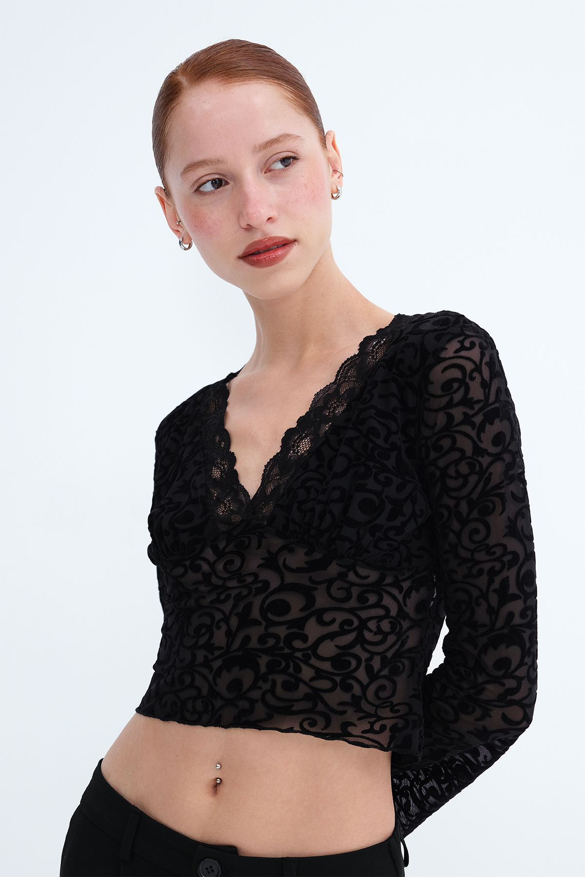 * V yaka, yakası dantel detaylı, uzun kollu,