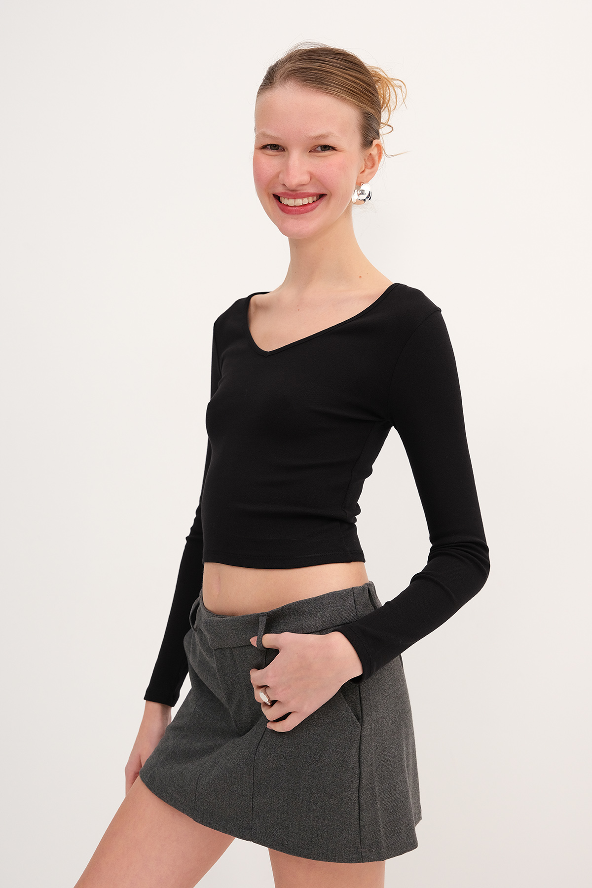 * V yaka, uzun kollu,* Düz renk, vücudu saran bluz,* Ürün içeriği: %95 Pamuk %5 Elastan,* Manken üzerindeki ürün 36/S bedendir.* Numune Beden Ölçüleri: Boy: 46 cm Göğüs: 66 cm Kol Boyu: 58 cmt (1-3 cm arasında değişiklik gösterebilir)* Ürün çekimlerinde renkler, ışık farklılığından dolayı değişkenlik gösterebilir.