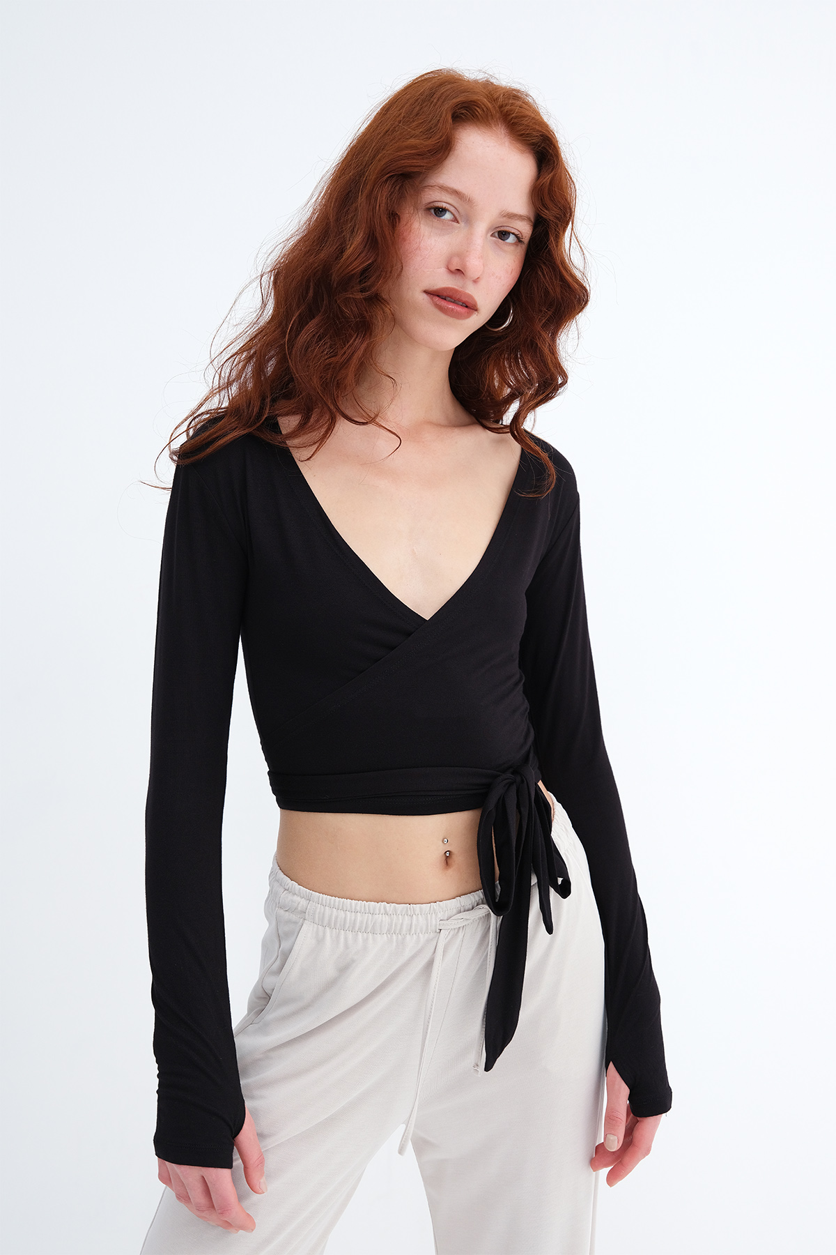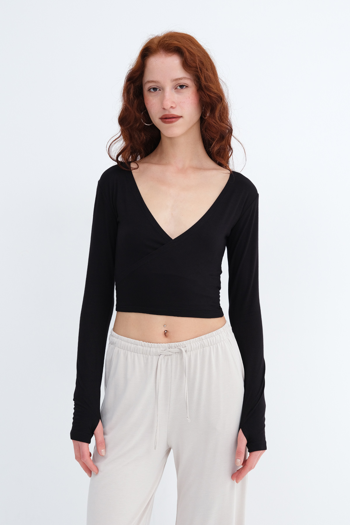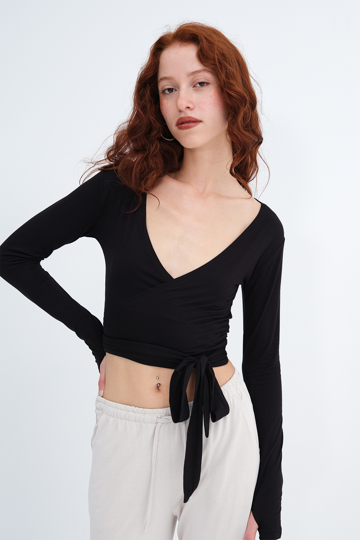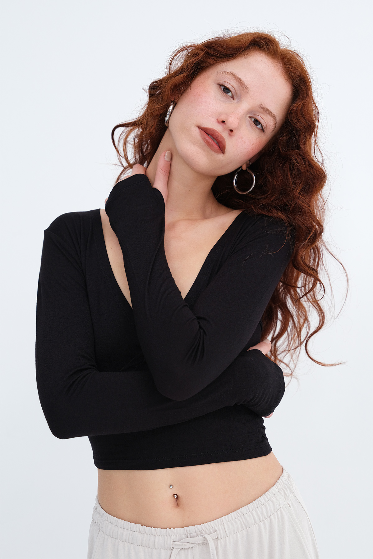 * V yaka, uzun kollu, parmak geçirmeli,