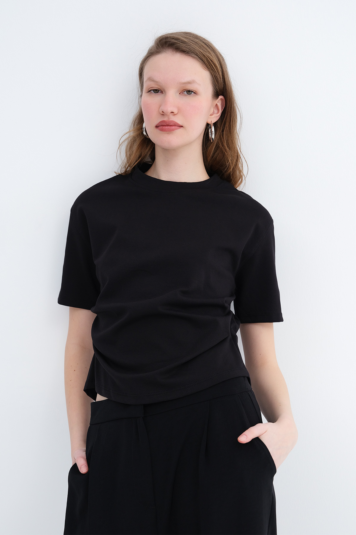 * Yanı büzgülü, düz renk t-shirt,