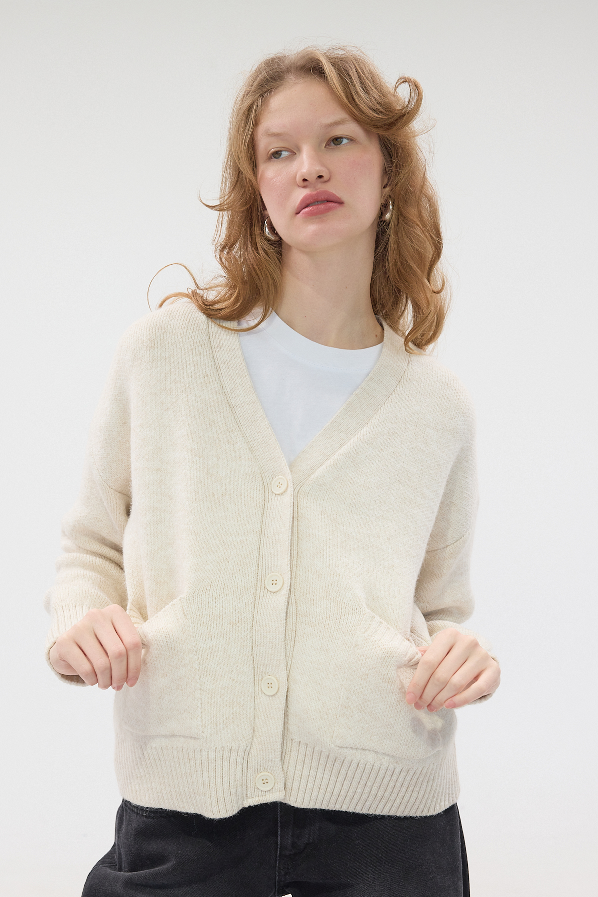 * V yaka, uzun kollu, düşük omuz, düz renk, düğmeli, çift cepli,