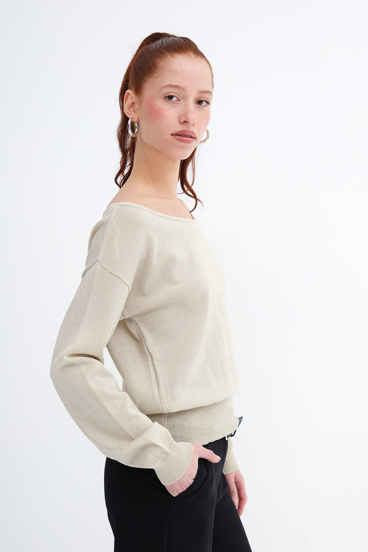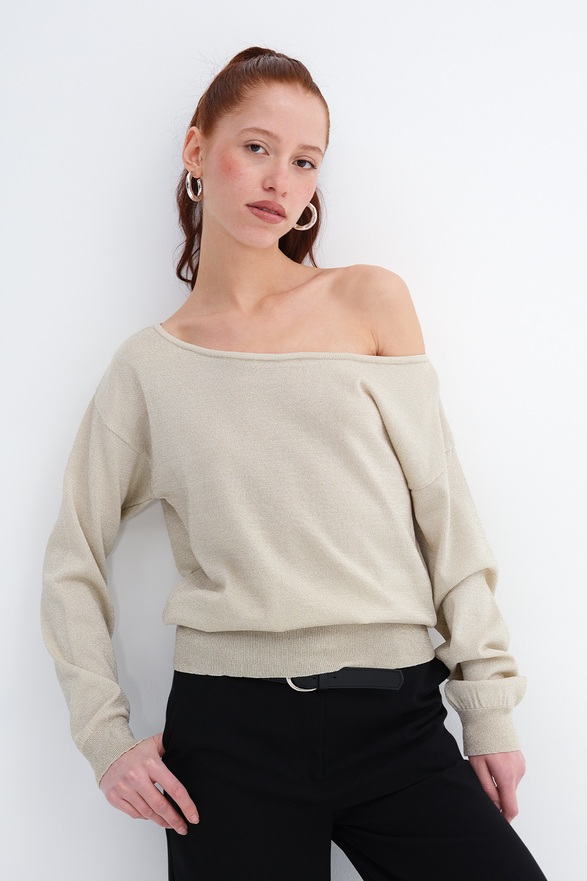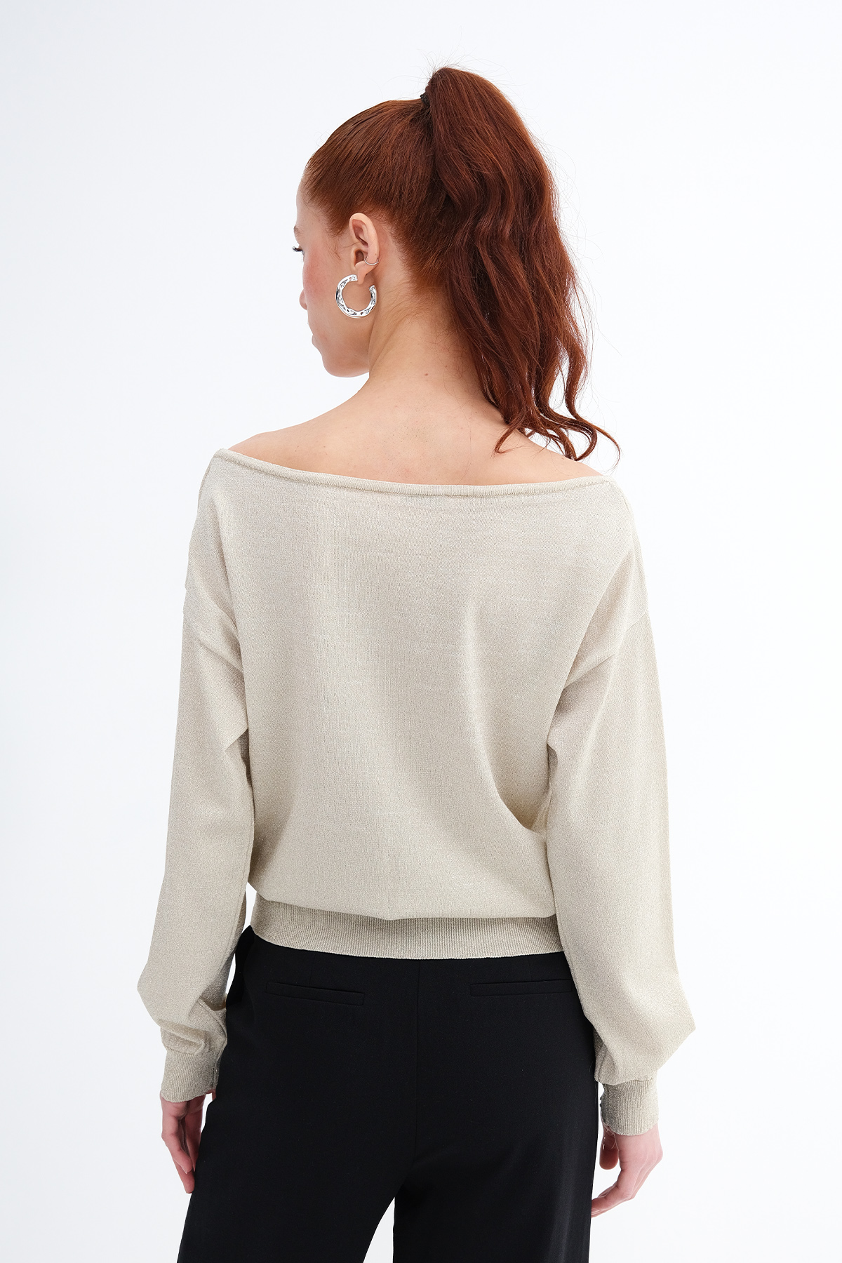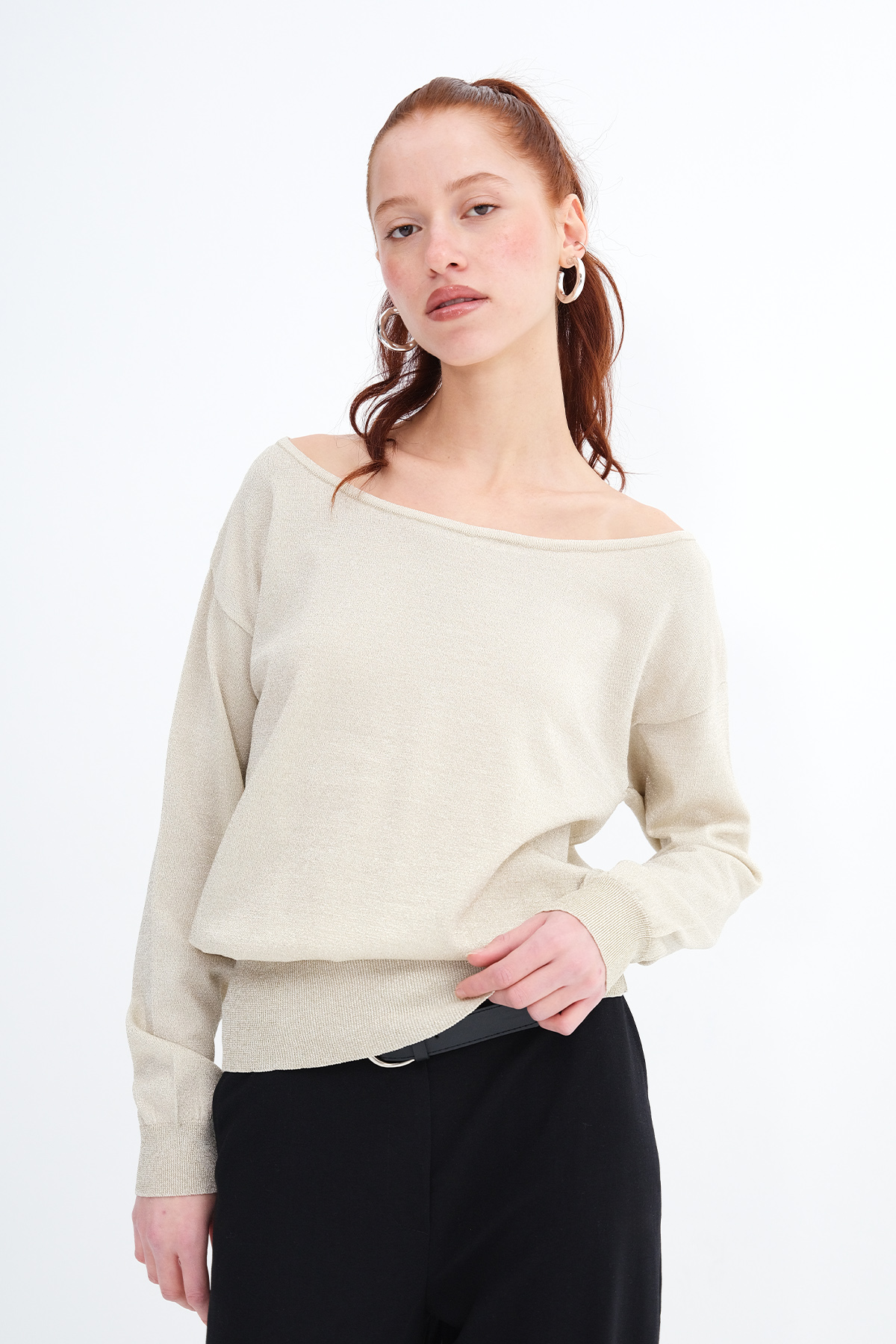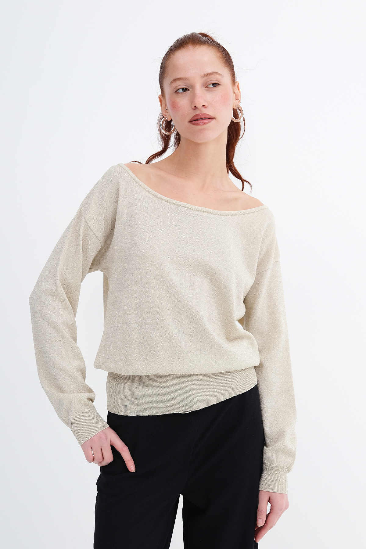 * Kayık yaka, uzun kollu, düşük omuz,