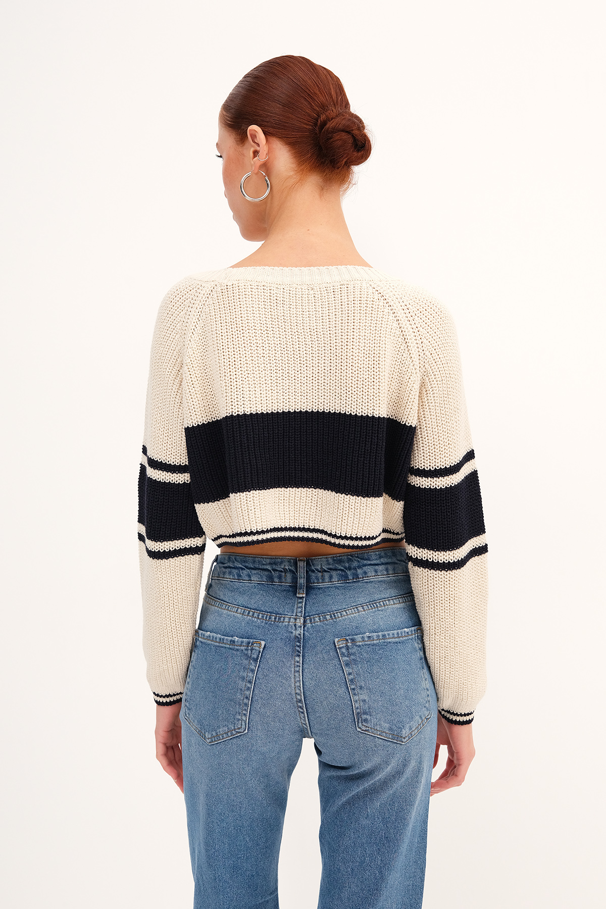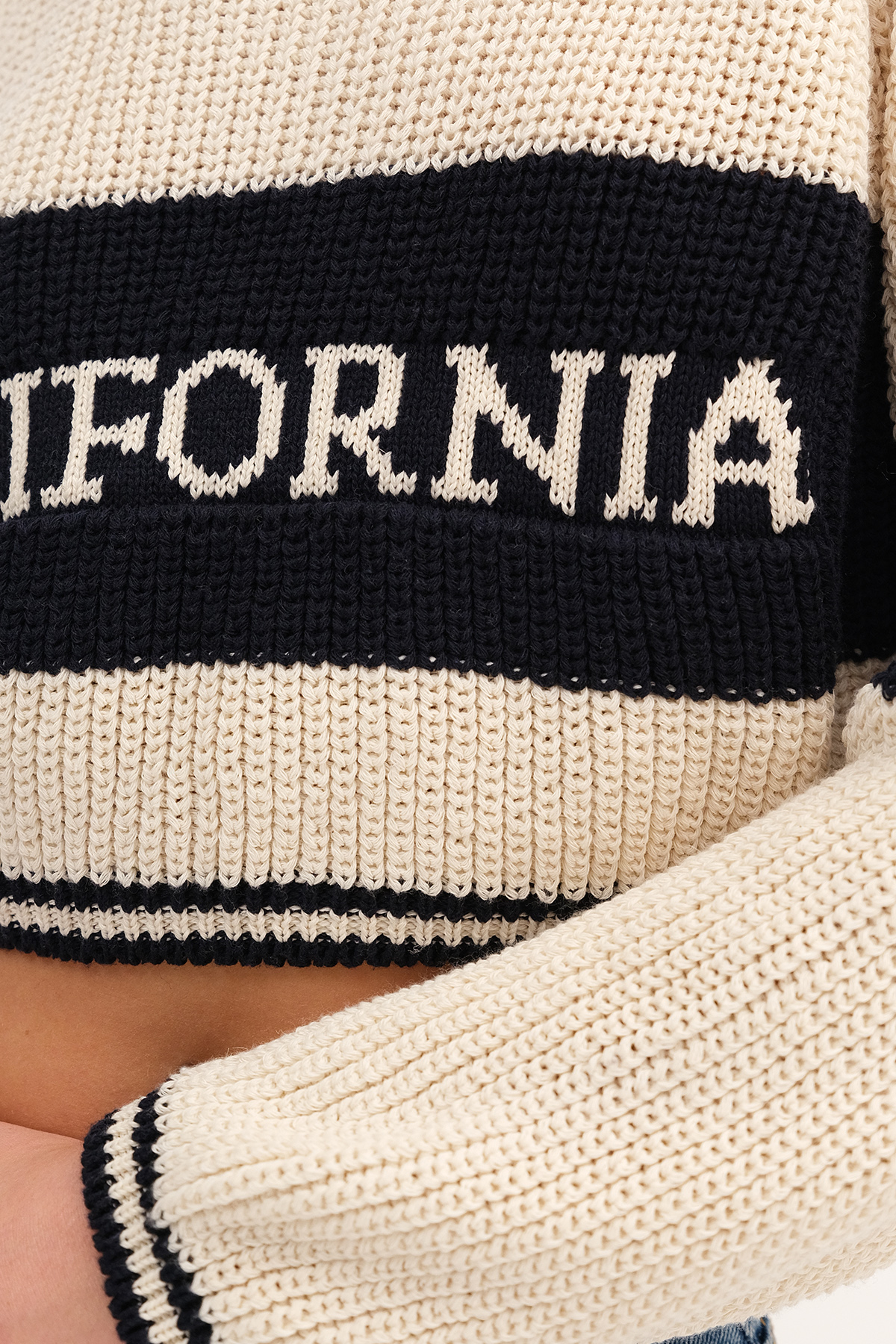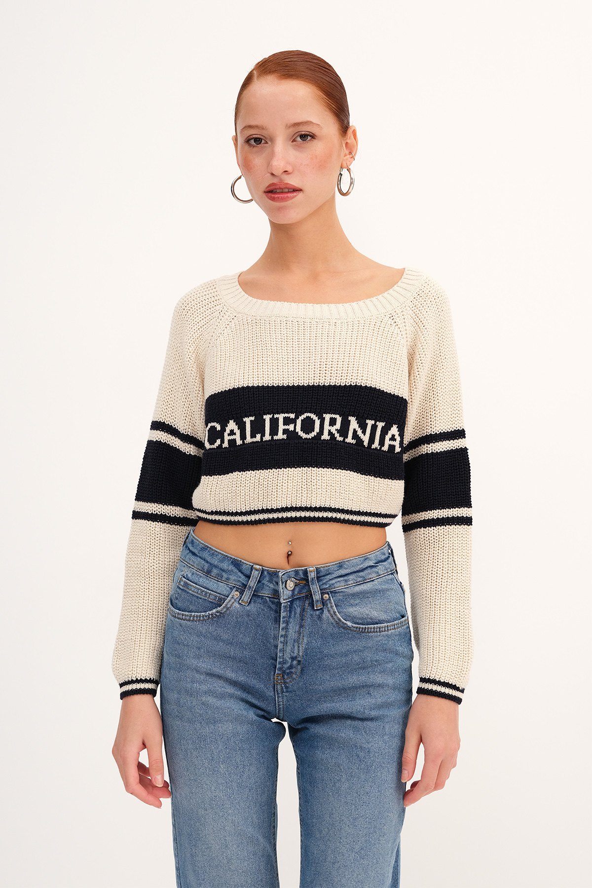 * Bisiklet yaka, uzun kollu,* California yazılı, şeritli,* Lastik örgülü, crop triko,* Ürün içeriği: %60 Pamuk %40 Polyester* Manken üzerindeki ürün standart bedendir.* Numune beden ölçüleri: Boy: 49 cm Göğüs:80 cm Kol boyu: 58 cm (1-3 cm değişiklik gösterebilir)* Kol boyu omuzdan ölçülmüştür.* Ürün çekimlerinde renkler, ışık farklılığından dolayı değişkenlik gösterebilir.