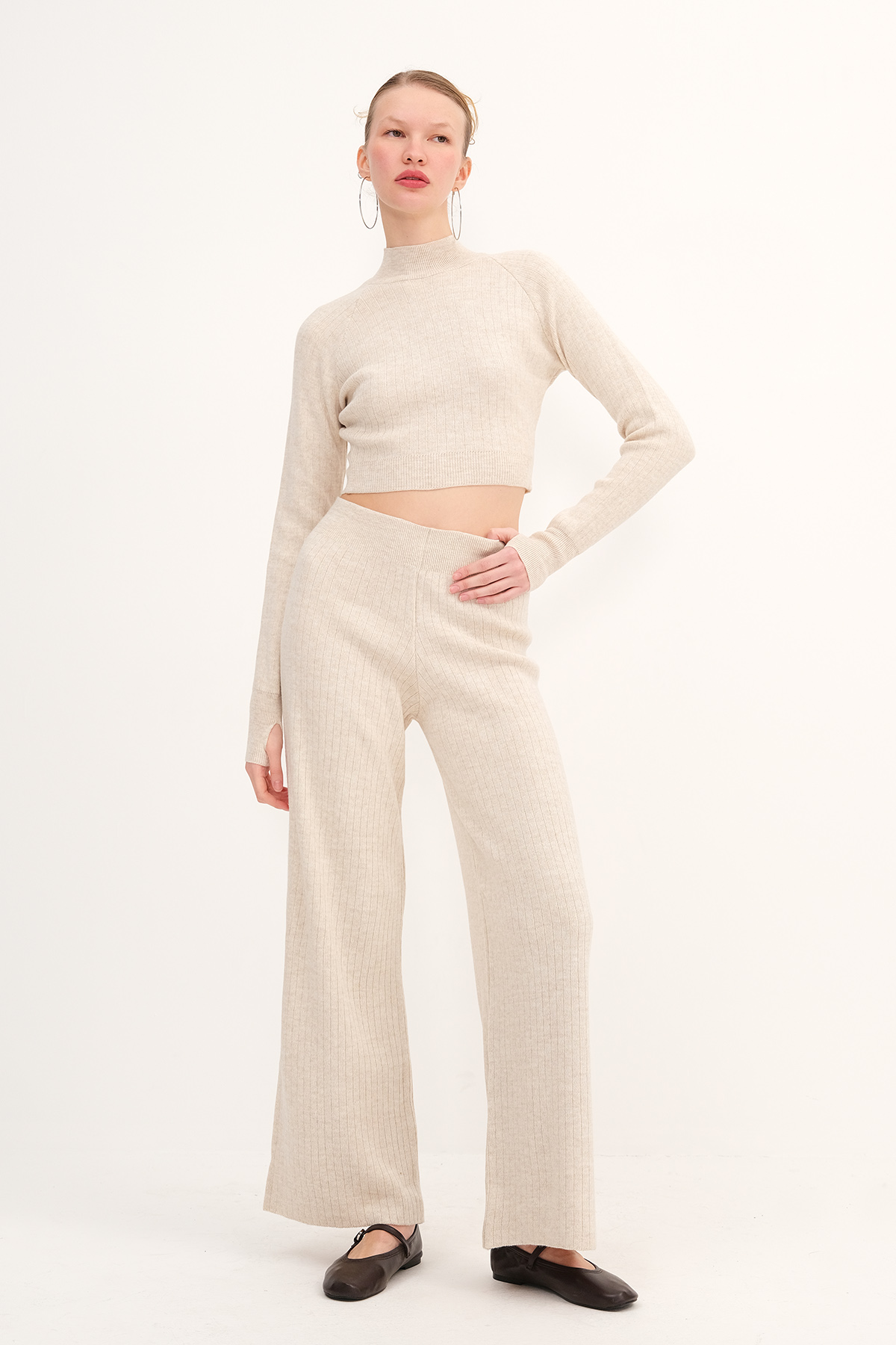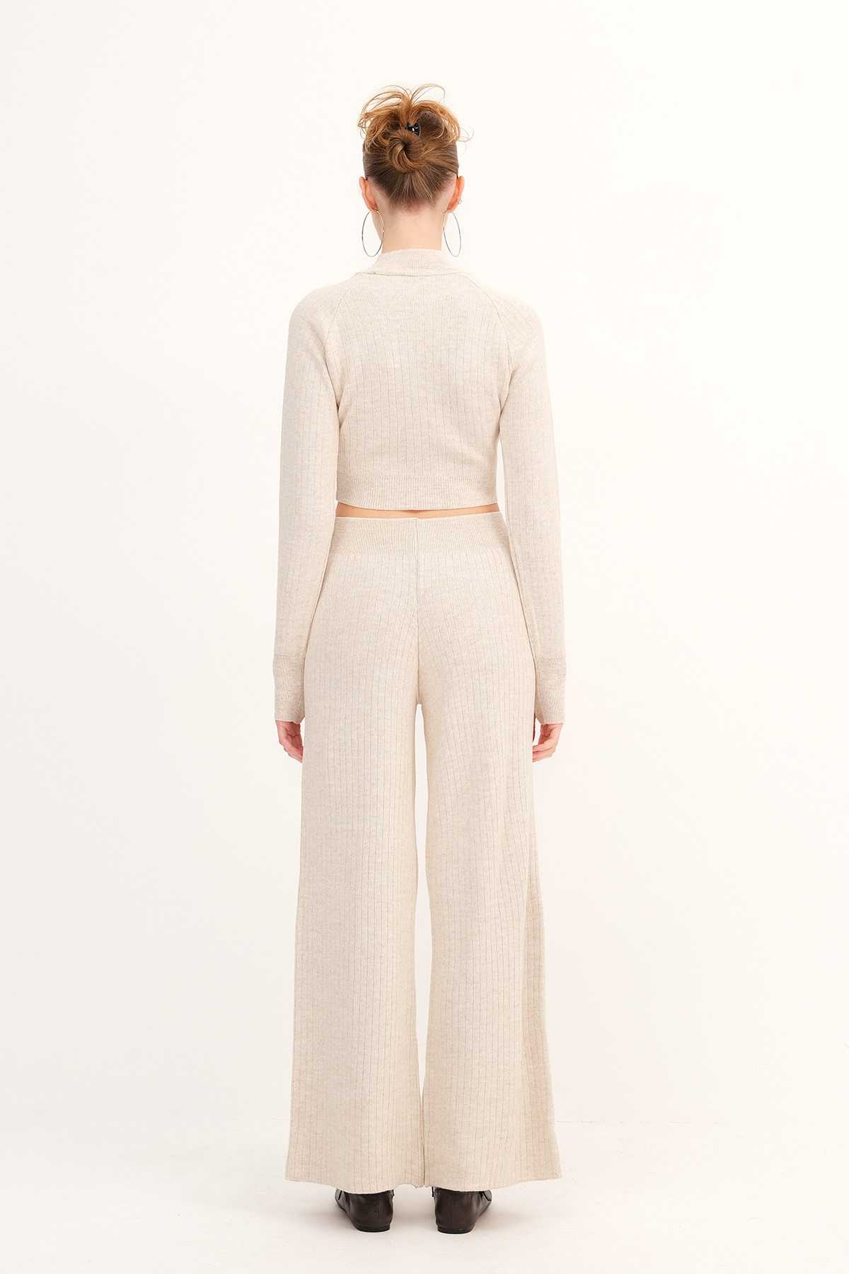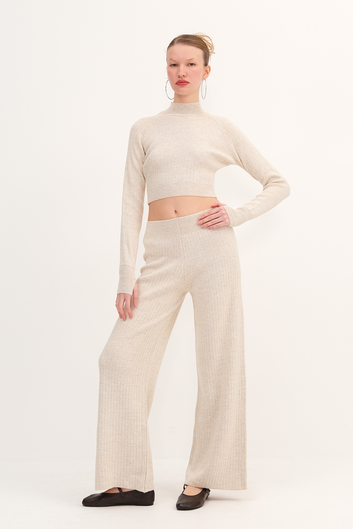 * Dik yaka, uzun kollu,* Manşetleri ve etek ucu lastik örgülü,* Baş parmak geçrimeli,* Düz renk,* Beli lastikli, yüksek bel,* Wide leg pantolon,* Ürün içeriği: %100 Akrilik* Manken üzerindeki ürün standart bedendir.* Numune Beden Ölçüleri: Üst boy: 41 cm Göğüs: 60 cm Kol Boyu: 70 cm* Alt Boy: 103 cm Bel: 60 cm Basen: 90 cm İç bacak: 75 cm (1-3 cm arasında değişiklik gösterebilir)* Ürün çekimlerinde renkler, ışık farklılığından dolayı değişkenlik gösterebilir.